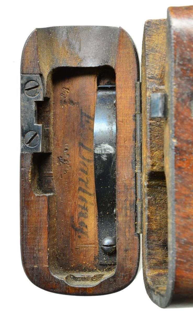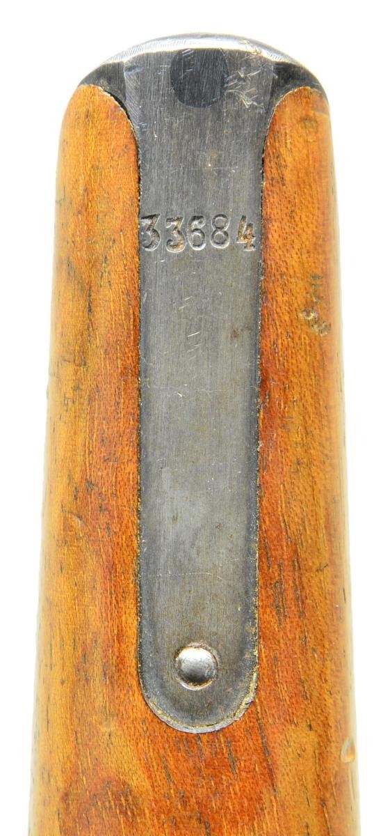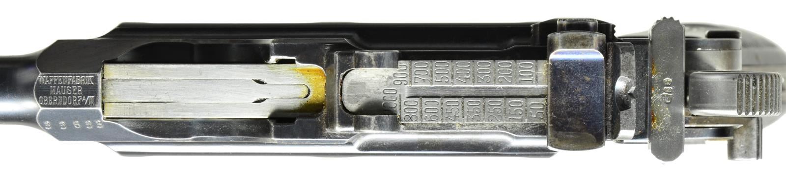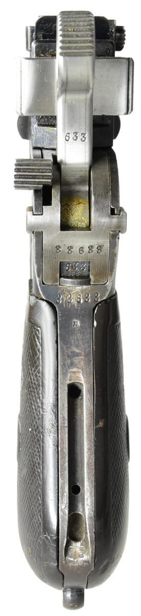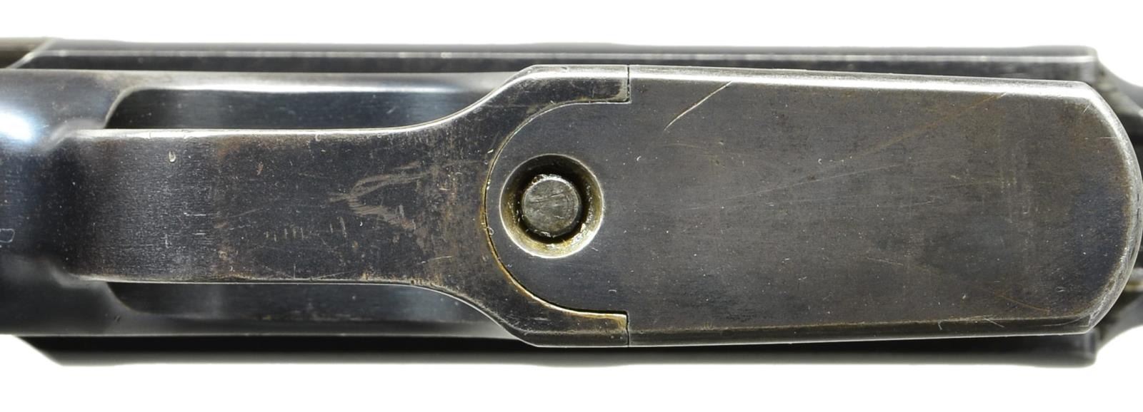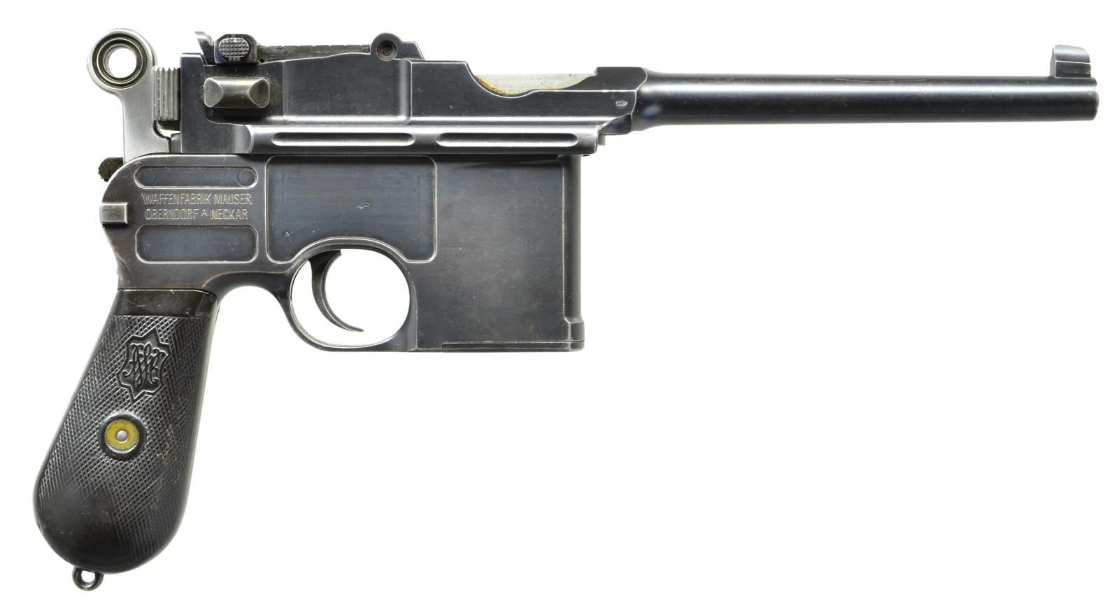 STOCK. Cal. 7.63mm. S# 33633. Mauser made relatively few Shallow Milled lg. ring hammer pistols, generally found in the 31xxx-33xxx S# range, this example falling in the latter part of that series. It has a 5.5" bbl. w/ fixed front sight & slip-in rear sight graduated 50-1000. Long extractor, single lug firing pin & early safety. Usual Mauser address on chamber. Full S# on left chamber flat. Left side of bbl. extension marked Crown/"C"/"U"; antler proof on right side. The center panel on the left side of the frame is VL&D import marked. The Mauser 2-line address is on the right side of the frame. Fitted w/ hard rubber grips, each panel molded w/intertwined "M/W" in the upper portion surrounded by a checkered field. Lanyard ring absent. Disassembly shows full S# or last few digits on all the usual parts including firing pin & locking block. Grips are unnumbered, though the right panel is inscribed w/ date "3/13/11". UNATTACHED ACCESSORIES: accompanied by a closely numbered shoulder stock numbered "33684". Lid correctly notched for lg. ring hammer and internally inked "E. Darling" CONDITION: approx 95-97% bright original rust blue w/ sharp edge wear in the usual locations, particularly in front of mag. well & discoloration of the front strap. Fire blued parts w/ commensurate fading, especially the extractor that now appears as an in-the-white part. Back of the bolt & entire hammer have been lightly polished. Grips w/ moderate blunting & handling marks, especially the lower portion of the right panel where the checkering has smoothed to be indiscernible. Mirror bright bore. Perfect manual mechanics. Near excellent shoulder stock w/ only minor handling marks. Hinge and lug w/ some fading but no suggestion of enhancement. A desirable C96 made in a narrow S# range, this example w/ hard rubber grips & a closely numbered, near excellent, stock. (22-3097/LMA). CURIO. $4,000-6,000.