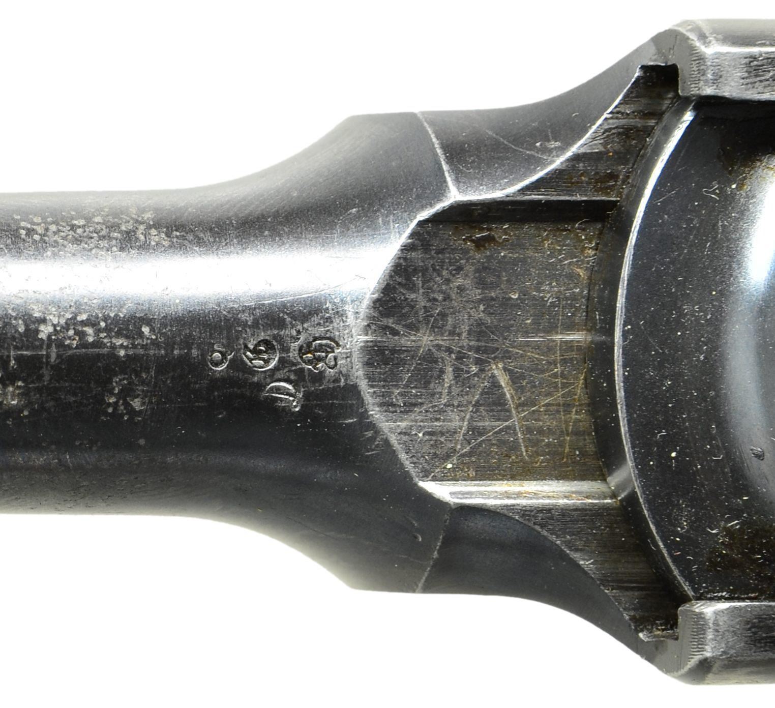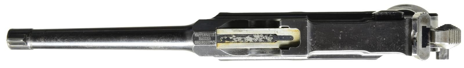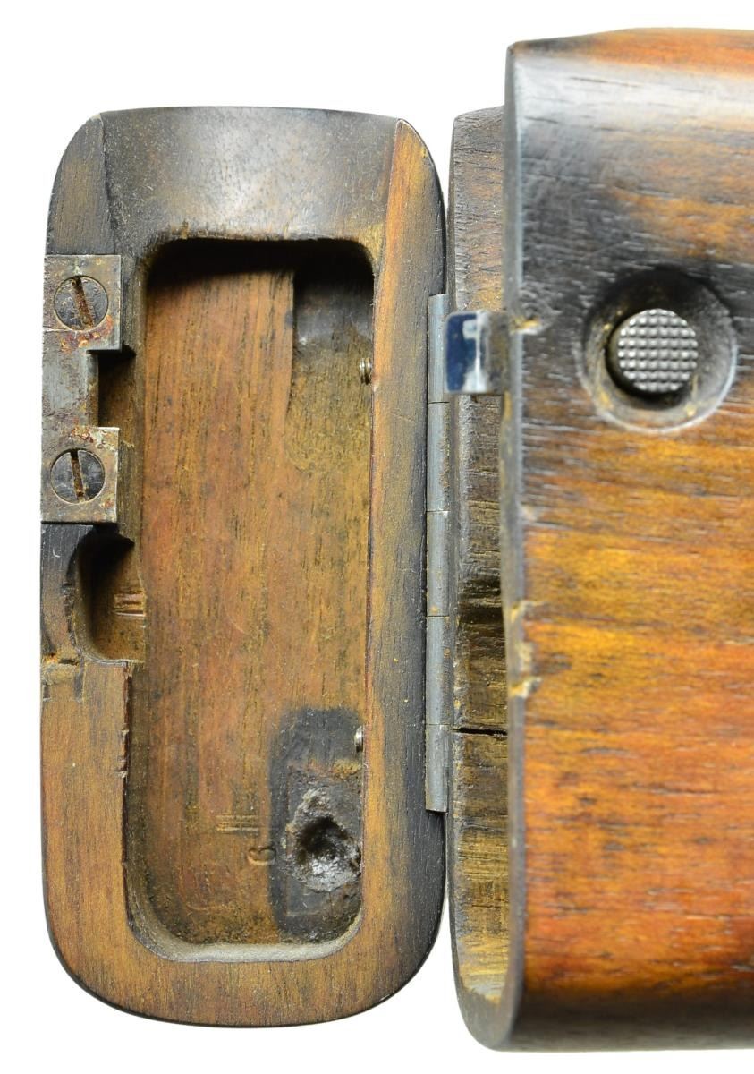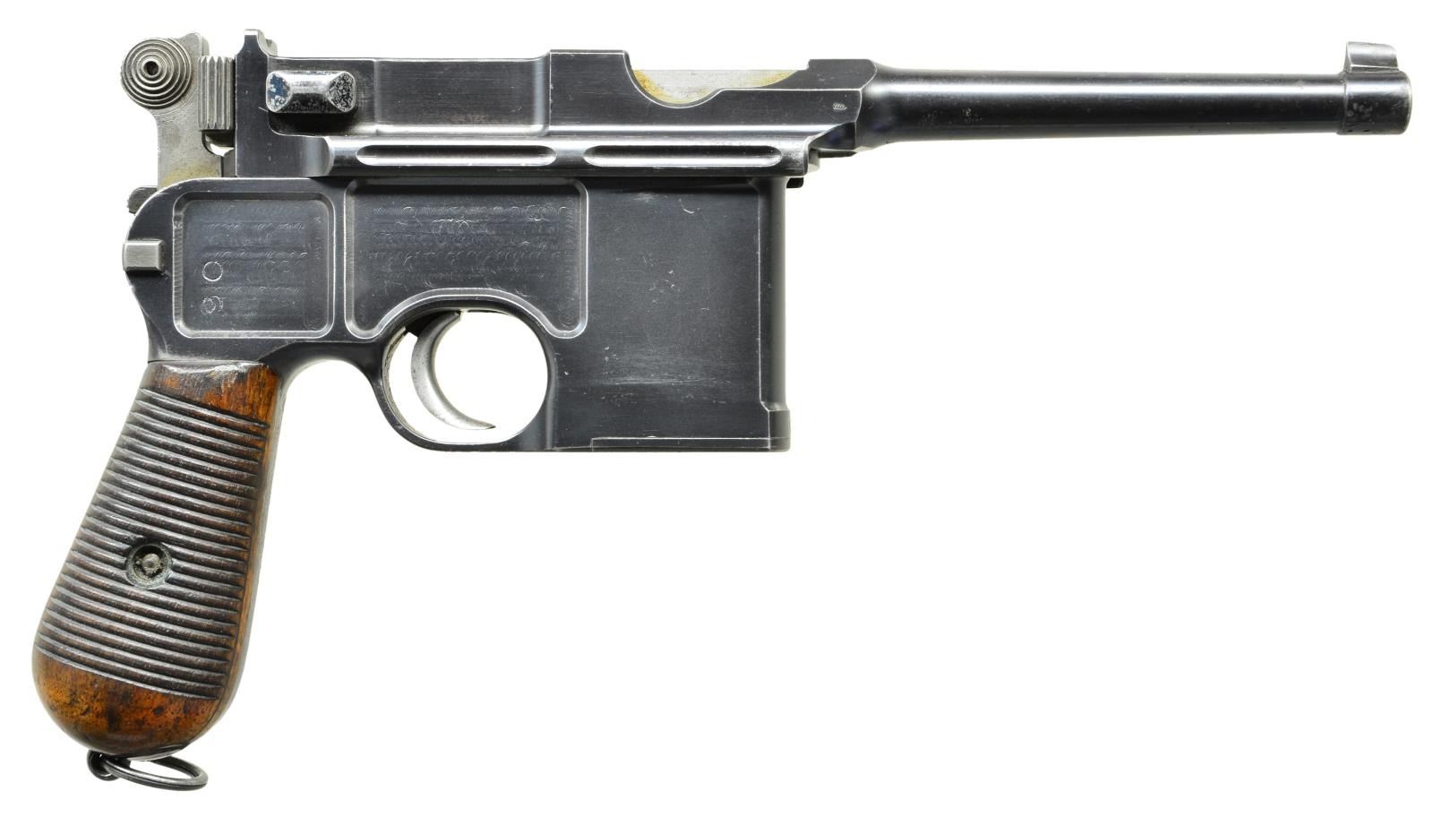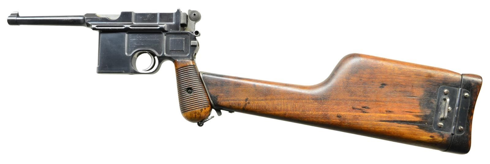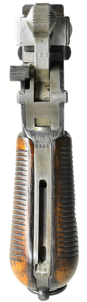 WITH STOCK. Cal. 7.63mm. S# 9205. Standard mid production fixed sight Conehammer w/ 4.75" bbl. long extractor, independently secured firing pin, early safety. Top of chamber w/ usual 3-line address, Crown/"C"/"U" on left side of bbl. extension; antler proof on right side. Major components rust blued w/ usual fire blued sm. parts. The bolt, hammer & trigger assembly in-the-white. Serrated walnut grips. Original lanyard ring present. Disassembly shows all parts, including the grips, factory matched to S# "9205". UNATTACHED ACCESSORIES: complete w/ Conehammer shoulder stock # "9440". CONDITION: approx 90-95% original blue w/ moderate spotting / etching under bbl. & numerous dings in front of mag. housing. Usual thinning & frosting on front strap. Fire blued parts w/ spotting & fading to approx. 60% w/ no suggestion of enhancement. Dark oil stained grips w/ scattered handling marks. Dull bore w/ easily discernable rifling. Perfect manual mechanics. Shoulder stock stripped of finish w/ oil staining around all fixtures, hairline crack in back, and cleaned lug w/ moderate oxidative etching & discoloration. (01-23459/LMA). ANTIQUE. $3,500-5,500.