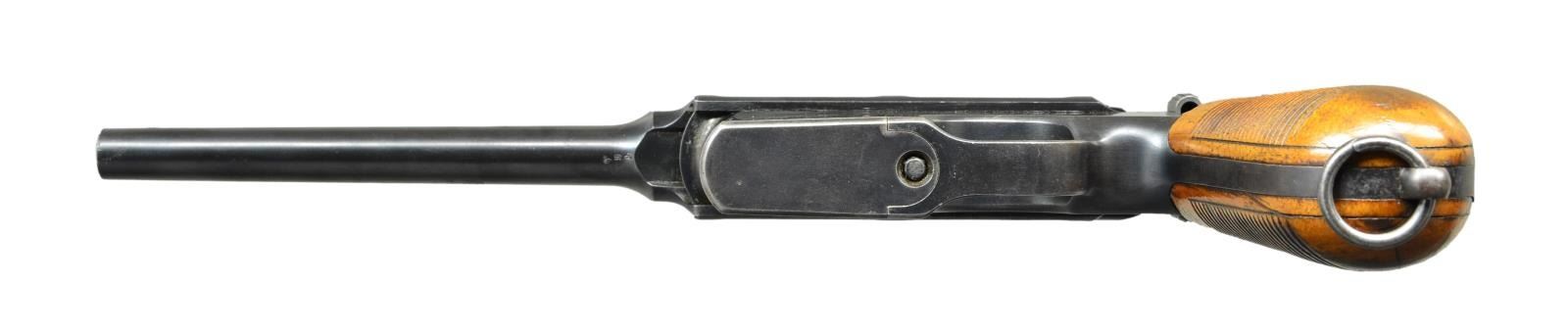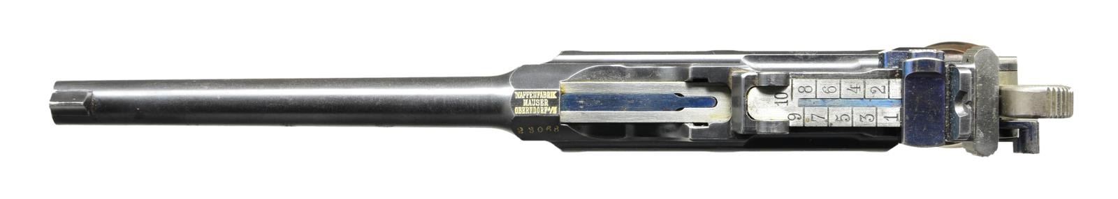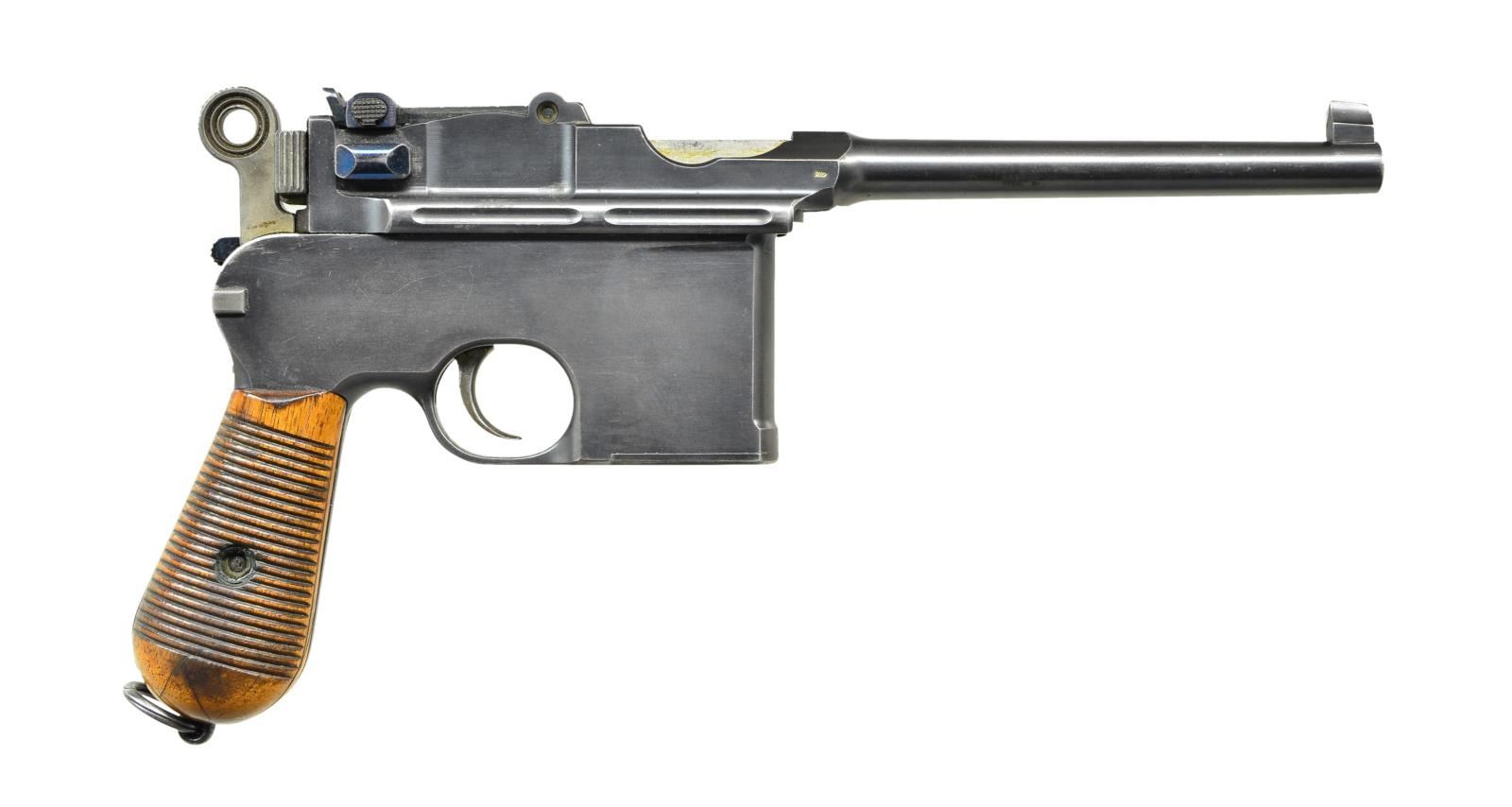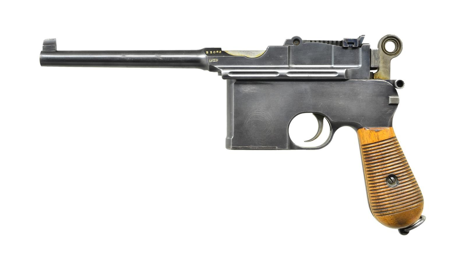 1-10 REAR SIGHT. Cal. 7.63mm. S# 23068. This relatively early production Flatside, range from 20,000-30,000, has a 5.5" bbl. having a fixed front sight & slip-in rear sight graduated from 1-10. Long extractor, single lug firing pin, early safety, lg. ring hammer. Usual Mauser address on top of chamber. Full S# on left chamber flat. Crown/"C"/"U" on left side of bbl. extension; antler proof on right side. Complete disassembly shows full S# or last 3 digits repeated on all the usual parts including the firing pin, locking lug & each of the serrated walnut grips. Original lanyard ring present. CONDITION: approx 90+% original rust blue. A few sm. oxidated patches on bbl. & w/ light etching on either side of frame. Usual thinning on front of mag. well & front strap. Comparable condition fire blue & strawed sm. parts, showing no evidence of enhancement. Grips w/ most of their original varnish, some oil darkening, particularly on the right panel, w/ light handling marks. Mirror bright bore. Perfect manual mechanics. One of the more unusual Flatsides in having a 1-10 slip-in (rather than pinned) rear sight, nice w/ all matching S#s & near mirror bore. (22-3146/LMA). CURIO. $2,500-4,500.
