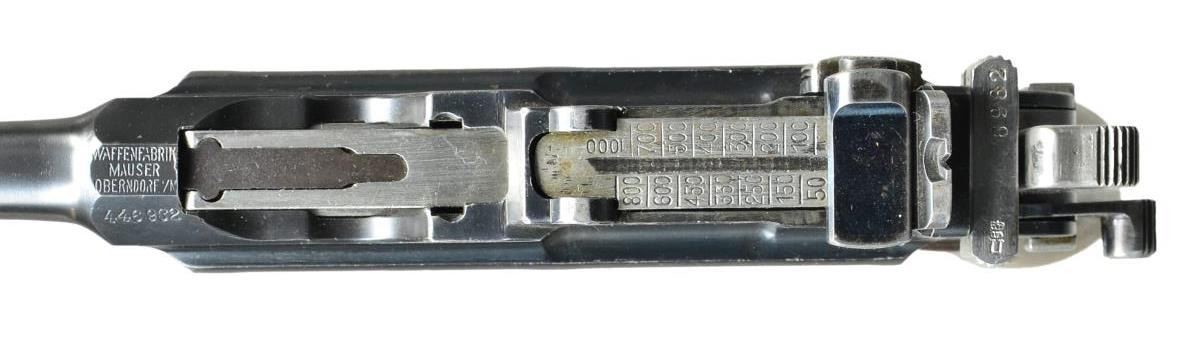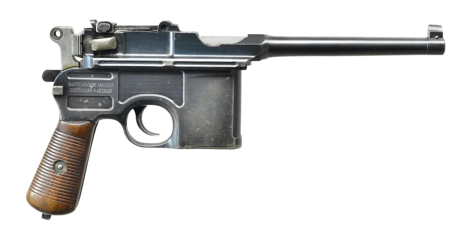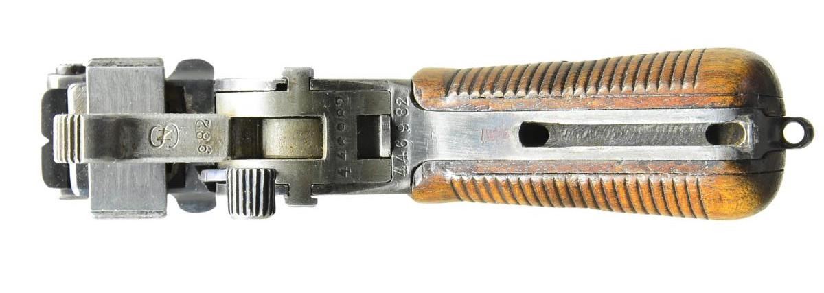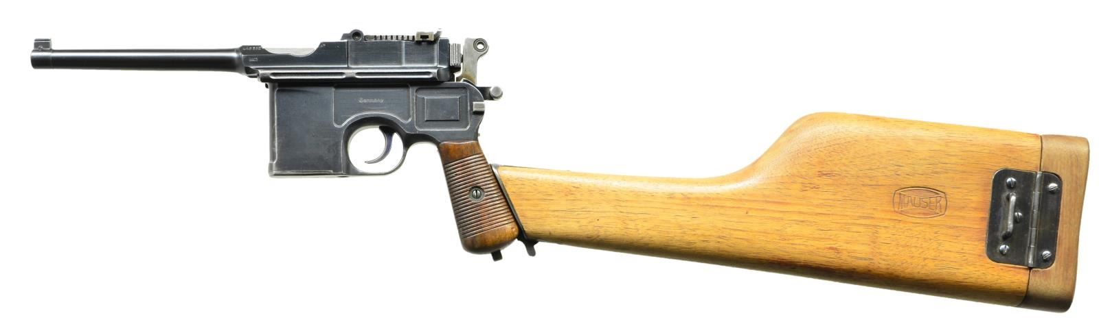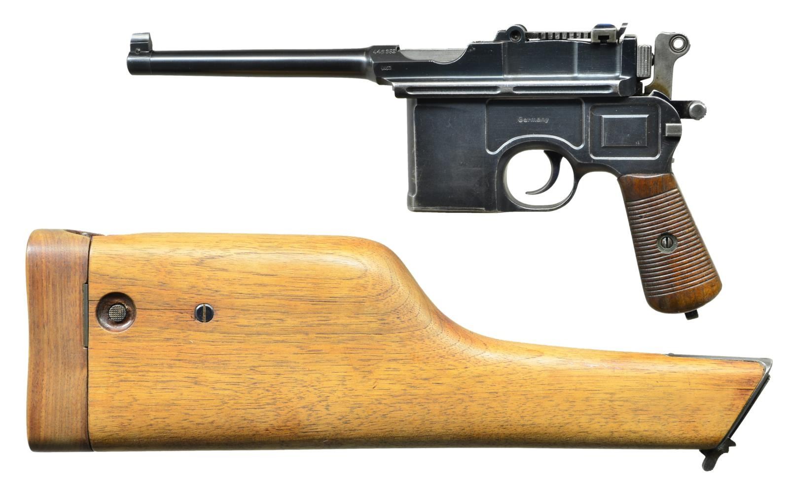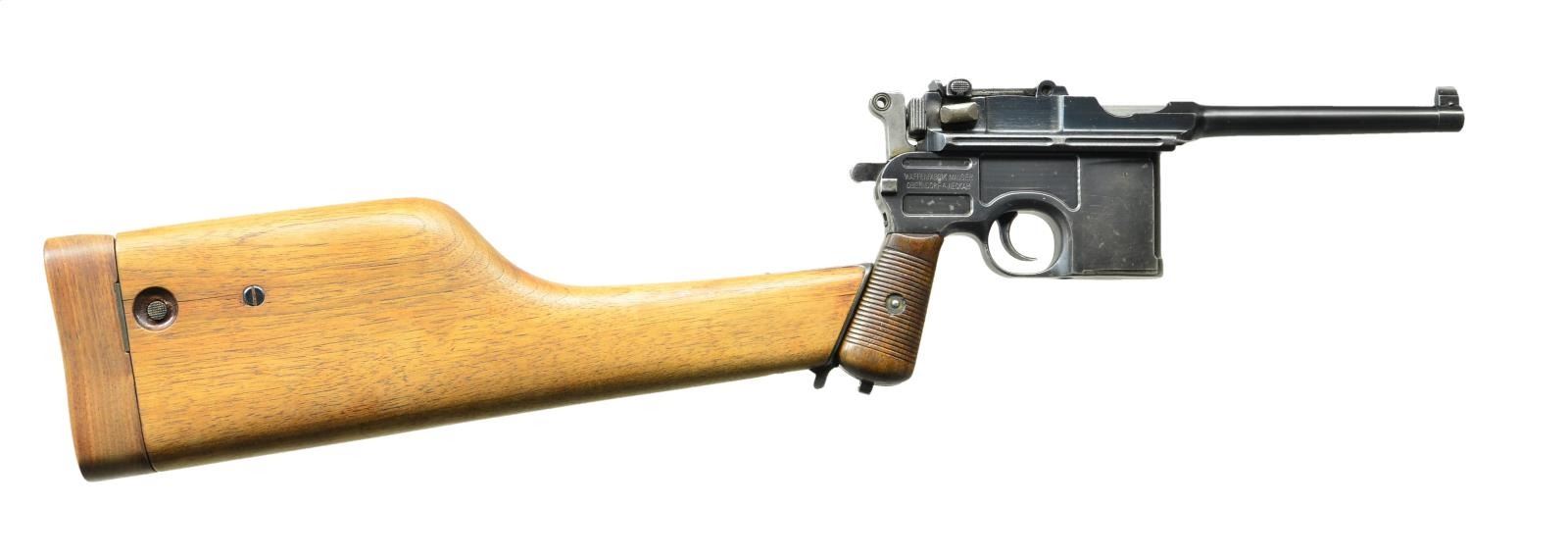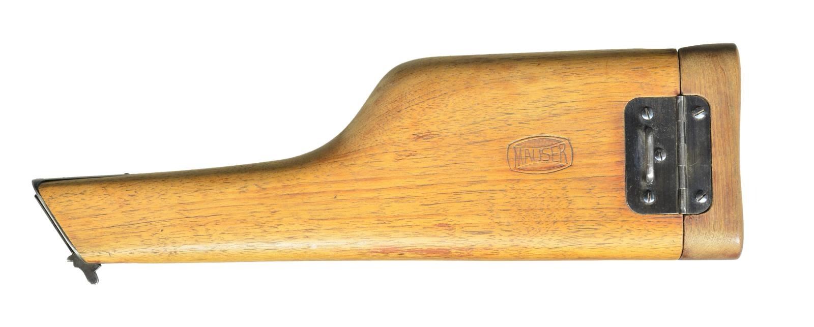 Cal. 7.63mm S# 446982. This is a Mauser C96 as made shortly after WWI as the factory converted its short bbl. Bolos to pistols w/ a longer bbl, hiding the juncture w/ hash marks, found in the 445,000-448,000 S# range, this pistol having had those hash marks removed. Now w/ a 5.5" bbl, a pinned front sight mounted on a bbl band & a 50-1000 graded rear sight. Short extractor, 2-lug firing pin & small ring hammer. Usual Mauser address on chamber w/ full S# on left chamber flat, Crown /"C" /"U" on left side of bbl. extension, "GERMANY" marked on left mid-frame panel as customarily applied to exported pistols. Right frame w/ 2-line Mauser address. Bolo wood grips. Lanyard ring absent. Disassembly shows all matching numbers except for an unnumbered follower (correct) & unnumbered grips (previous numbers having been removed). UNATTACHED ACCESSORIES: accompanied by a later production "Mauser" banner stock, lug numbered "747". CONDITION: VG-Excellent as partially restored, the restoration limited to the bbl./bbl. extension assembly & the extractor. Balance of pistol retains 92-95% rust blue, the sm. parts having comparable fire blue. Near excellent grips w/ oil staining & a scattering of dings. Stock & hinge have been refinished, the stock having a hairline crack through the lid release button, most of the fire blue on the lug having faded. Mirror bore. Perfect manual mechanics. (22-3102/LMA). CURIO. $2,500-3,500.