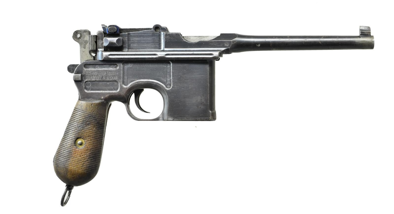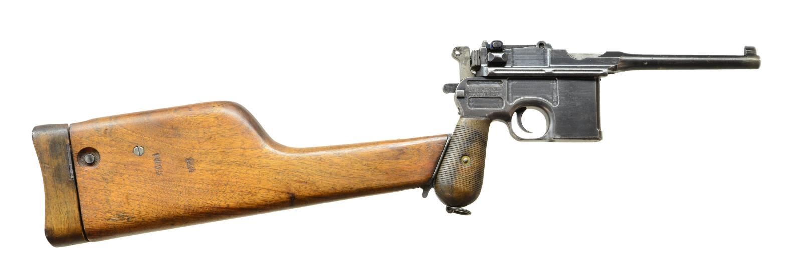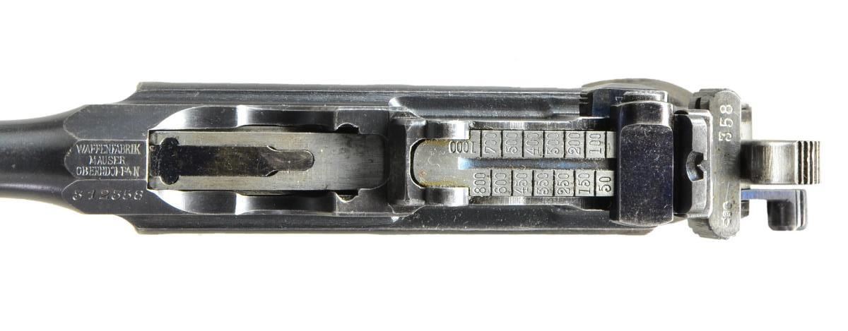 Cal. 7.63 Mauser (30 Mauser). S#: 312358 Bbl. 5 1/2" with inverted V sight plus 50-1000 tangent rear. Matching numbers on externally numbered parts plus floorplate and 33 grooved grips. Nitre blue on rear sight slide, bolt stop, firing pin, safety, trigger, extractor and grip screw. Various crown U proofs. Mauser legend on right side of frame and over chamber. Matching numbered receiver having lightening cuts on rails. New Safety small ring hammer. UNATTACHED ACCESSORIES: matching numbered iron on walnut stock that has on right side an unreadable number prefixed with "F" plus an unreadable date starting with "1". Left side forward of hinge has a faint crown proof. Stock components appear original w/ cleaned oxidation on iron. Very good hinge and hardware. Crack going through butt release area to latch attachment screw. Hinged buttplate appears replacement due to fitment and color. Proper attachment to pistol with slight play. CONDITION: good to very good appearance as refinished over remaining areas of light pitting. Significant pitting on sides of frame under grips. Good hand worn grips with small chip on left near bottom. Good to very good bore with light wear and hint of frosting. (22-4459/NW). CURIO. $1,800-2,500.