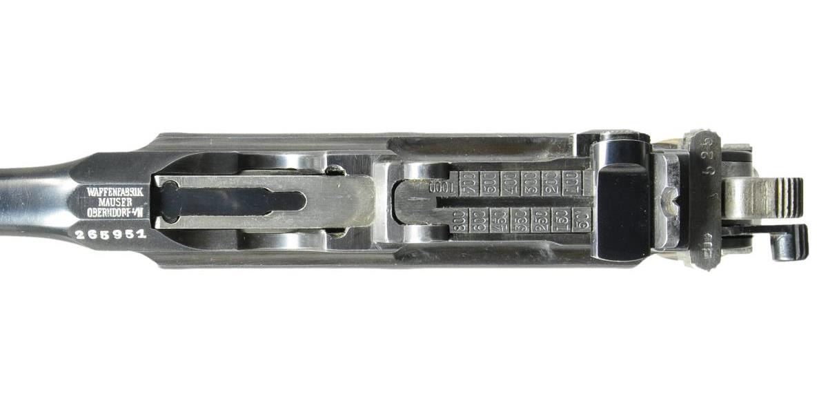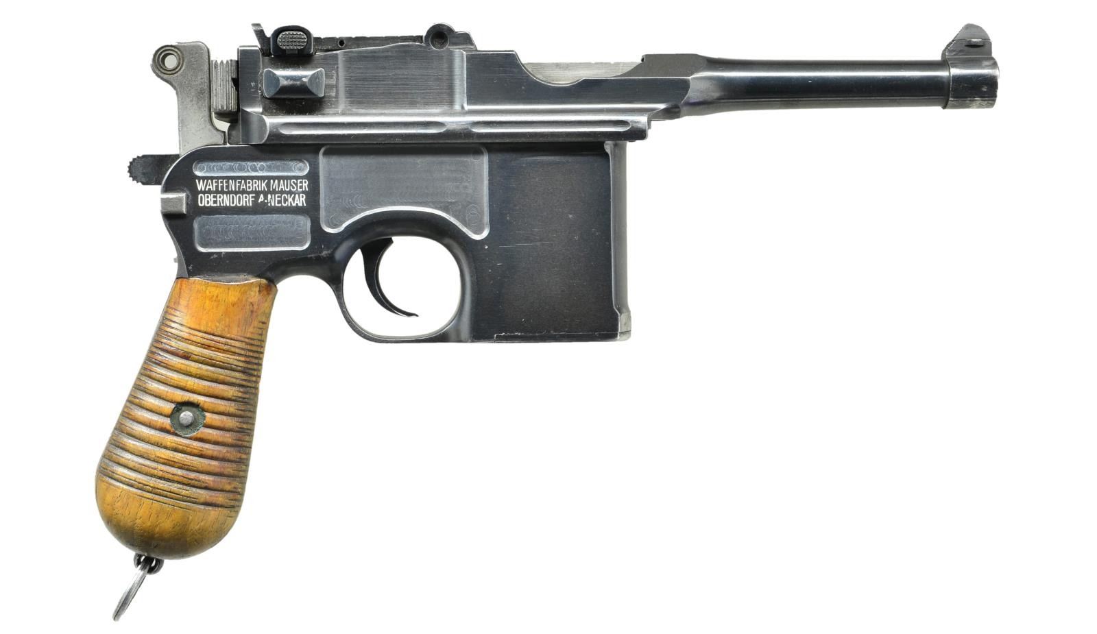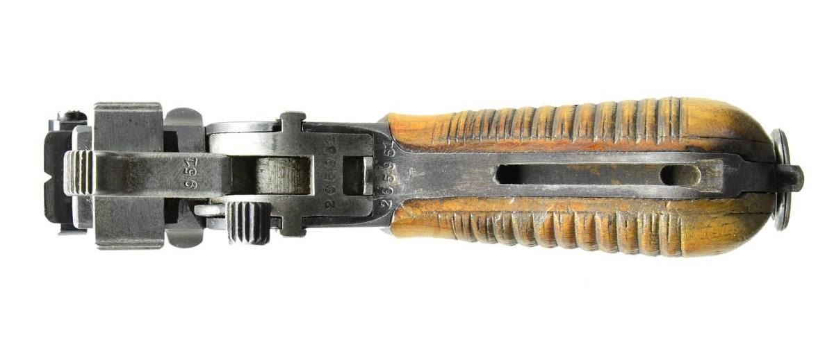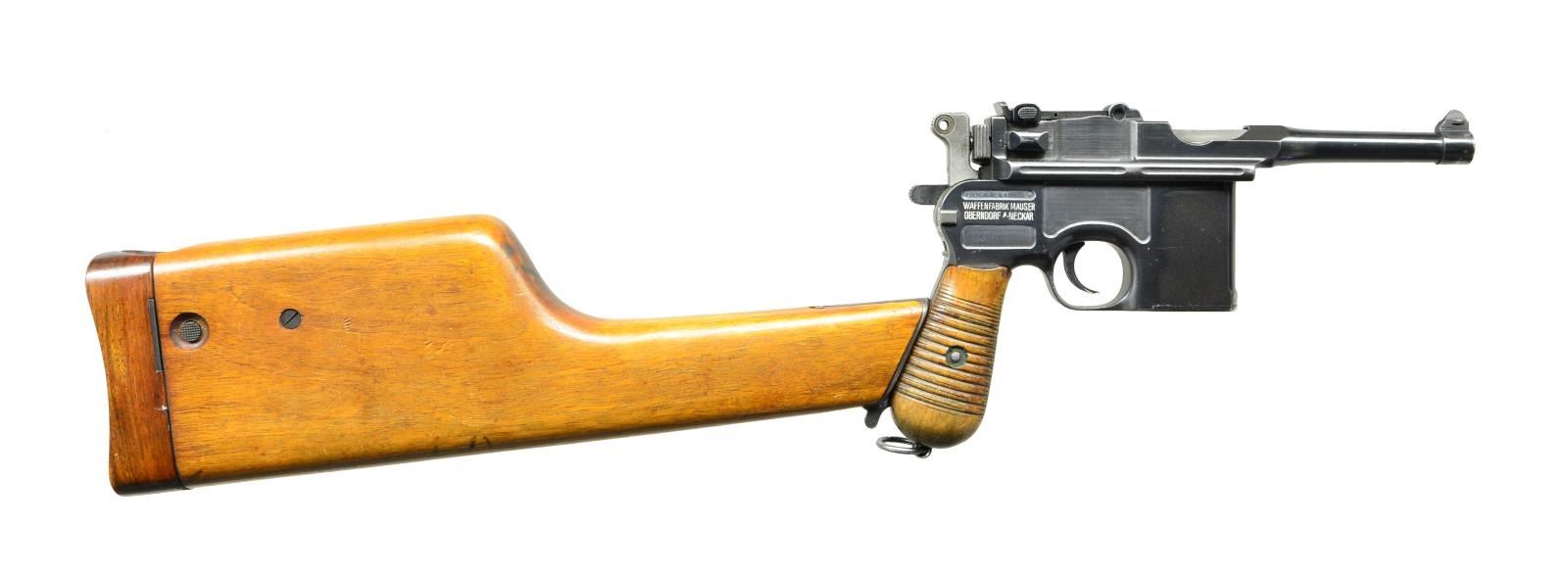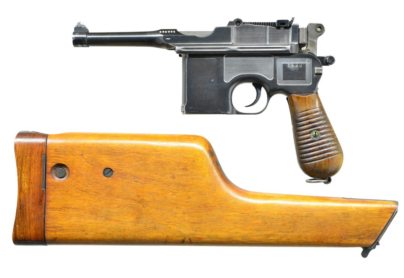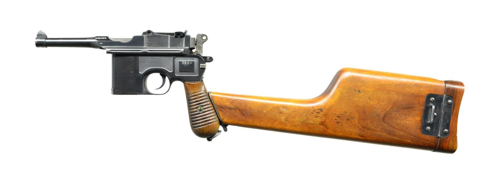 Cal. 7.63 Mauser (30 Mauser). S# 265951. Bbl. 3.9" with serrated faced fin shaped sight; 50-1000 tangent rear. Mfg. 1920 as indicated by applied date on left rear frame panel. Matching numbers on floorplate, hammer, receiver and lock housing. 12 groove grips numbered 014 on left and 011 on right. Bolt numbered 525 and bolt stop numbered 018. Crown U proofs, lightening cuts on frame rails plus Mauser legend on right side of frame and over chamber. UNATTACHED ACCESSORIES: very good unmarked stock w/ iron 130. CONDITION: very good as refinished w/ a few slight prior pits remaining. All parts salt blued; no Nitre bluing. Very good grips. Good bore w/ light wear & even light pitting. (22-3071/NW). CURIO. $1,200-1,800.