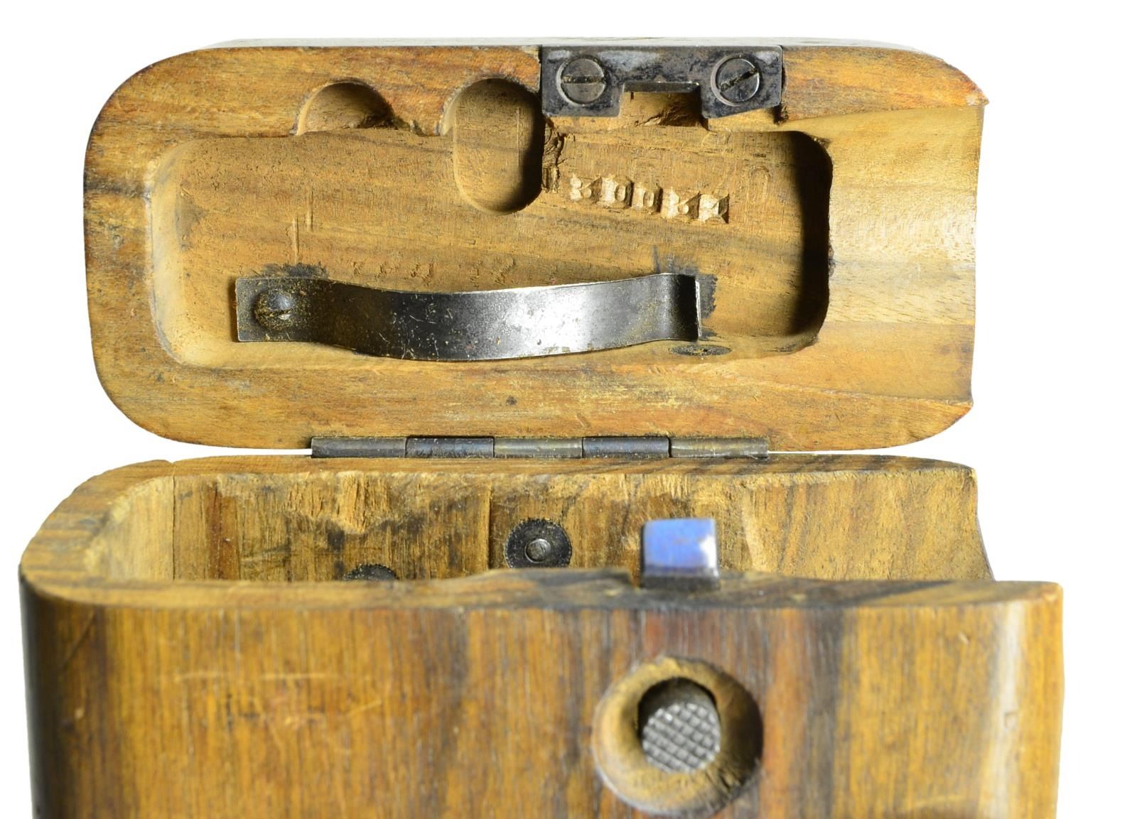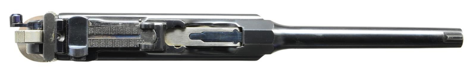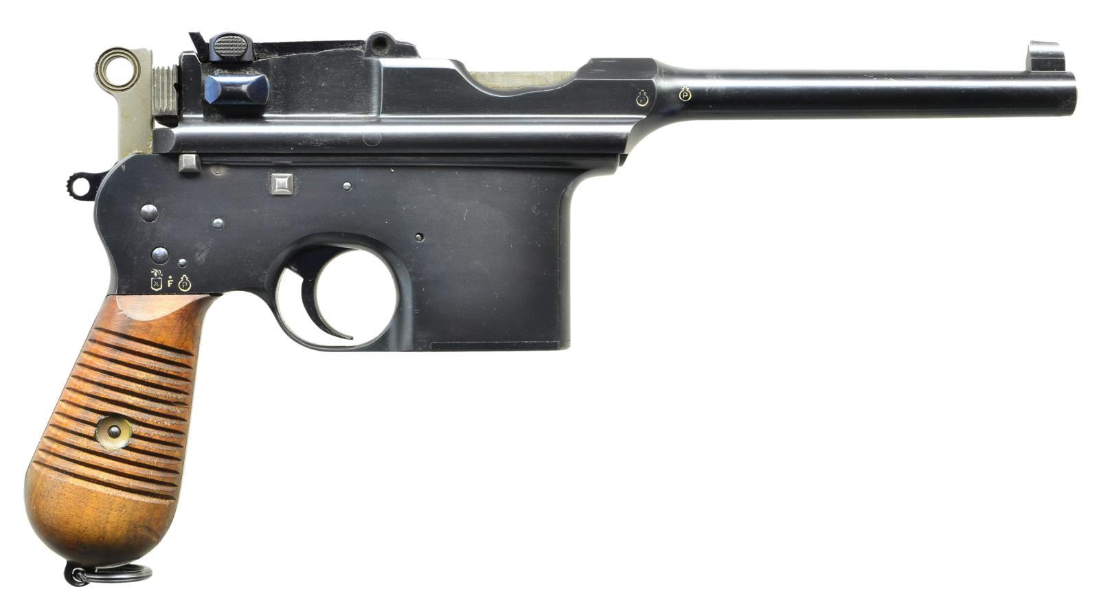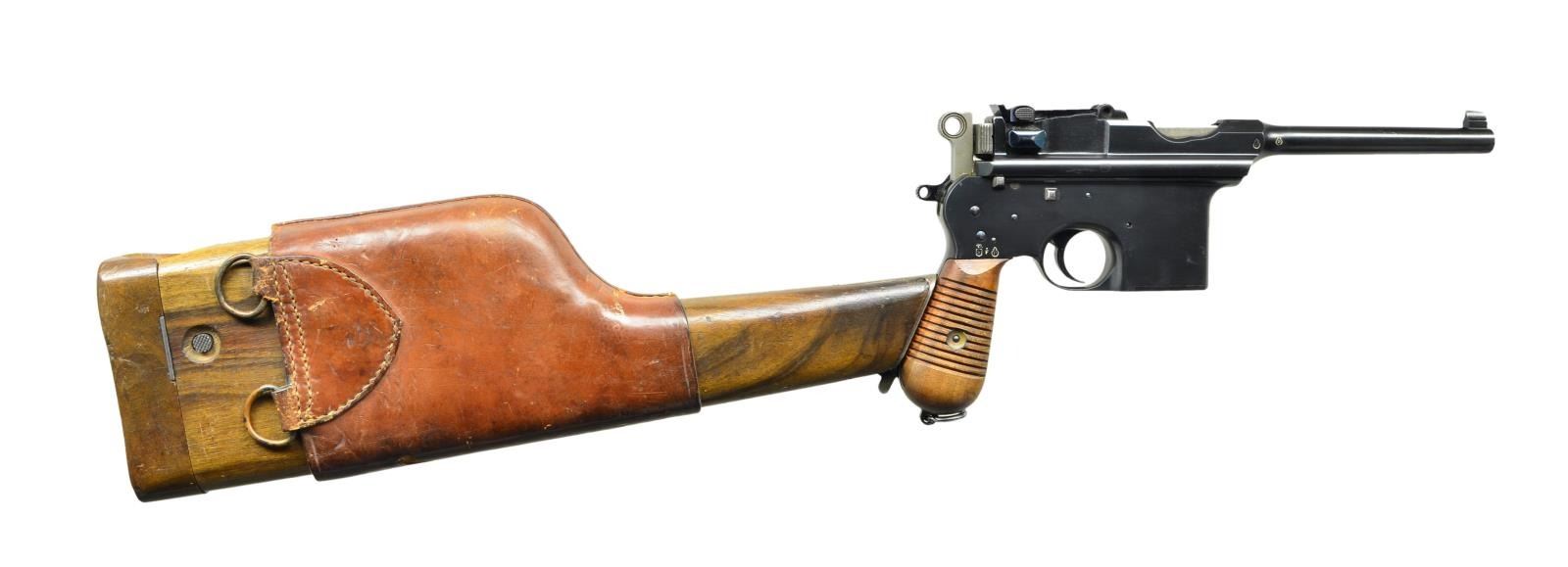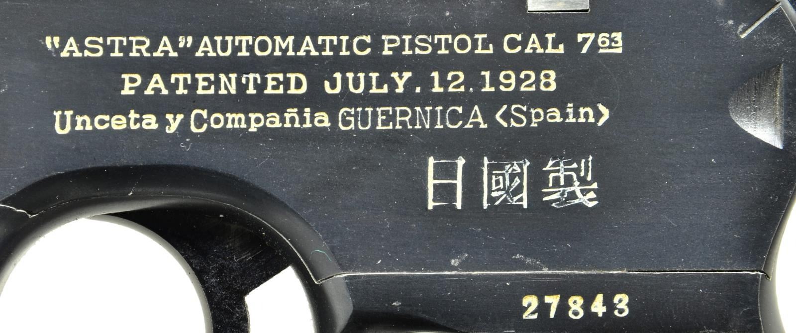 CHARACTERS, WITH STOCK. Cal. 7.63mm. S# 27843. Wonderful example of a late production Astra 900, 1 of approx 1,000 pistols that were made w/ Chinese characters that translate "MADE IN SPAIN" on the sideplate. As true for all these guns, it has a 5.5" bbl w/ fixed front sight & slip-in rear sight graduated 50-1000. Short extractor, 2 lug firing pin, standard safety & late production hammer. Sideplate has the usual 3 line address referencing the Astra pistol patent date in 1928 & its location in Guernica, Spain. Beneath this address are the 3 Chinese character. On the left side of the frame is the full S#. The right side of the pistol has the automatic pistol proof on the bbl., bbl. extension & frame, the latter accompanied by the Eibar house proof & the year code "F" (1933). Fitted w/ broadly serrated walnut grips, both matched to the pistol. Lanyard ring present. Further disassembly was not effected. UNATTACHED ACCESSORIES: accompanied by an Astra shoulder stock w/ a longer neck as mfg for a Model 903 or F. Lug numbered "30270"; the number inside the lid restamped to "30034". Unmarked Chinese carrier w/ two D rings at back. CONDITION: pistol retains 99%+ original blue. Comparable condition fire blue parts w/ the most minimal wear on bolt stop & trigger. Grips show a few scattered handling marks. Bright bore w/ sharp rifling. Perfect manual mechanics. VG stock w/ oil discoloration & numerous handling marks. A crack at the bottom spine measuring 4" in length has been nail repaired. Most of the fire blue has faded from lug. Leather carrier w/broken retaining strap. A gorgeous gun, the stock and carrier an added “bonus.” (22-3149/LMA). CURIO. $3,500-5,500.