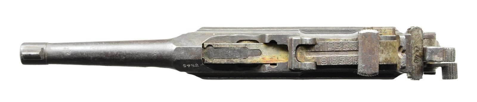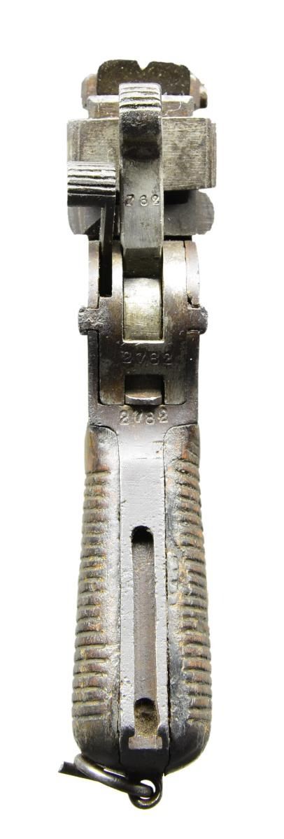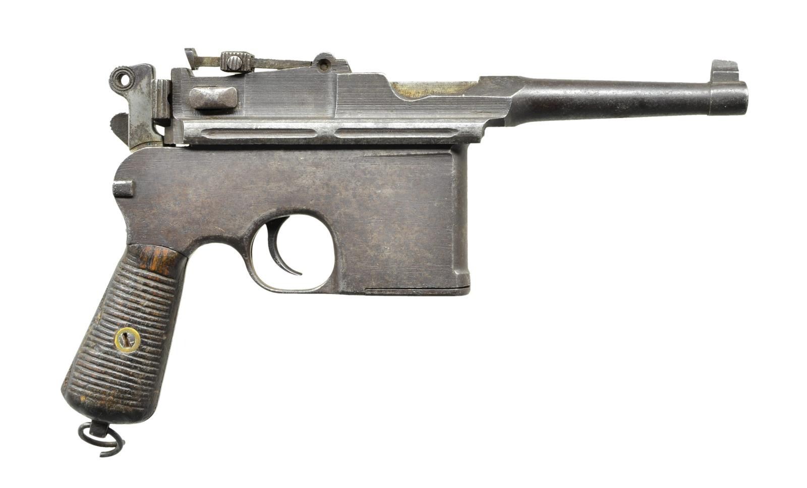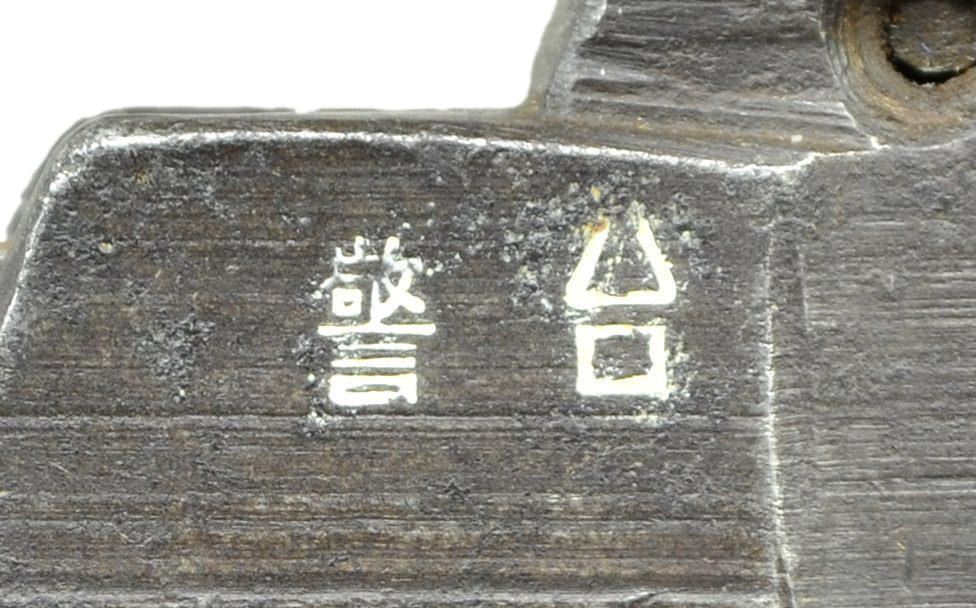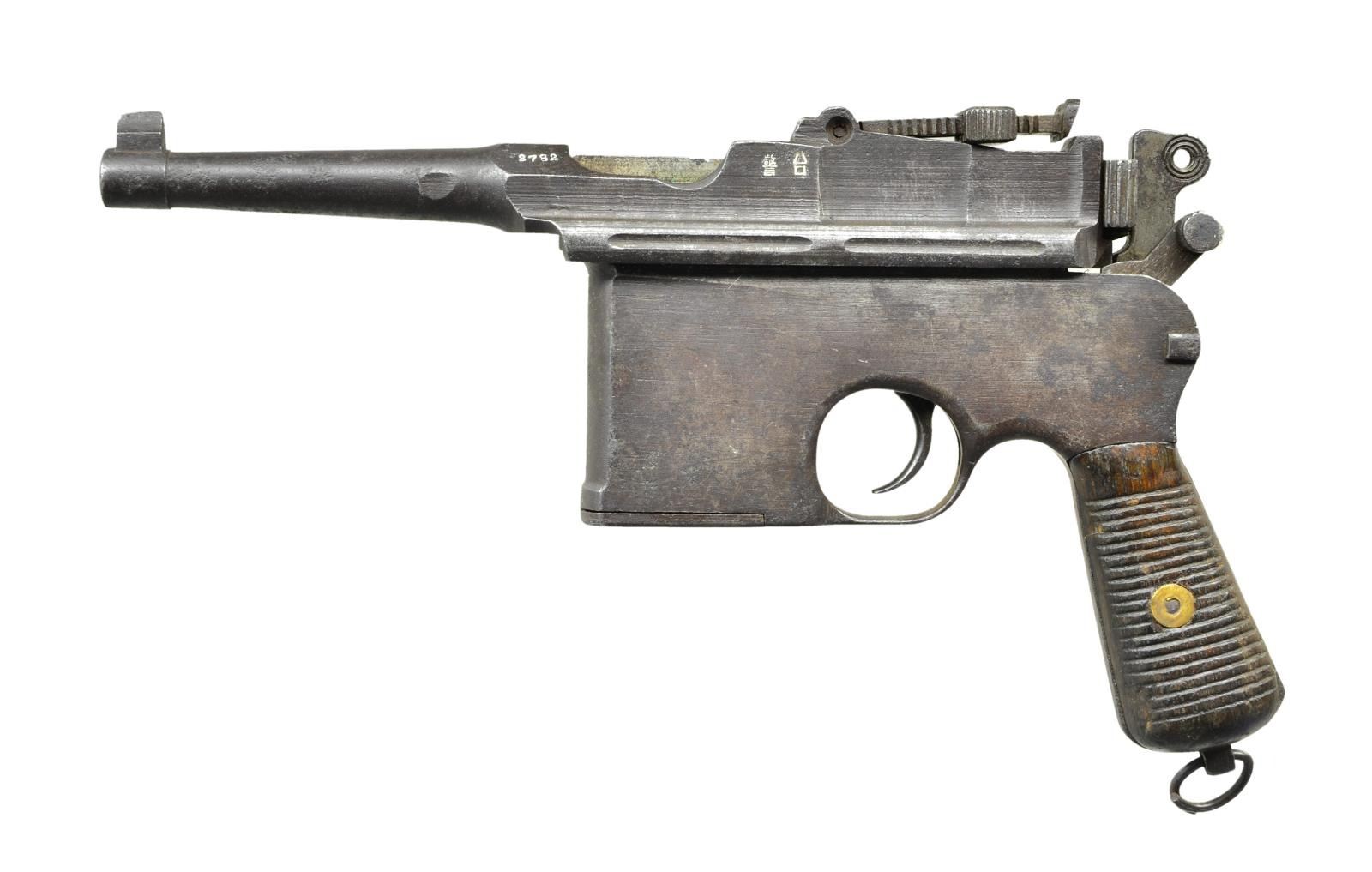 Cal. 7.63mm. S# 2782. The Chinese held the Mauser C96 in the highest esteem and made many unauthorized copies including this very roughly finished but all matching Flatside Bolo w/ 4" bbl. having a banded fixed front sight & a slip-in rear sight graduated from 50-1000. Short extractor & single lug firing pin. S# on left chamber flat. 2 Chinese characters on bbl. extension translate "Police Station". Frame is unmarked except S# on backstrap & an "Interarms" import stamp just behind trigger guard. Serrated wood grips. Lanyard ring present. Disassembly shows all matching numbers on the marked parts, many of which were hand made. Grip screw, fixed to escutcheons, prevented removal of grips. CONDITION: generally a gray / brown gun w/ virtually all finish having faded. The same consideration applies to the sm. parts. Grips oil soaked & worn, the right panel having a sm. split. Escutcheons move freely within grip when trying to remove screw. Dull bore w/ easily discernable rifling. Perfect manual mechanics. (22-3075/LMA). CURIO. $1,200-1,800.