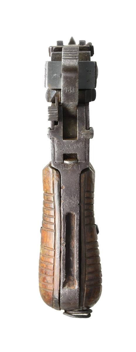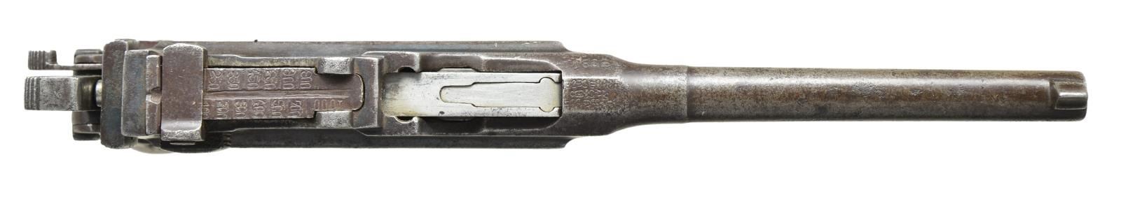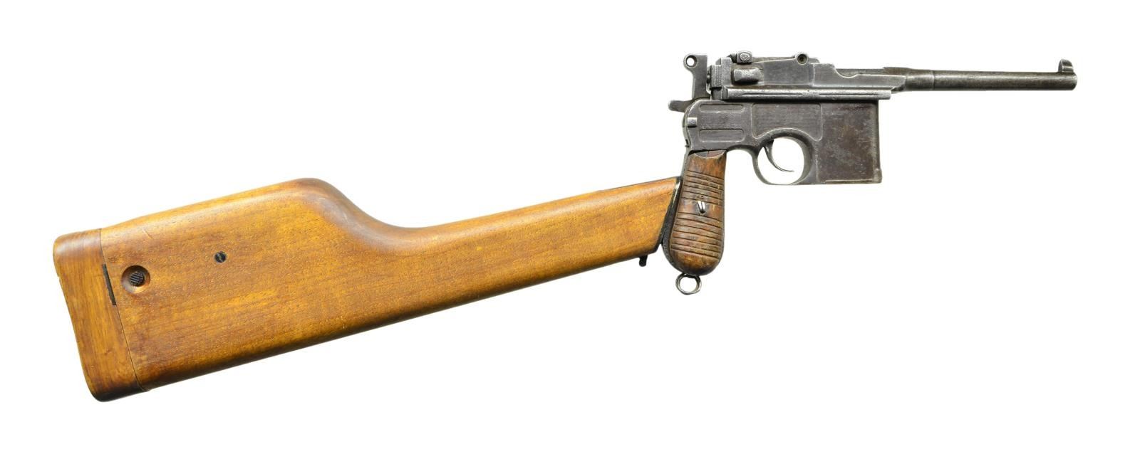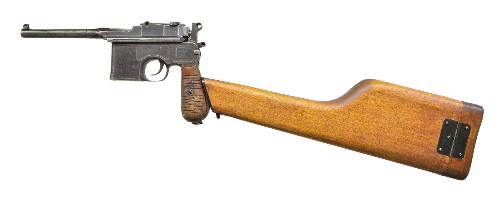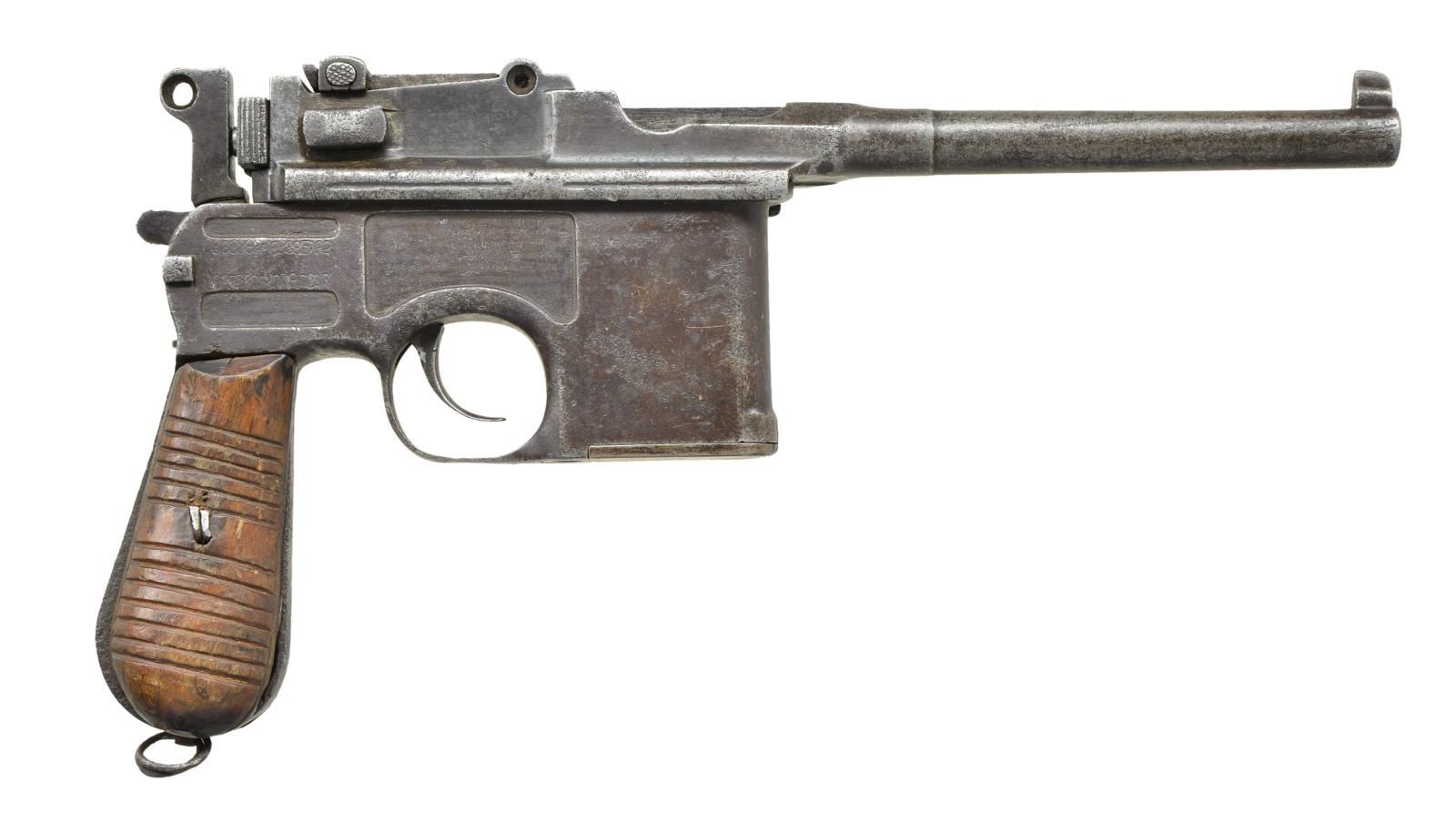 Cal. 7.63mm. S# 58301. The Chinese held the Mauser C96 in the highest esteem and made many unauthorized copies, most w/out manufacturer identification, as per this example. The pistol resembles a full size Late 1930 Commercial C96 in having a stepped bbl. reinforcement forward of chamber & a lg. Mauser banner logo on the left frame. As true for the Mauser, it has a 5.5" bbl. w/ a fixed front sight & a slip-in rear sight graduated from 50-1000. Short extractor, 2 lug firing pin (w/ 3 recessed holes in bolt), safety & hammer reminiscent of a Prewar Commercial. Nonsense lettering on top of chamber. Full S# repeated on left chamber flat & left side of bbl. extension. Lg. Mauser banner on left side of frame. Nonsense characters on right side of frame. Crudely mfg. serrated grips secured w/ a single bent staple similar to a cotter pin. Lanyard ring present. Follower & floorplate unnumbered. No further disassembly was effected. UNATTACHED ACCESSORIES: unmarked shoulder stock of recent Chinese mfg. that does not fully engage pistol slot, needing adjustment. Lid closes nicely over enclosed pistol. CONDITION: this is a gray /brown gun, a condition that extends to all minor parts. Grips stained w/ numerous handling marks. Dark bore w/ easily discernible rifling. Action sticky, though manual function appears correct. Recent production stock is near new.(22-3174/LMA). CURIO. $750-1,500.