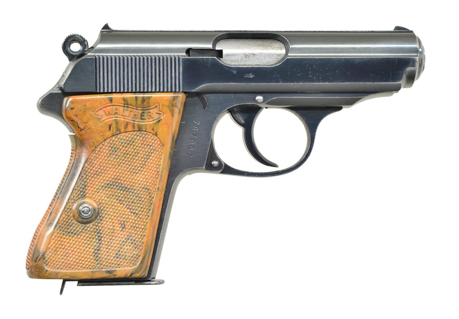 CAPTURE PAPERS. Cal. 7.65 mm (32 ACP). S# 787967. Bbl. 3 1/4" w/ crown "N" proof; also on slide. Mfg. 1933 (1930-1940) w/ mottled brown Walther banner 3 panel checkered grip. Matching numbered slide, push button mag. release & lanyard loop at butt. MAGS: 2 Walther banner only 7 rd. w/ flat push button bases; good to very good w/ some peppery oxidation mainly on floorplate & fair to good w/ light oxidation mainly on floorplate. UNATTACHED ACCESSORIES: 2 capture certificates w/ identical information yet clearly not copies; likely one for Army records & other for James A. Cooper (recipient of pistol) as authorized by Wechench Schuek (best interpretation of cursive signature) 1st Lieutenant (difficult cursive) in 409th Infantry Company H. Shoulder patch (like new, unused or current issue) of 409th along w/ internet history indicating 103rd Cactus Division, 2nd Infantry, Heavy Weapons of Company H. Printed material also indicates various training locations & summarization of ETO activity. CONDITION: very good overall appearance w/ very faint marks plus peppery oxidation on bottom edge of slide & portion of frame; left side forward of trigger pivot. Square on, grip appears very good w/ faint crack around grip screw on left about 11 o'clock. Noticeable separation at top & bottom to extent safety will not clear grip. Near excellent bore. (22-5996/NW). CURIO. $1,750-2,250.