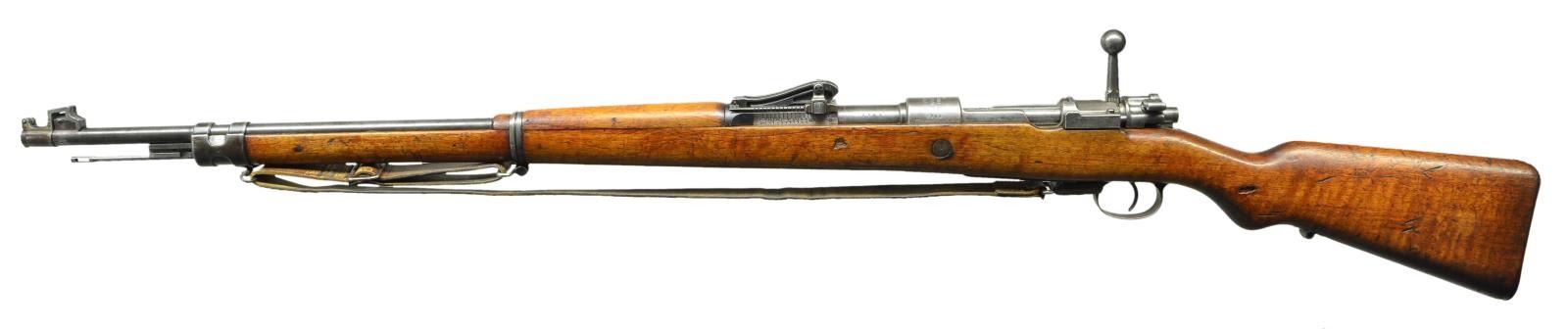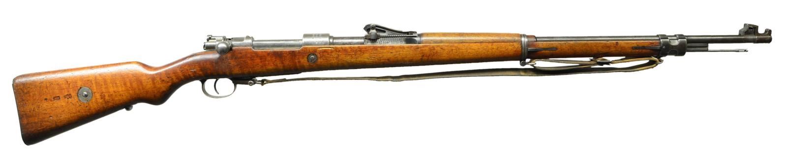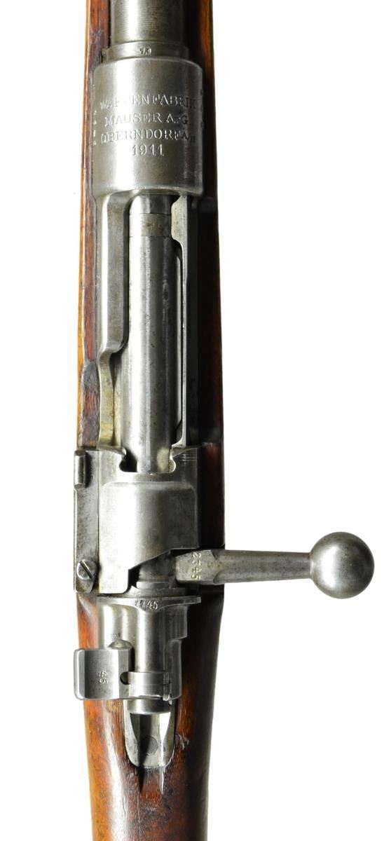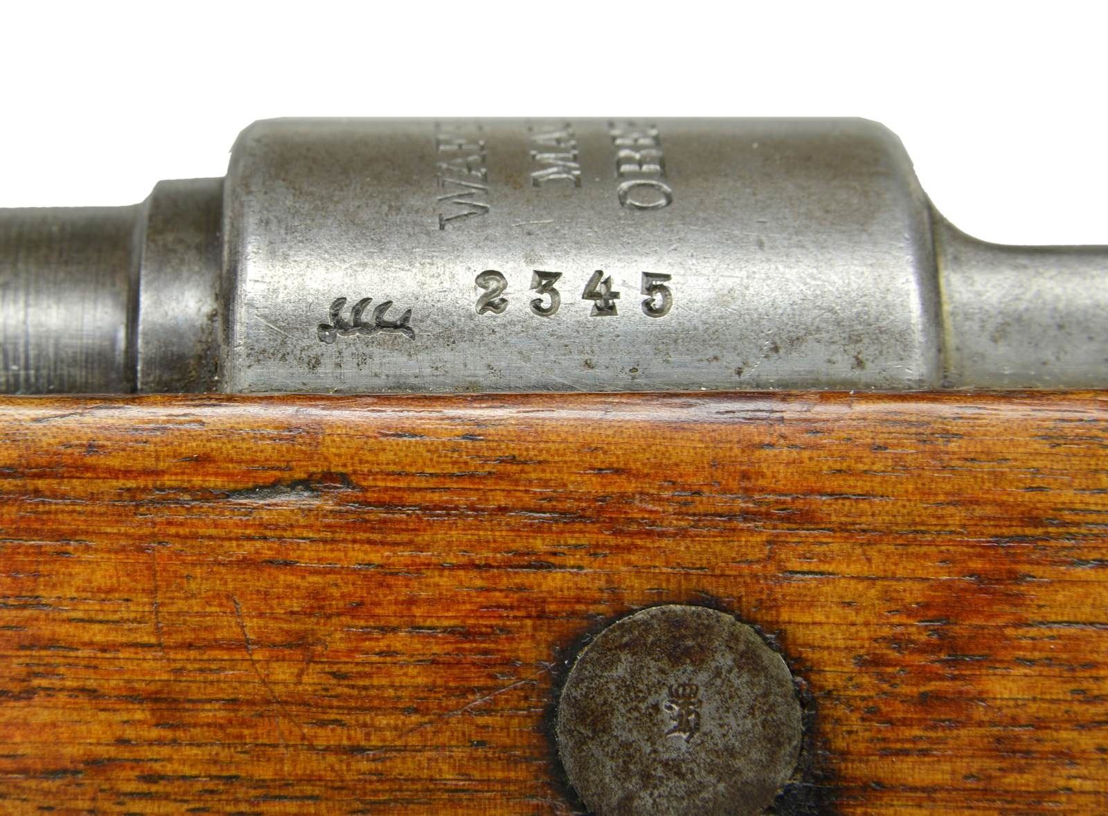 GERMAN WW1 GEWEHR 98 MAUSER BOLT ACTION MILITARY RIFLE. Cal. 8mm Mauser. S# 2345. All visible numbers match. Bbl 29 1/4". Lange rear sight graduated to 2000 meters. Inverted V front sight. Nice original matching example of WW1 Gewehr 98 infantry rifle dated “1911” w/ crisp markings & original sling. Receiver ring marked on top “WAFFENFABRIK”, “MAUSER A.-G.” & “OBERNDORF A/N”. Right side of receiver ring has Imperial German proofs. Receiver ring marked on left side w/ “WURTTEMBERG antlers”. Left receiver rail marked in Gothic “Gew. 98.”. Bbl. marked over chamber w/ “S”. All milled furniture. Cleaning rod is present. Walnut stock set. Buttstock w/ flat buttplate is marked on right side w/ 2 royal monograms & unmarked steel marking disk. Marked w/ crown markings at belly & under grip. Sling has original fittings. Non matching steel sight & muzzle protector w/ hinged cap. CONDITION: stock set has moderate wear, staining & handling marks commensurate w/ long & hard service. Notable dents in left side at grip & under rear sight w/ the expected loss of wood around the buttplate in the toe area. Metal has wear, turning overall gray & traces of original blue in protected areas w/ scattered spots of oxidation. Bore has fair worn lands, turning dark in grooves. PROVENANCE: From the Lifelong Collection of Glen E. Mattox. (23-99/RW). CURIO. $800-1,100.