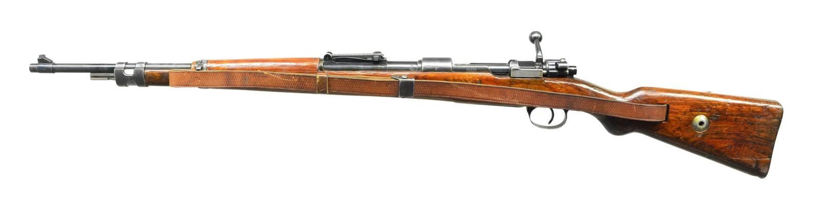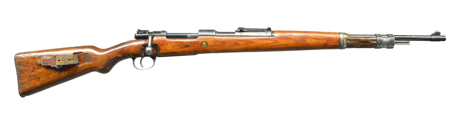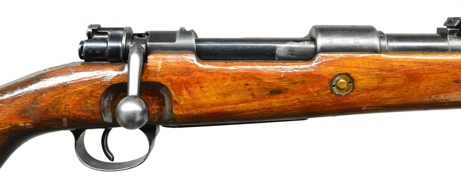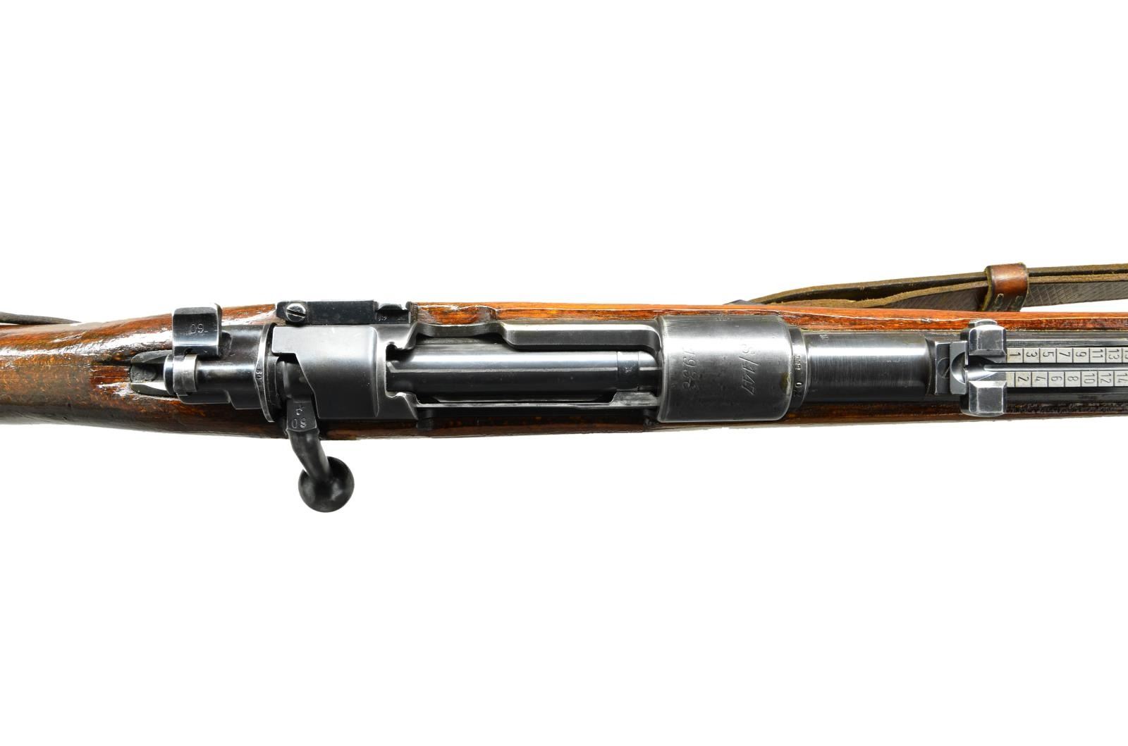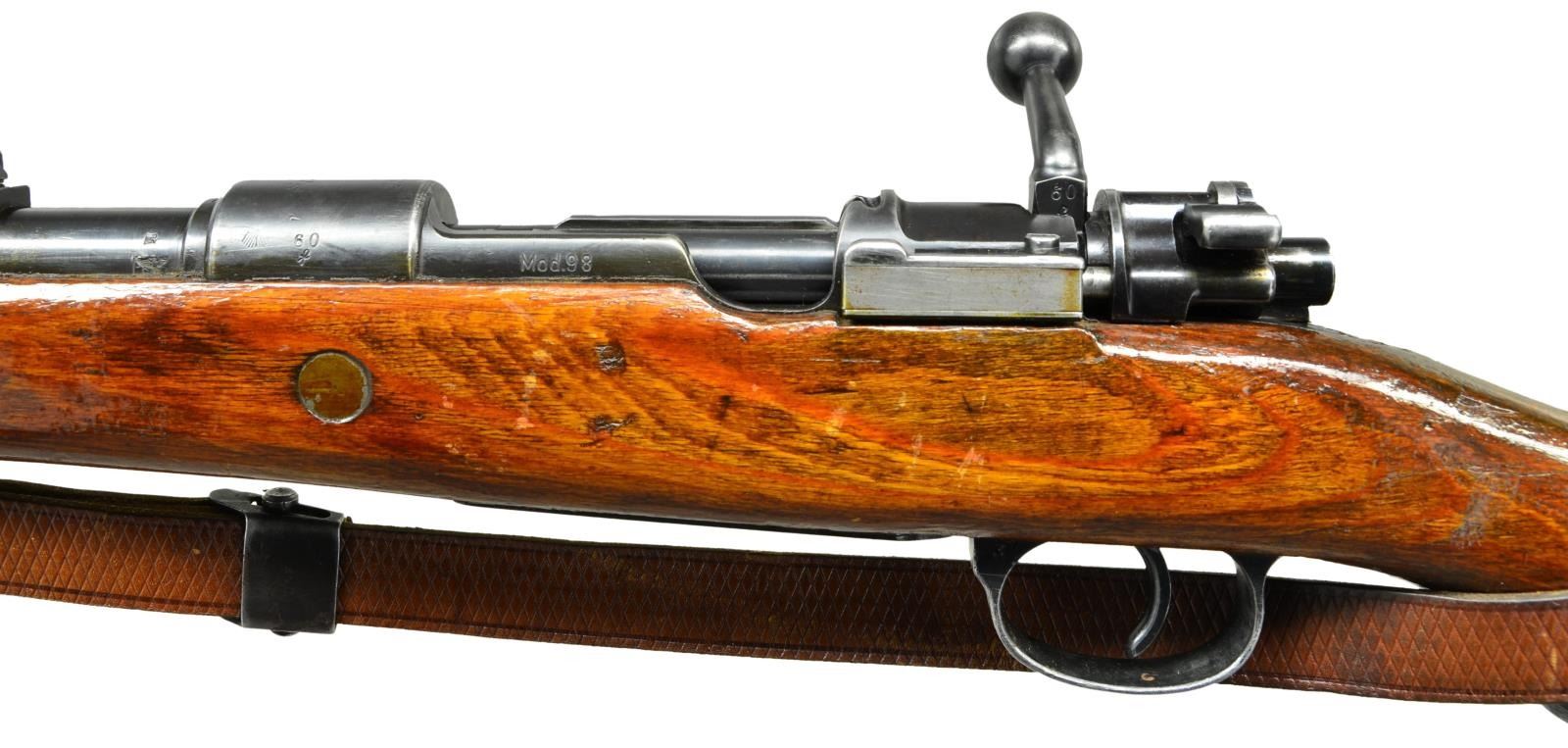 ACTION MILITARY RIFLE. Cal. 8mm Mauser. S# 60F. S#s match on receiver, bolt assembly, trigger guard assembly, buttstock, upper & lower bands, rear sight base, bolt stock & mag. follower. Bbl. 23 3/4". Tangent rear sight graduated to 2,000 meters. Inverted V front sight, base is cut for protective hood. Receiver ring is marked on top "S/147" & "1938" indicating production by J.P. Sauer. Receiver ring marked on left side w/ Weimar eagle proof; marked on right side w/ eagle 359 & 2 - Weimar eagle 214s. Left receiver rail marked "Mod. 98". Unnumbered replacement bbl. marked on left over chamber w/ eagle 26 & German eagle proof. Bands retained by single spring. Bayonet bar is present. Cleaning rod is not present. Laminated stock set w/ flat buttplate & steel disassembly disk. Buttstock markings have been obscured by heavy coating of gloss protective finish. Correct leather sling marked "L&F". CONDITION: stock set has added gloss finish over well worn finish w/ extensive handling marks. Extensive repaired crack around both sides of grip & several cracks extending from receiver tang to nose area. Sm. crack in front of trigger guard tang. Large repaired crack on both sides & toe. Moderate missing chip of wood around buttplate at toe. Metal retains approx. 40% original worn thinning blue w/ scattered scratches & handling marks. Very good shiny bore w/ sharp lands. (23-570/RW). CURIO. $500-800.