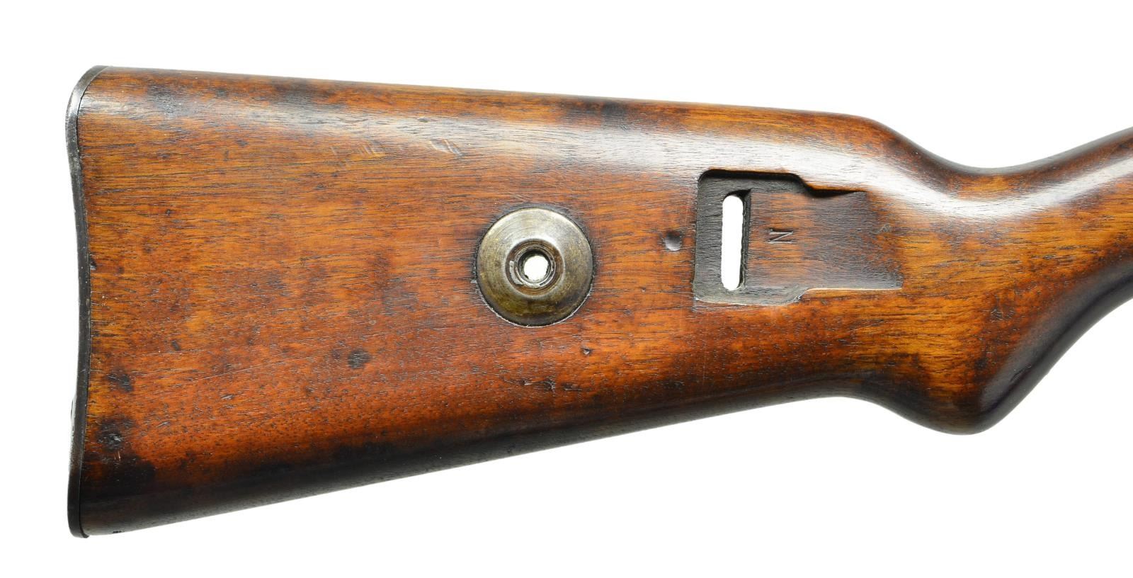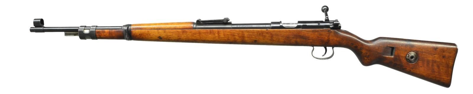 SINGLE SHOT TRAINING RIFLE. Cal. 22 LR. S# 4934. S# match on bbl. & bolt. Bbl. 25 7/8". Tangent rear sight graduated to 200 meters. Inverted V front sight w/ protective hood. Target aperture added to front sight. Bayonet bar is present. Receiver ring is marked on top w/ lg. Mauser banner. Receiver bridge is marked on top w/ "KK-WEHRSPORTGEWEHR". "MAUSER-WERKE A-G OBERNDORF a-N". Bbl. is marked on left side in chamber area "KAL. 22 LANG FUR BUCHSEN". "D.F.". Receiver & bbl. have "eagle N" proofs. Turned down bolt handle. Bolt has early style extractor. Drilled & tapped on the right side for a receiver sight. All milled furniture. Cleaning rod hole has been filled w/ epoxy. Walnut stock set. Stock is marked on right side of butt in sling slot w/ "N". Equipped for side sling. Steel takedown hole. Flat type buttplate. CONDITION: stock set has light wear staining & handling marks from careful use but retains an attractive appearance. Right side of stock has shallow inletting for receiver sight. Metal retains 75% original finish w/ light wear & scattered handling marks. Very good shiny bore. (23-38/RW). CURIO. $800-1,100