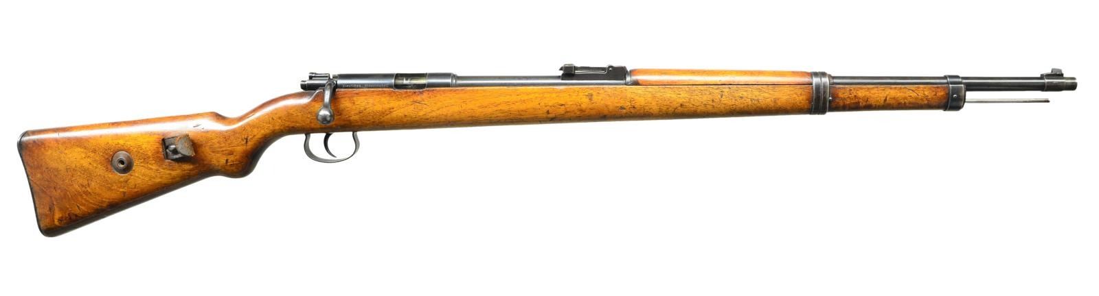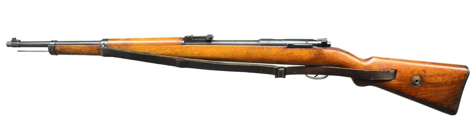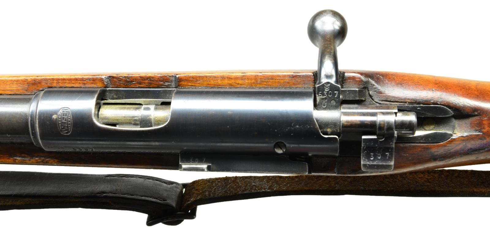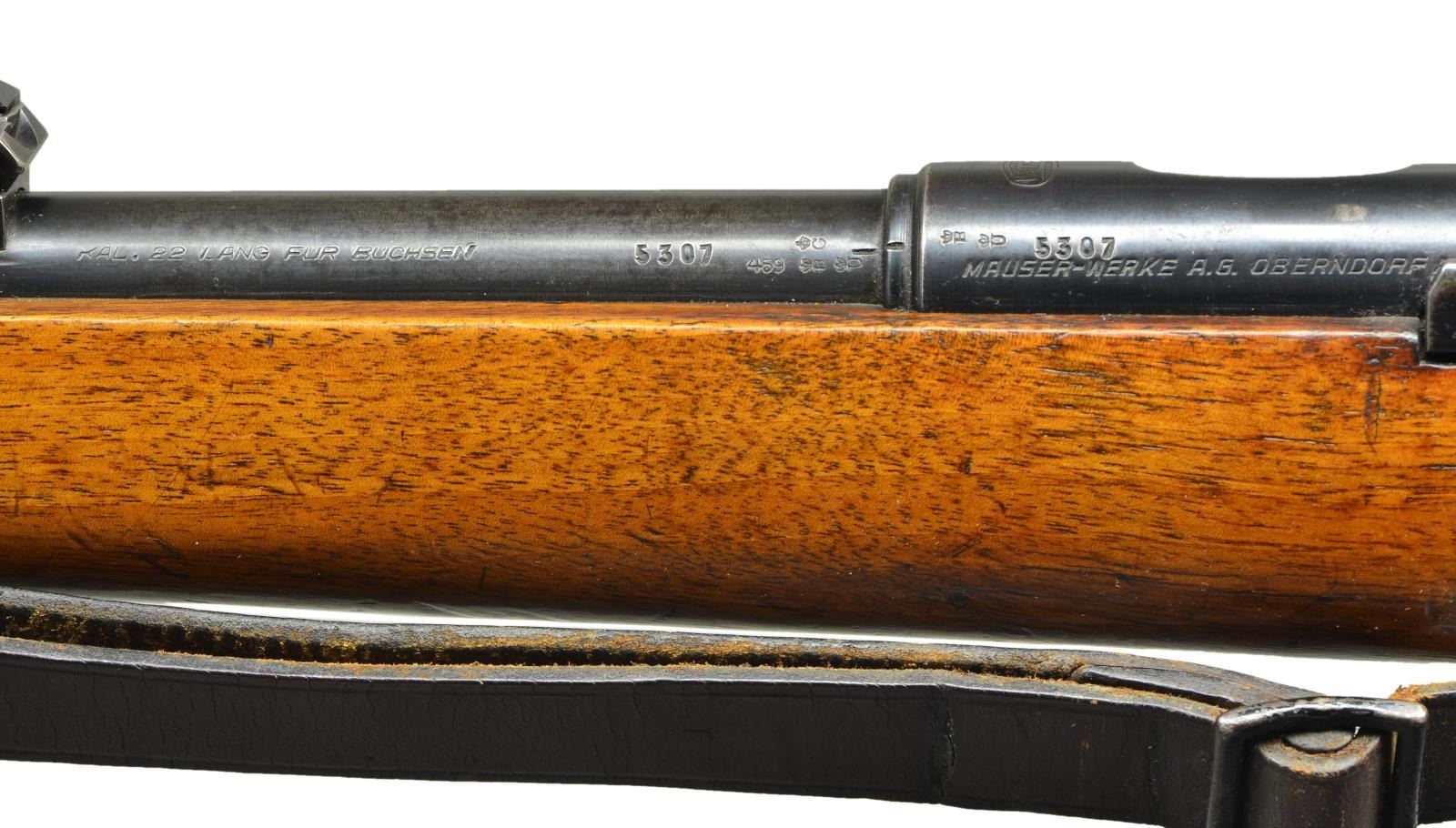 SINGLE SHOT TRAINING RIFLE. Cal. 22 LR. S# 5307 all visible numbers matching. Bbl. 26". Tangent rear sight graduated to 200 meters. Inverted V front sight. Early production rifle w/ “BUG” proofs. Proofs appear on bbl,, receiver & bolt. Receiver marked w/ “small” Mauser banner. Right rear of receiver marked in German script “Deutsches Sportmodell”. Left side of receiver is marked “MAUSER-WERKE A.G. OBERNDORF A.N.”. Bbl. is marked on left side w/ “KAL. 22 LANG FUR BUCHSEN”. Stacking rod is present. Correct brown leather side mounted sling. Steel takedown hole. Flat steel buttplate w/ “stag” engraving. Unmarked walnut stock set. CONDITION: stock has original finish w/ moderate wear, scratches & handling marks throughout, commensurate w/ extensive service. Metal retains 70% original thinning blue finish turning gray w/ light wear & scattered handling marks. Good bore w/ moderately worn lands. (23-39/RW). CURIO. $600-900.