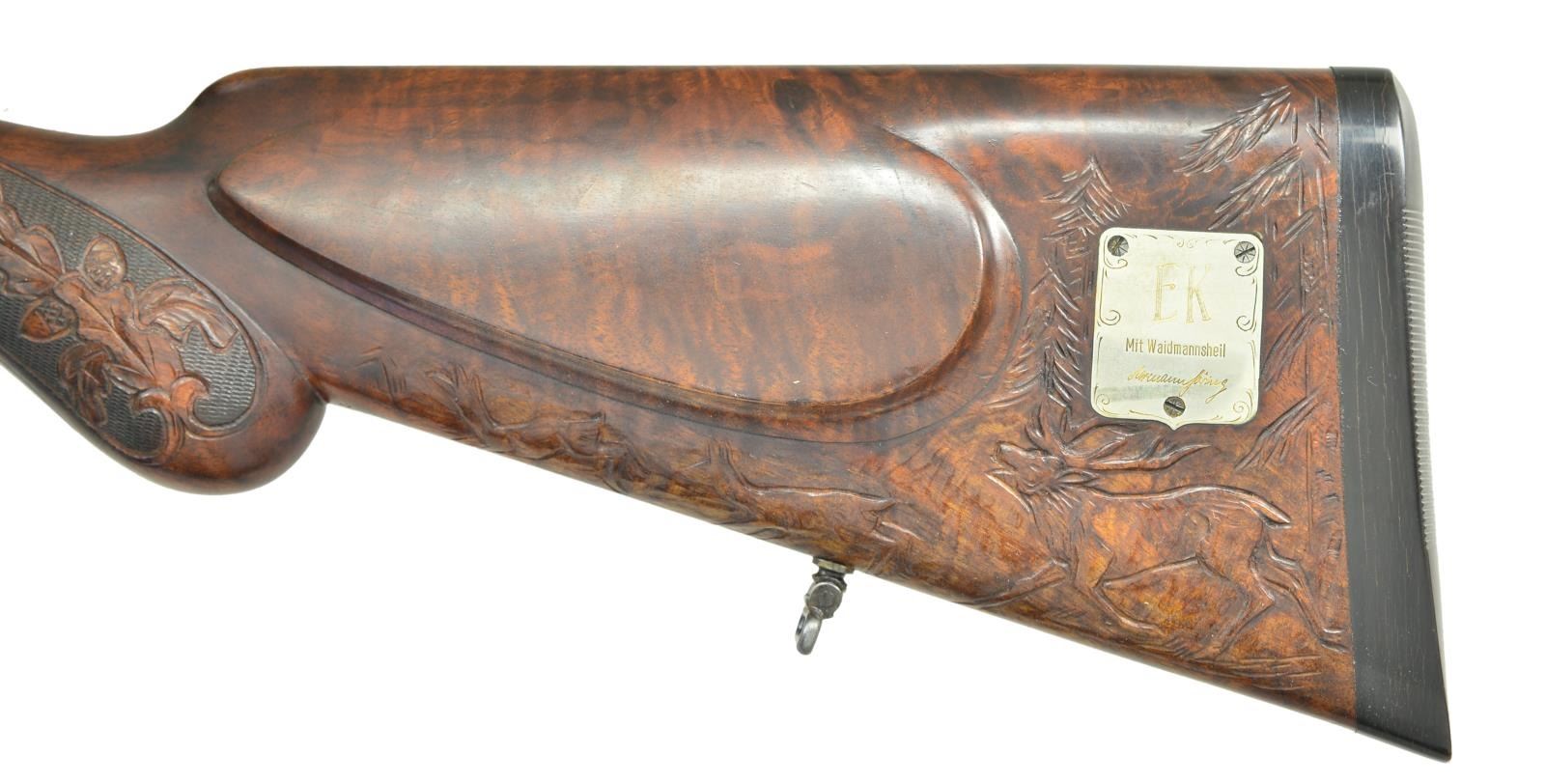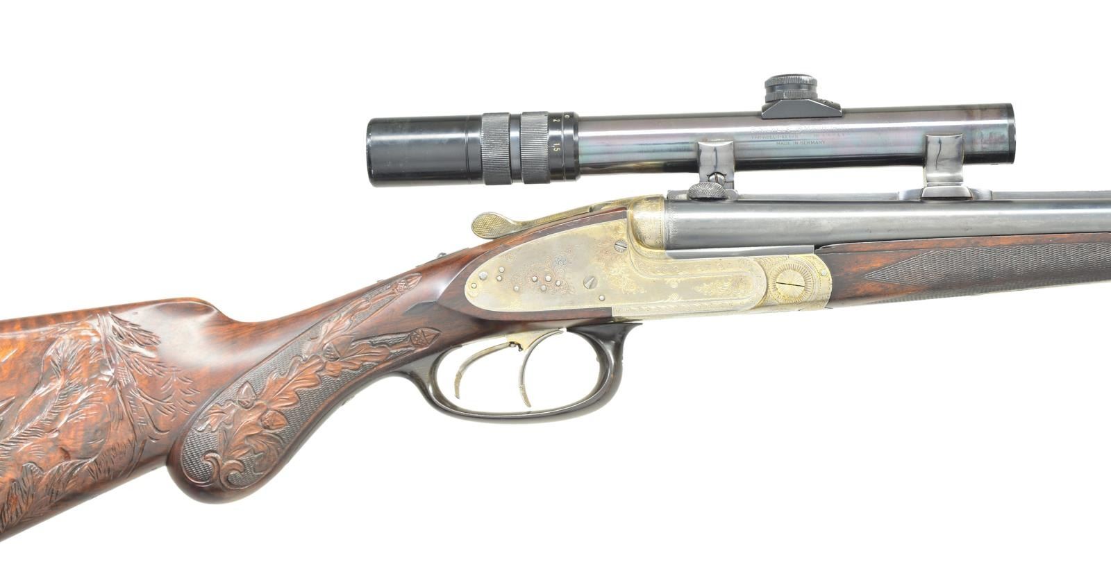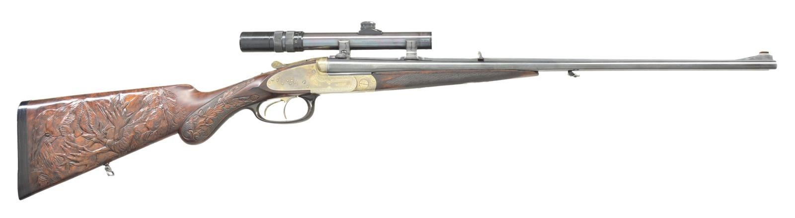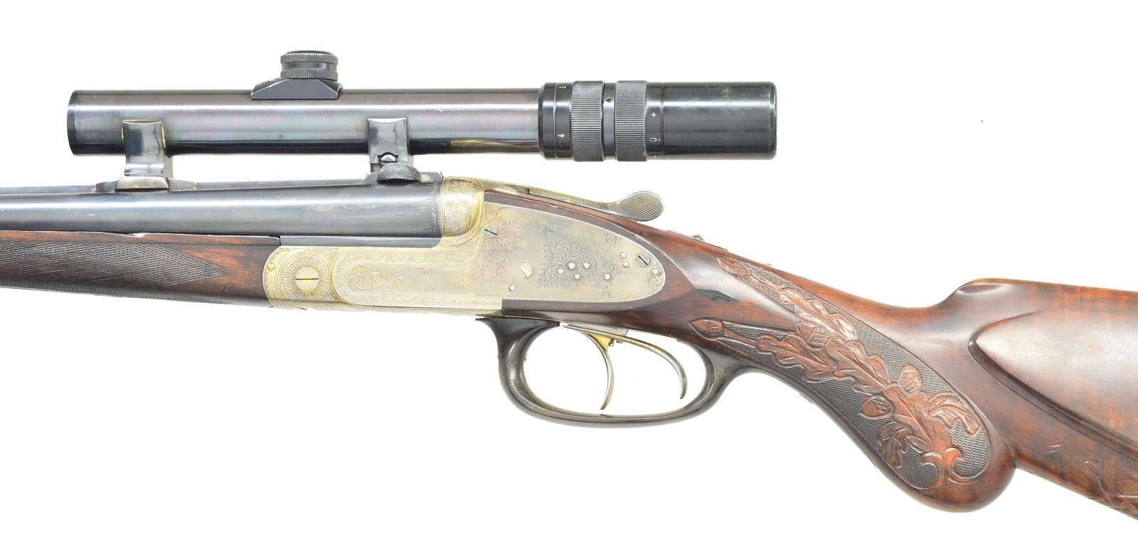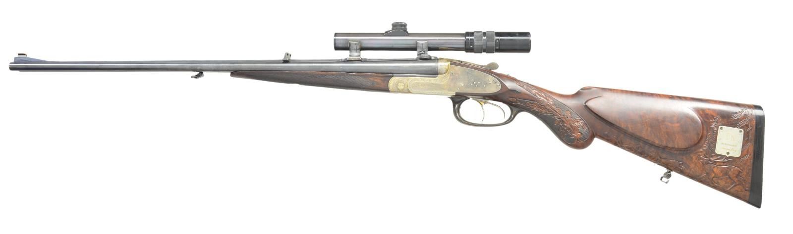BY LUDWIG SCHIWY OF BERLIN WITH SCOPE. Cal. 8x65RS. S# 13528. This well built rifle has 23 5/8" dovetailed barrels fitted with full length broad matted rib, raised front portion forming ramp holding large red painted bead. Rear portion is fitted with claw bases. Unmatted portion at center is engraved "L. Schiwy Berlin S. W. 68". Barrels are also fitted with unusual Schiwy patented rear sight with central large U shaped notch flanked by triangular openings on sides. Use of these allows built in lead for running driven game. This sight is marked "D. R. P. L. Schiwy Berlin" and has been found on a number of rifles owned by Hermann Goering, and it appears that Schiwy was one of his favorite gunsmiths. Barrel flats are stamped with July 1932 German nitro proofs for 8 x 57 with subsequent post war Hannover Proof House marks for 8/65RS. Coin finished sidelock action with remnants of gold wash overall, is stocked to the fences and features non automatic safety, hidden third fastener, bushed strikers, raised arrowhead tumbler end cocking indicators, and double triggers (both set). Action is engraved with 60% coverage well cut Germanic scroll. Trigger guard is of horn. Stock of dense stump figured and nicely marbled European walnut measures 14 3/4" over thick horn ribbed buttplate. Stock features right hand shadow line cheekpiece, and flush inlet lozenge shaped horn drop points. A gold washed rectangular silver presentation plate behind cheekpiece is engraved "E K" "Mit Waidmannsheil" "Hermann Goering" (in script signature). Similar presentation plaques have been noted on other Goering associated rifles. Most of the buttstock has been carved at a later date, in Germanic style with game scenes, oak leaves, and acorns, by a less than talented individual. Left side has a stag pursuing two hinds. The entire right side is taken up by relief scene of battling European elk (moose). Oak leaves and acorns have been carved into checkering at grip. Matching splinter ejector forend with inset horn tip, has Deeley release and has not been carved. Rifle is mounted with B. Nickel 1 - 4 X scope with three post and crosshair reticle in soldered on claw rings, rear with windage. Weight without scope: 8 lbs 3 oz. CONDITION: fine, as partially refinished. Barrels have old "best" reblack with subsequent wear, mostly on sides. Action is mostly bright polish with perhaps 10% gold wash remaining. Stocks have some of what appears to be their original surfaces, some oil added after newer carving. Bores are very fine, strong rifling throughout, with slight erosion at throats. Action is tight with forend installed. Right barrel is somewhat off face. Ejectors are strong and in time. Set triggers work. Scope is fine, optically clear. (22-5670/MGM). CURIO. $4,000-6,000.