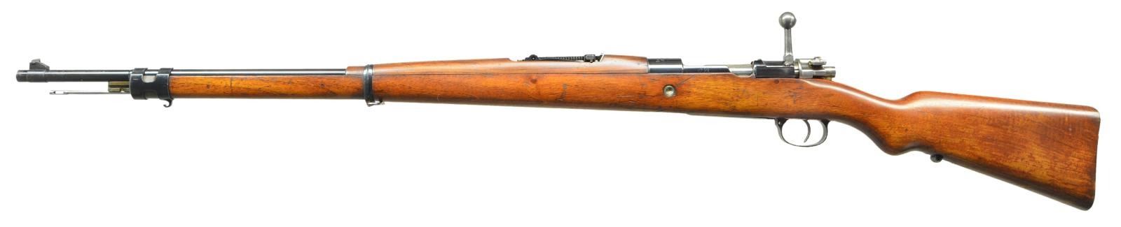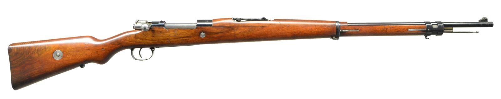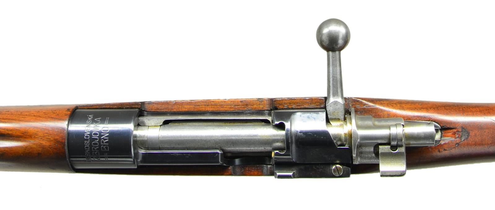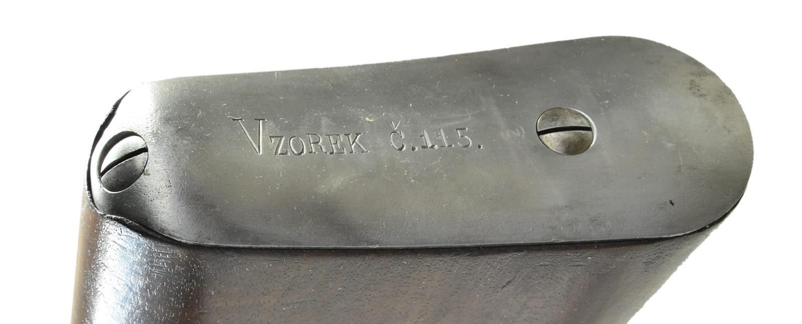 ACTION MILITARY RIFLE. Cal. 7mm Mauser. NSN. Bbl. 29 1/4". Tangent rear sight graduated to 2,000 meters. Inverted V front sight. This unnumbered rifle is marked on top of receiver ring w/ "CESKOSLOVENSKA ZBROJOVKA BRNO". The markings are in a straight line perpendicular to the axis of the receiver. The left receiver rail is marked "VZ 24". There is an additional marking on the buttplate which is "VZOREK C.115". Consignor states this marking which translates as SAMPLE w/ the C115 referring to the page of a BRNO catalog of that era and further states that due to a coordinated sales agreement between Vickers Limited and the CZ Factory that Vickers handled the machine gun sales in areas such as South America w/ CZ supplying rifles. Consignor further states this rifle was part of a small quantity of samples supplied to Vickers for sales purposes and that this rifle was obtained by the CA. arms dealer, Martin B. Retting. This rifle is configured very similarly to the Brazilian 1908 rifle. The rifle has numerous small encircled "CZ" parts markings. Cleaning rod & bayonet bar are present. H Type upper band w/ parade hook. Narrow lower band. Bands are retained by springs. Straight bolt handle. Matching walnut stock set. Stock and hand guard are marked in bbl. channel "298". Cross bolt has typical Czech style indentation for bolt disassembly. Buttstock has bottom swivel base. Quick detachable swivel is not present. Flat steel buttplate. Steel marking disk in right side of butt. CONDITON: stock set has nice appearance w/ a small amount of figure in the buttstock heel area but does have small scattered handling marks and tiny scratches throughout. Small missing chip behind receiver tang. Notable 1" check in the top left of the handguard mid way between rear sight and lower band. Bright bolt w/ the beginnings of gray coloration. Cleaning rod, cross bolt, trigger and buttplate are finished bright. Balance of parts retain 95% original blue w/ light high point wear. Screw heads have faint straw color. Near excellent shiny bore. PROVENANCE: Dr. Fred Novy collection. (23-176/RW). CURIO. $3,000-4,000.