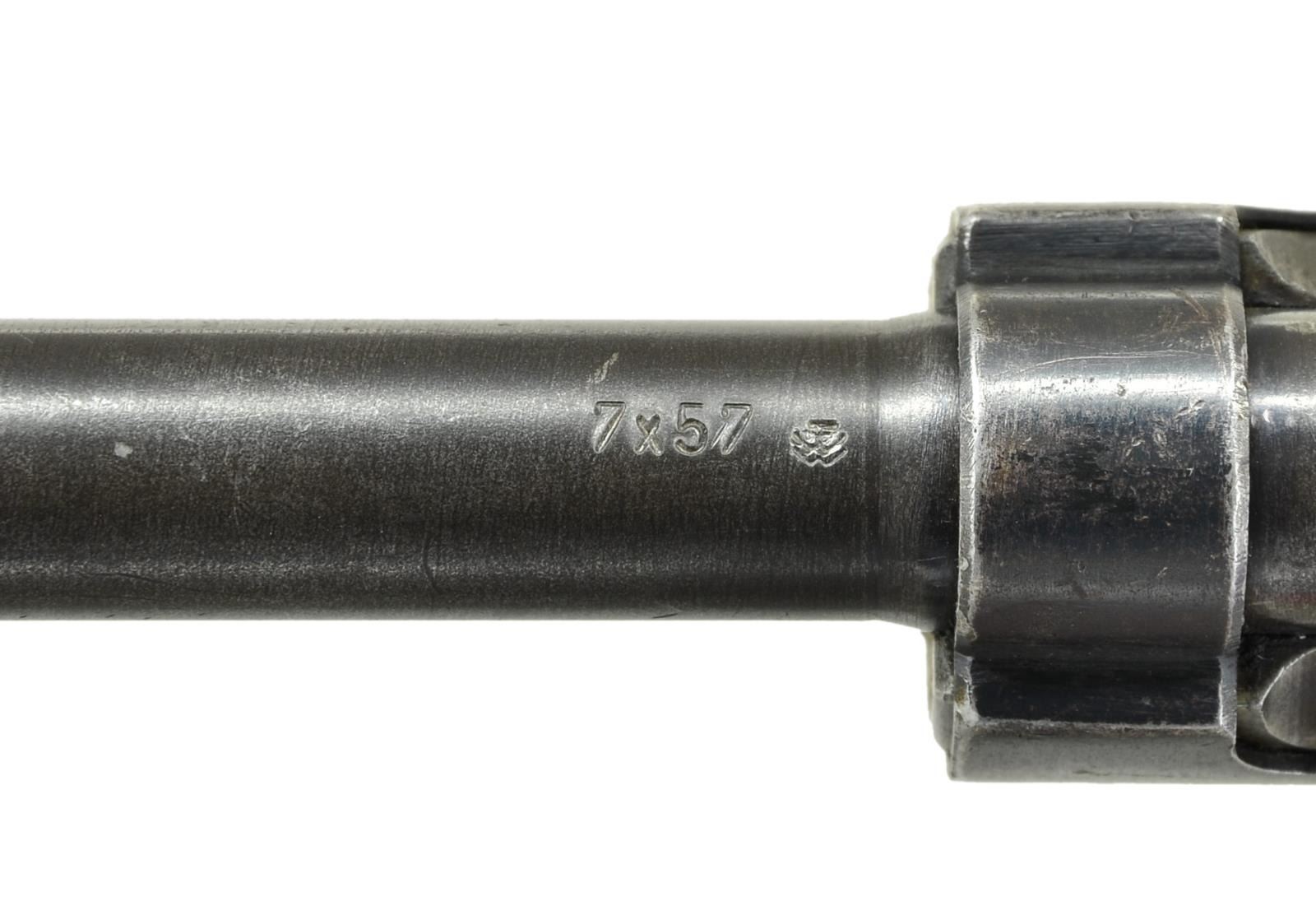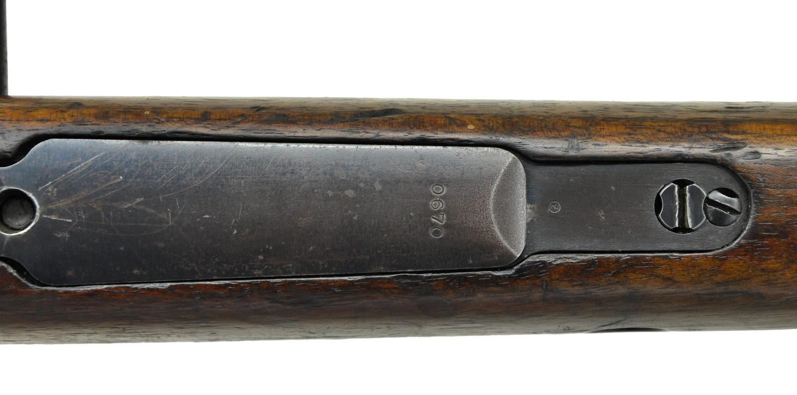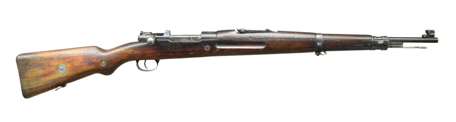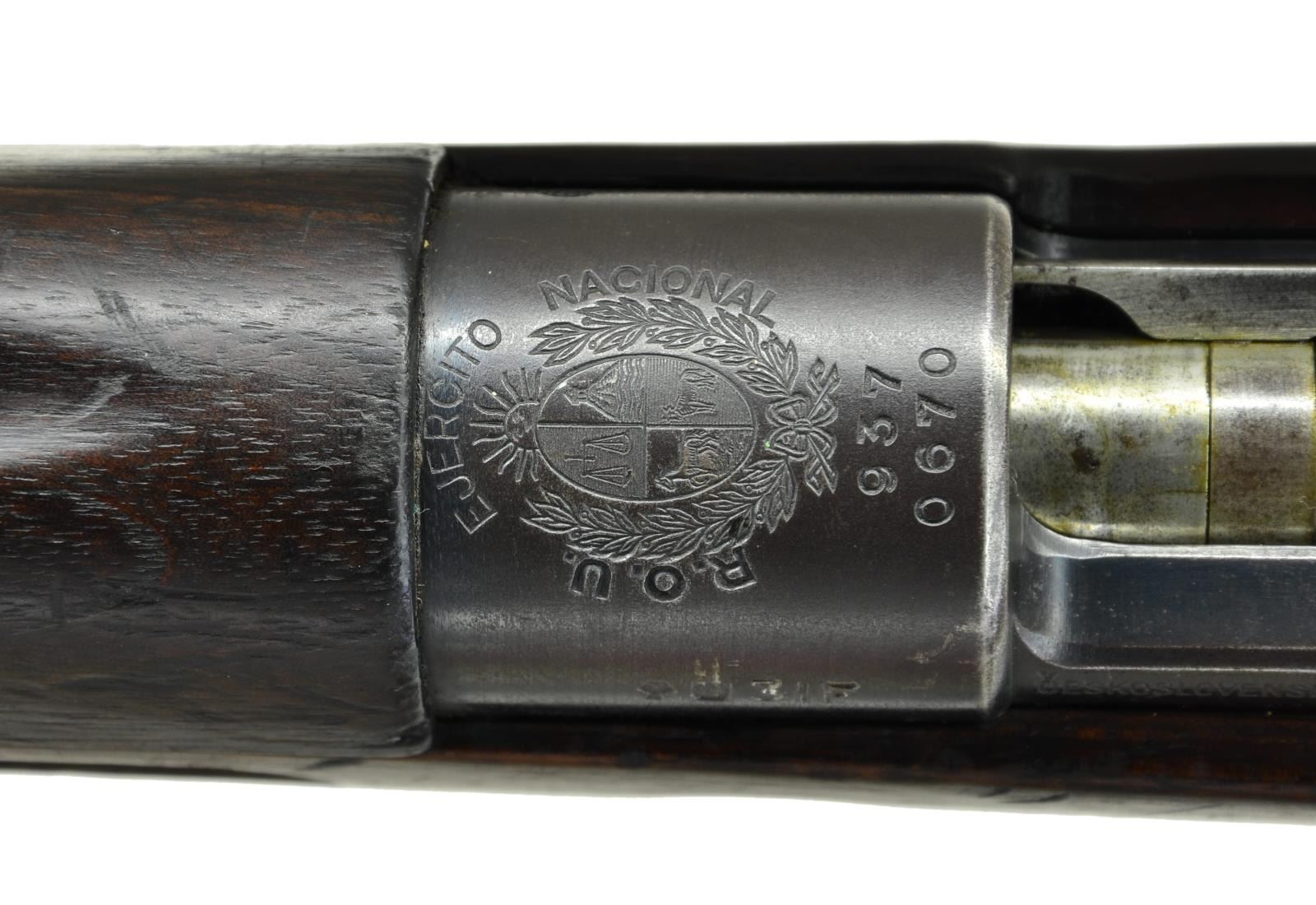 MODEL VZ37 (937) BOLT ACTION RIFLE. Cal. 7X57 Mauser. S# 0670. Numbers match on receiver, buttstock and floorplate. Bbl. 23 1/4" marked on top of upper band w/ “7X57” & tiny acceptance mark. Tangent rear sight graduated to 2,000 meters. Inverted V front sight w/ screw retained sheet metal protective ears. Receiver ring is marked on top w/ crisp Uruguayan crest then “EJERCITO NACIONAL R.O.U.”. Marked on left side w/ Czech proofs. Left receiver rail marked “CESKOSLOVENSKA ZBROJOVKA, A.S. BRNO”. Straight bolt is marked w/ encircled “CZ” & “A7”. Receiver bridge has characteristic high clip guide. Bayonet bar & cleaning rod are present. All milled furniture w/ provisions for side & bottom swivels. Walnut stock & full length handguard. Buttstock has flat type buttplate & unmarked disk. CONDITION: stock set has moderate wear, staining & handling marks throughout. Buttstock has appearance of being lightly cleaned. Metal retains approx. 60% worn thinning blue w/ spots of light oxidation & very fine pitting. Bore has strong sharp lands but turning slightly dark in grooves. PROVENANCE: Dr. Fred Novy collection. (23-170/RW). CURIO. $2,000-3,000.