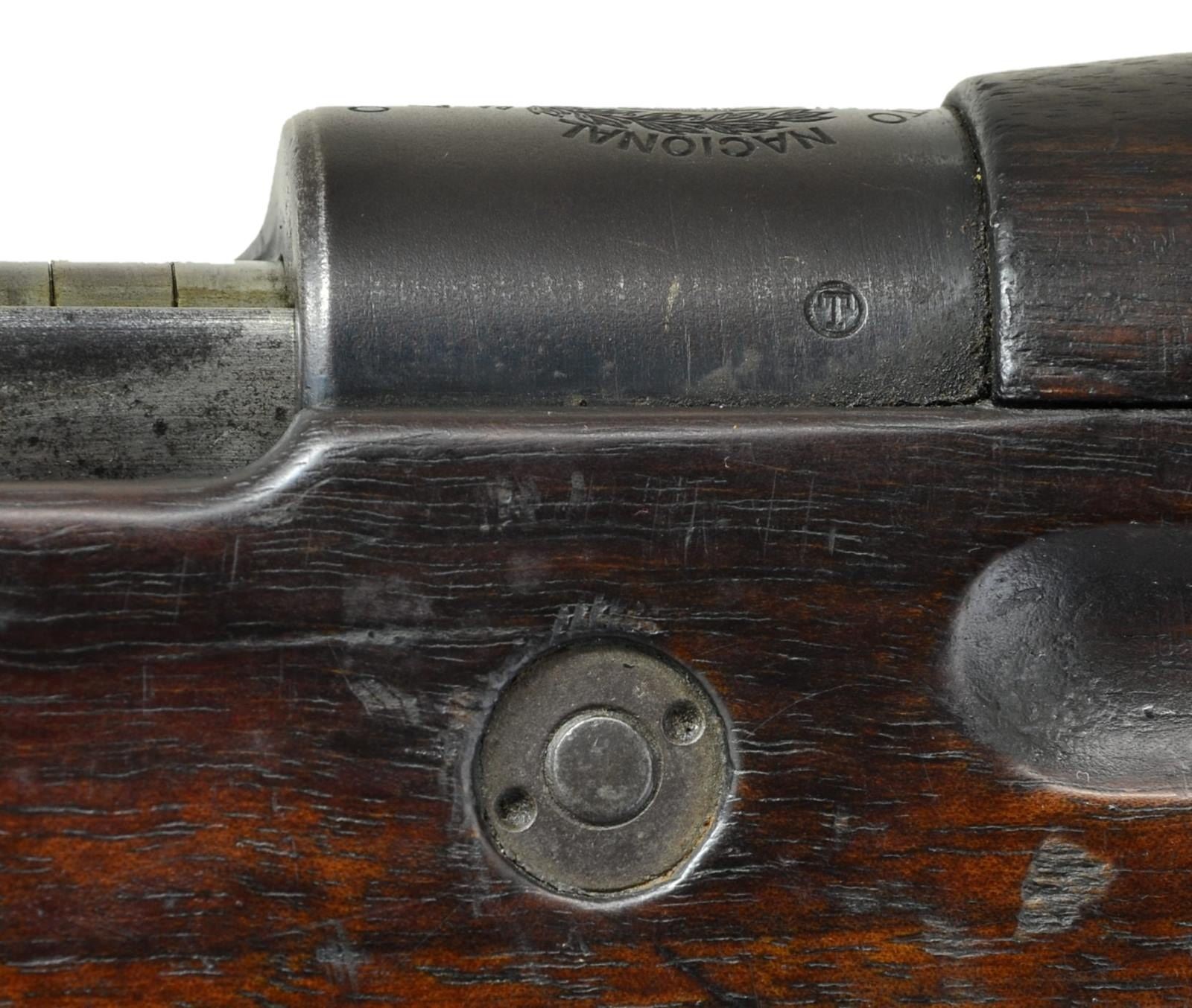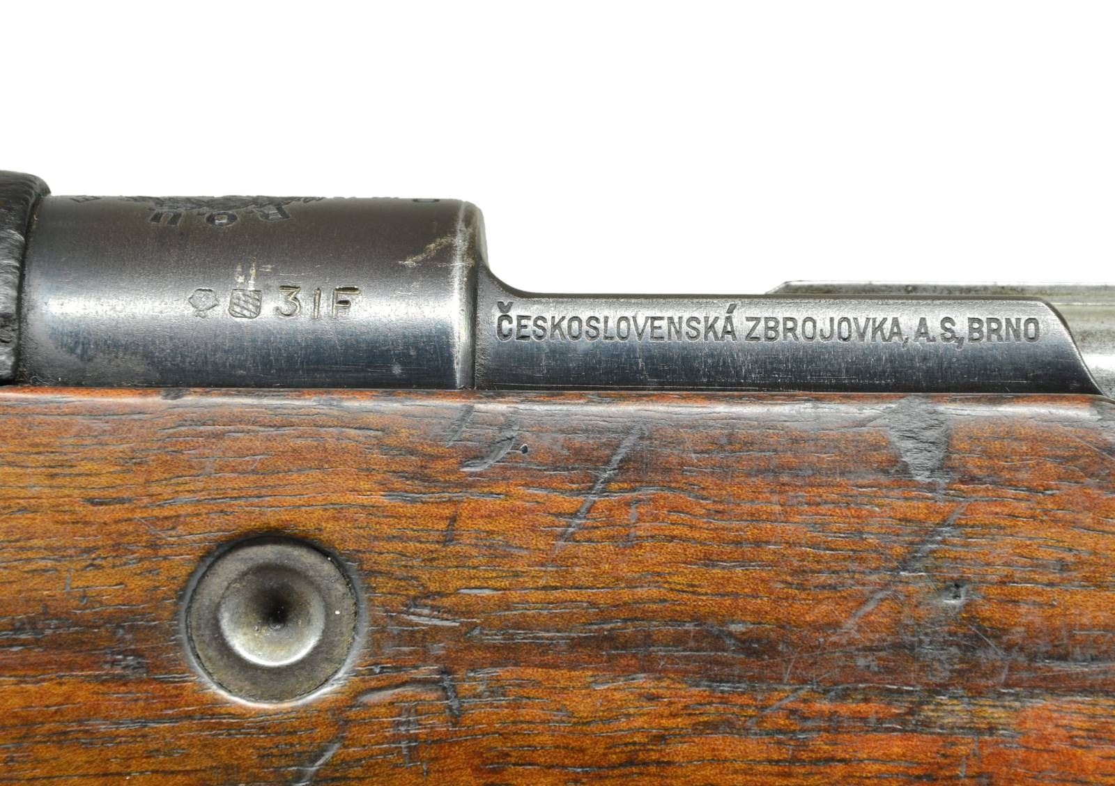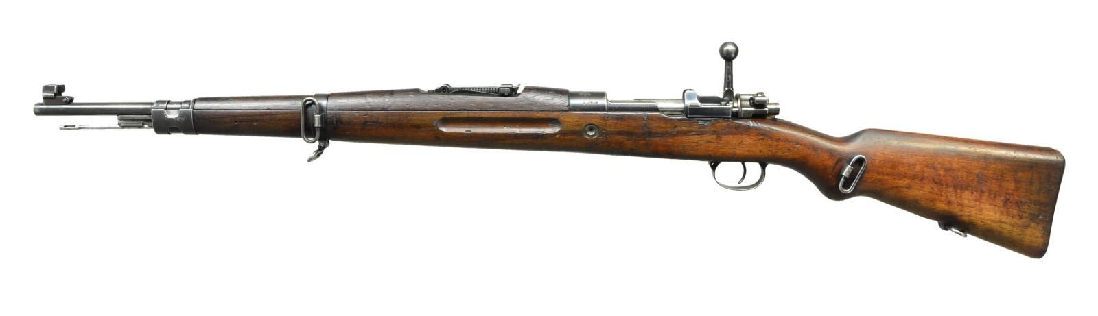 MODEL VZ37 (937) BOLT ACTION RIFLE. Cal. 7X57 Mauser. S# 0670. Numbers match on receiver, buttstock and floorplate. Bbl. 23 1/4" marked on top of upper band w/ “7X57” & tiny acceptance mark. Tangent rear sight graduated to 2,000 meters. Inverted V front sight w/ screw retained sheet metal protective ears. Receiver ring is marked on top w/ crisp Uruguayan crest then “EJERCITO NACIONAL R.O.U.”. Marked on left side w/ Czech proofs. Left receiver rail marked “CESKOSLOVENSKA ZBROJOVKA, A.S. BRNO”. Straight bolt is marked w/ encircled “CZ” & “A7”. Receiver bridge has characteristic high clip guide. Bayonet bar & cleaning rod are present. All milled furniture w/ provisions for side & bottom swivels. Walnut stock & full length handguard. Buttstock has flat type buttplate & unmarked disk. CONDITION: stock set has moderate wear, staining & handling marks throughout. Buttstock has appearance of being lightly cleaned. Metal retains approx. 60% worn thinning blue w/ spots of light oxidation & very fine pitting. Bore has strong sharp lands but turning slightly dark in grooves. PROVENANCE: Dr. Fred Novy collection. (23-170/RW). CURIO. $2,000-3,000.