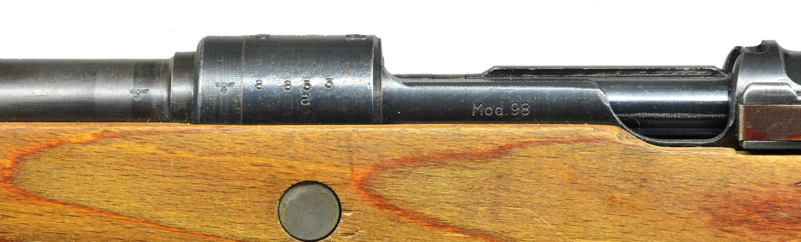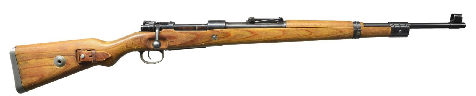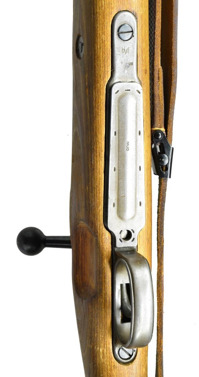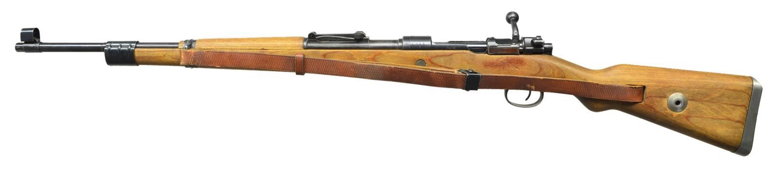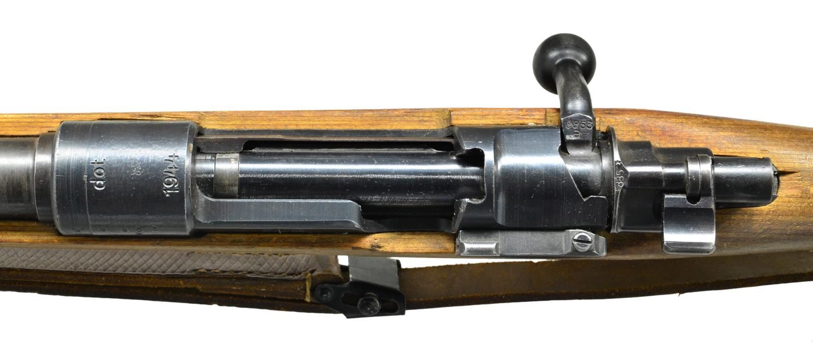 ACTION MILITARY RIFLE. Cal. 8mm Mauser. S# 8853a. Bbl. 23 5/8". All visible numbers match except cocking piece. Tangent rear sight graduated to 2,000 meters. Sight leaf marked on top only. Inverted V front sight w/ protective hood. Receiver ring is marked on top "dot and dated 1944". Receiver ring & bbl. marked on left side "German eagle proof". Receiver ring marked on right side w/ "2 eagle 63"s. Late law Model 98K. Mfg. at Waffenwerke Brunn AG w/ notable manufacturing short cuts & coarser finishes. All stamped furniture. Solid upper & lower bands retained by wood screws. No provision for bayonet bar or cleaning rod. Stamped trigger guard marked "byf". Floorplate is marked "MUD". Cut type buttplate; sealed takedown hole; unmarked laminated stock set; plus period brown leather sling. CONDITION: stock set has thin original finish w/ light wear & staining but retaining a good appearance. Metal retains 74% original finish w/ thinning & light wear. Trigger guard assembly, buttplate & takedown hole have gray finish. Near excellent shiny bore. (23-37/RW). CURIO. $1,100-1,400.