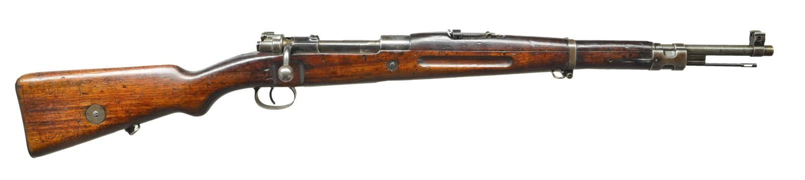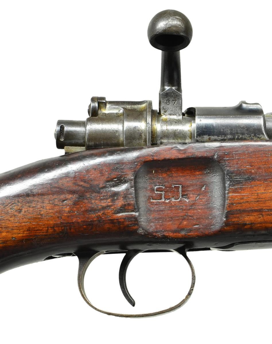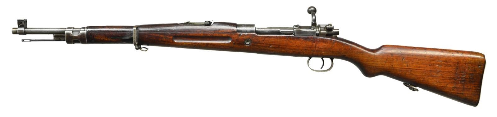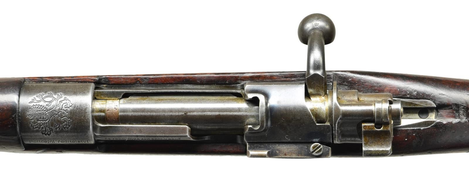 MARKED BOLT ACTION CARBINE. Cal. 8mm Mauser. S# 208. Bbl. 19 3/8". Tangent rear sight graduated to 1,000 meters. Inverted V front sight w/ protective ears. Receiver ring is marked on the left side "Policejni reditelstvi Brno". Marked on top w/ crisp "rampant lion" crest. Right side is marked w/ "rampant lion" acceptance mark. "E rampant lion 35". Left receiver rail is marked "Cs.ZBROJOVKA AKC.SPOLVBRNE VZ33". These carbines were mfg. w/ a slightly smaller receiver ring but retained the step of the Model 1898 type receivers & had numerous lightening cuts w/ a hollow bolt knob thus making a light handy carbine for police & other paramilitary groups. These carbines were the basis of the German G33/40 carbine used to arm mountain troops. All milled furniture. Bayonet bar & cleaning rod are present. Bottom swivels, lower band has additional sling loop on left side. Trigger guard made w/out locking screws. Flat buttplate w/ trap. Matching walnut stock set w/ grasping grooves & unmarked steel identity disk. Buttstock is marked on left rear w/ "POLICEJNI REDITELSTVI BRNO" & "208" to match receiver. Buttstock has several shallow period "BORED SOLDIER" initials on both sides. CONDITION: stock set has legible markings w/ original finish & added finish period w/ the wear, staining & handling marks typical of a well used service rifle. Forend has sm. crack on top extending from rear sight to lower band. Metal has traces of original blue turning to overall gray w/ wear & handling marks plus sm. spots of oxidation. Front sight protective ears are bent slightly inward. Bore has strong lands w/ lightly oxidized appearance turning dark in grooves. (23-32/RW). CURIO. $900-1,200.