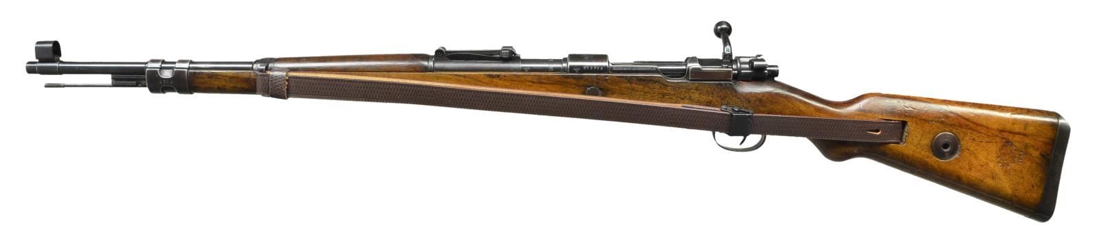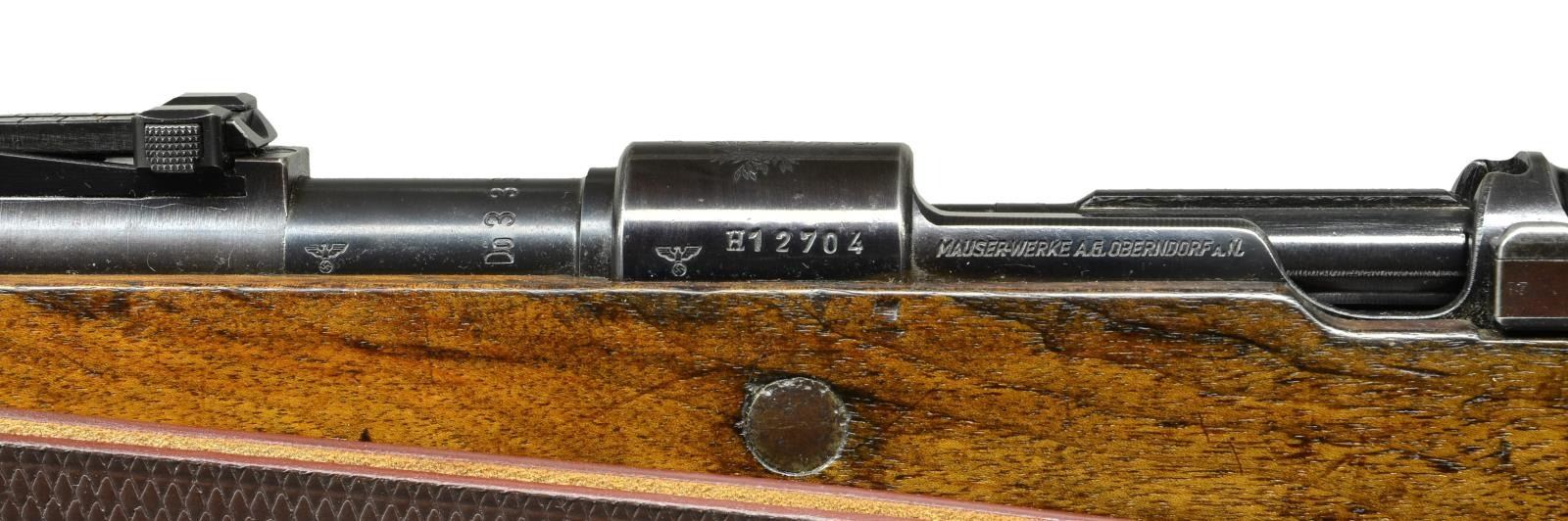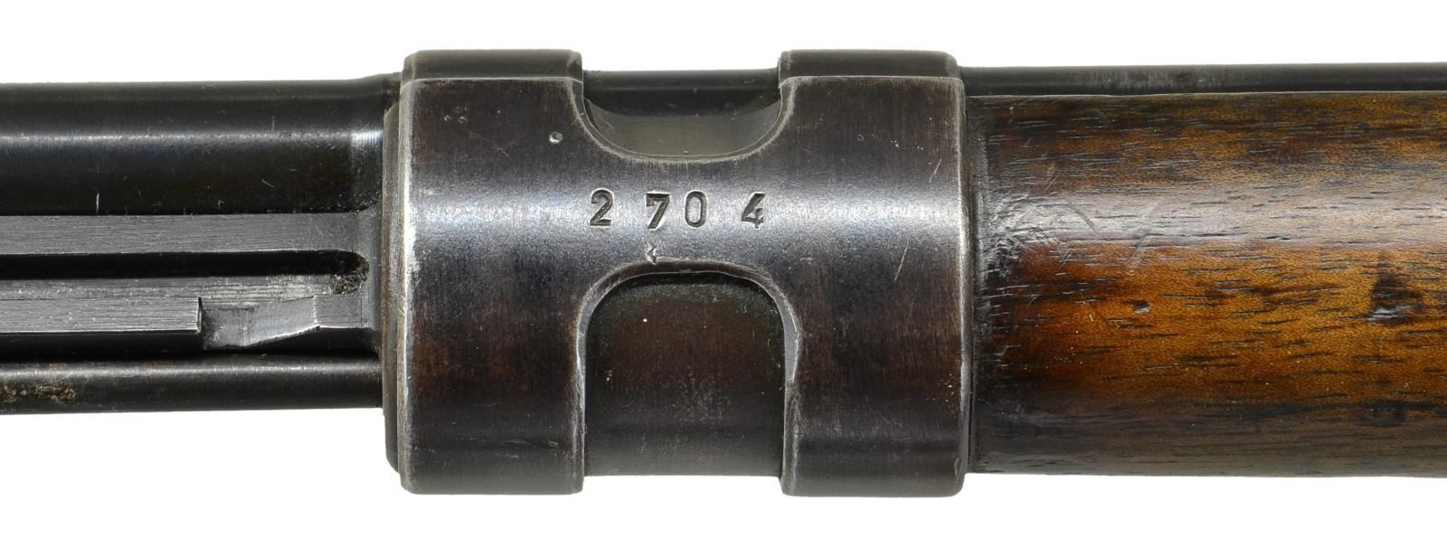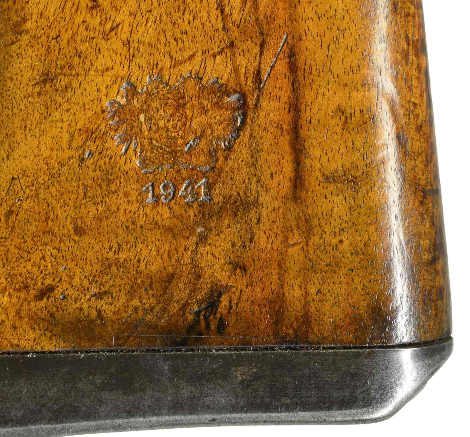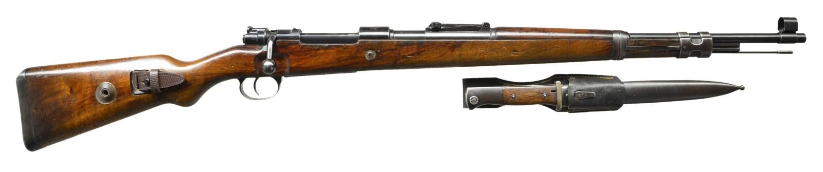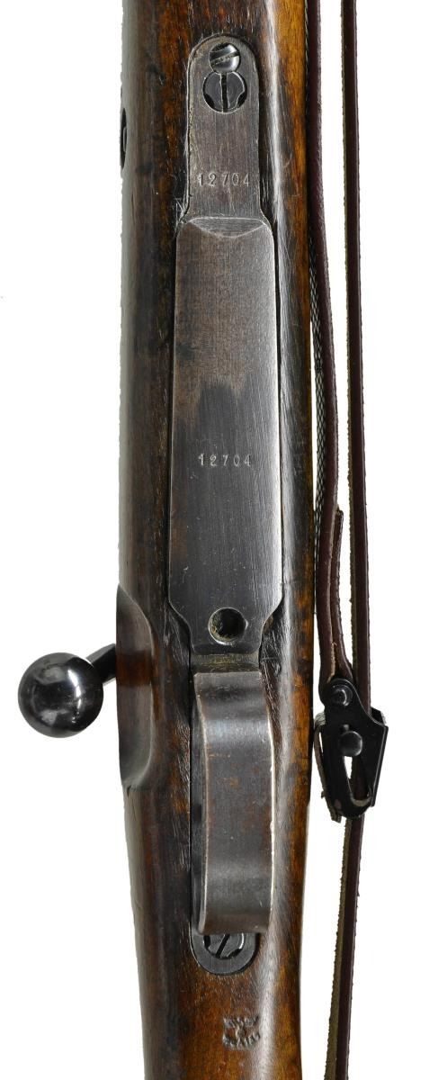 SHORT RIFLE WITH WWII GERMAN ARMY ACCEPTANCE MARKS. Cal. 8mm Mauser. S# H12704. All visible numbers match. Bbl. 23 5/8". Tangent rear sight graduated to 2,000 meters. Inverted V front sight. Blade is not present in front sight base. Sight base has reproduction protective hood. These rifles were mfg. by Mauser at Oberndorf for the Portuguese government & were an updated version of the Model 1937-A. Not all were delivered to Portugal. In 1944 Arms exports from Germany were halted & the undelivered rifles were then issued to the German Army w/ German markings added. Receiver ring is marked on top w/ Portuguese crest "1941" and German eagle "135". Left side of receiver ring & bbl. have German eagle proof. Left receiver rail marked "MAUSER-WERKE A.G. OBENDORF A.N.". Bbl. is marked over chamber "DO336 & 3 eagle 35". Bayonet bar & cleaning rod are present. All milled furniture except for cup type buttplate marked "brg" eagle "497". Walnut stock set w/ side sling & steel takedown hole. Buttstock is marked on left side w/ manufacturer's mark resembling a crest & "1941" date. Right side is marked w/ eagle "135". Stock marked at belly with S# "H12704", eagle "135" & "H" indicating German Army issue. Reproduction brown leather sling. UNATTACHED ACCESSORIES: matching original bayonet scabbard & frog. Unsharpened bayonet has 10" fullered blade. Bayonet is marked w/ S# on crossguard & 2 eagle "883"s. Smooth walnut grips; steel scabbard w/ unmarked leather frog. Bayonet & scabbard retain 70% original blue finish w/ thinning & light wear. Frog has tight stitching w/ light wear & staining. CONDITION: original finish stock set has added finish w/ wear, scratches & handling marks throughout. Metal retains 60% original thinning blue w/ light wear. Receiver ring has notably darker appearance but crisp crest. Very good shiny bore. (23-35/RW). CURIO. $1,100-1,400.