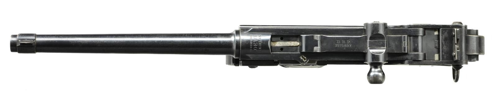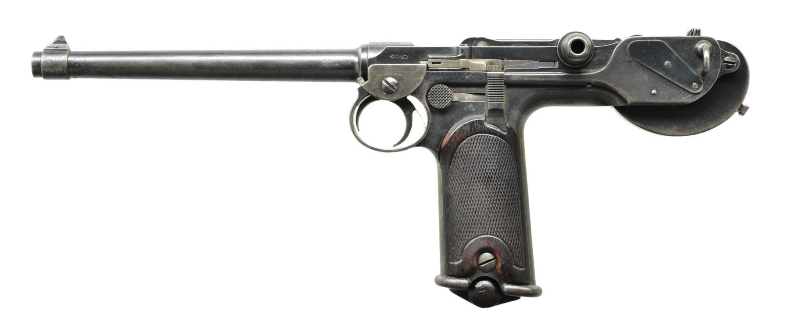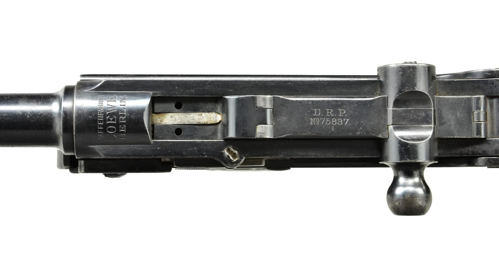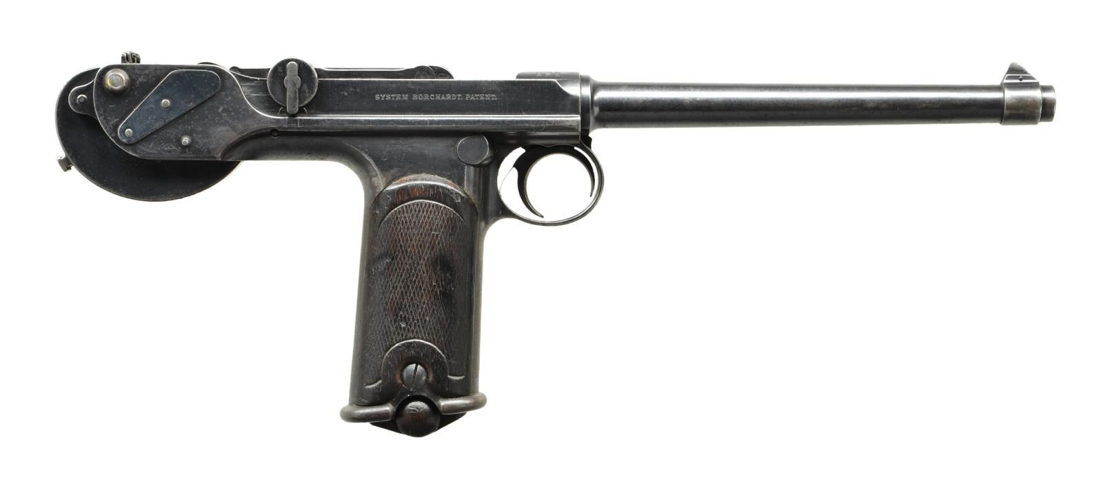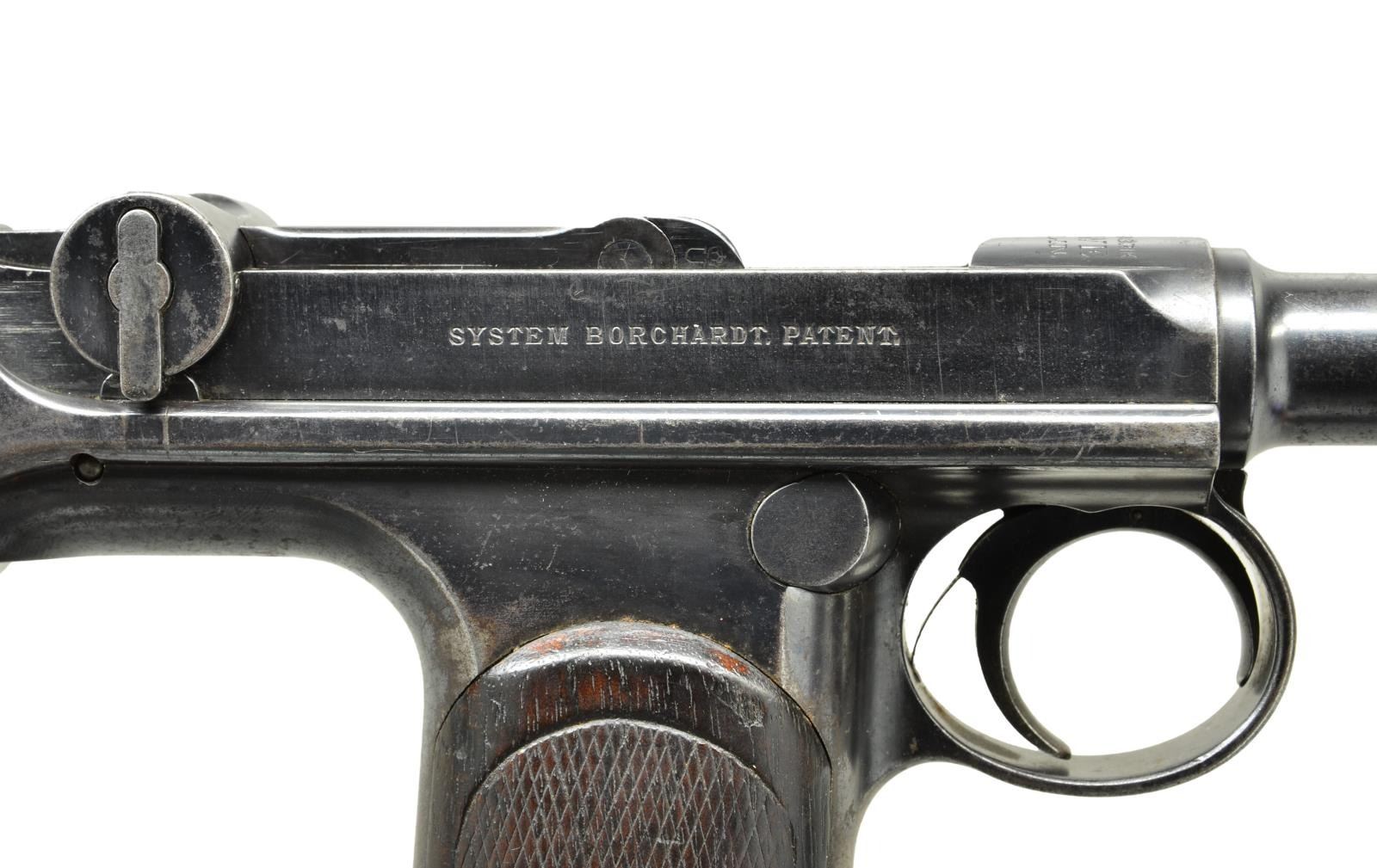 Cal. 7.65X25mm Borchardt. S# 625. Bbl. 7 1/2" (190mm) with banded front sight base having single pin retaining fin shaped blade. Mfg. prior to 1897 when Loewe went out of business and was replaced by DWM. Serial numbers for Loewe were 1-1104 then 1105 to 3000 for DWM; production ceased in 1902. Per Sturgess' book, this is a series IVa. Model C93 is the first mass produced semi-auto pistol. Its cartridge is dimensionally identical to the later 30 Mauser derived from it, but with less powerful charge. Proofed with crowns B and U on left front of receiver, front toggle plus on breech block. Large script LOEWE markings over chamber; Borchardt marking on right of receiver. Top of toggles has patent info. Appears all numbers matching (except magazine) to include: trigger cover plate, trigger, safety, frame on edge of mag. well, barrel, receiver, stock lug on mainspring housing, rear sight blade, mag. release, both toggles and both border checkered walnut grips. Firing pin with script "W" or "M". MAGS: 1 good plated 8 rd. with brown stained body having wood base (light marks) numbered 948. Light impact marks at top by feed lips and at bottom rear behind knobs. CONDITION: good overall appearance with peppery oxidation plus high point and function wear. Grip area has patina tone. Hand wear on grips plus some aged impact marks on right. Fair bore with wear, slight darkness and even pitting. (01-22065/NW). ANTIQUE. $12,000-15,000.