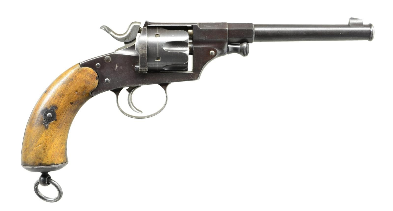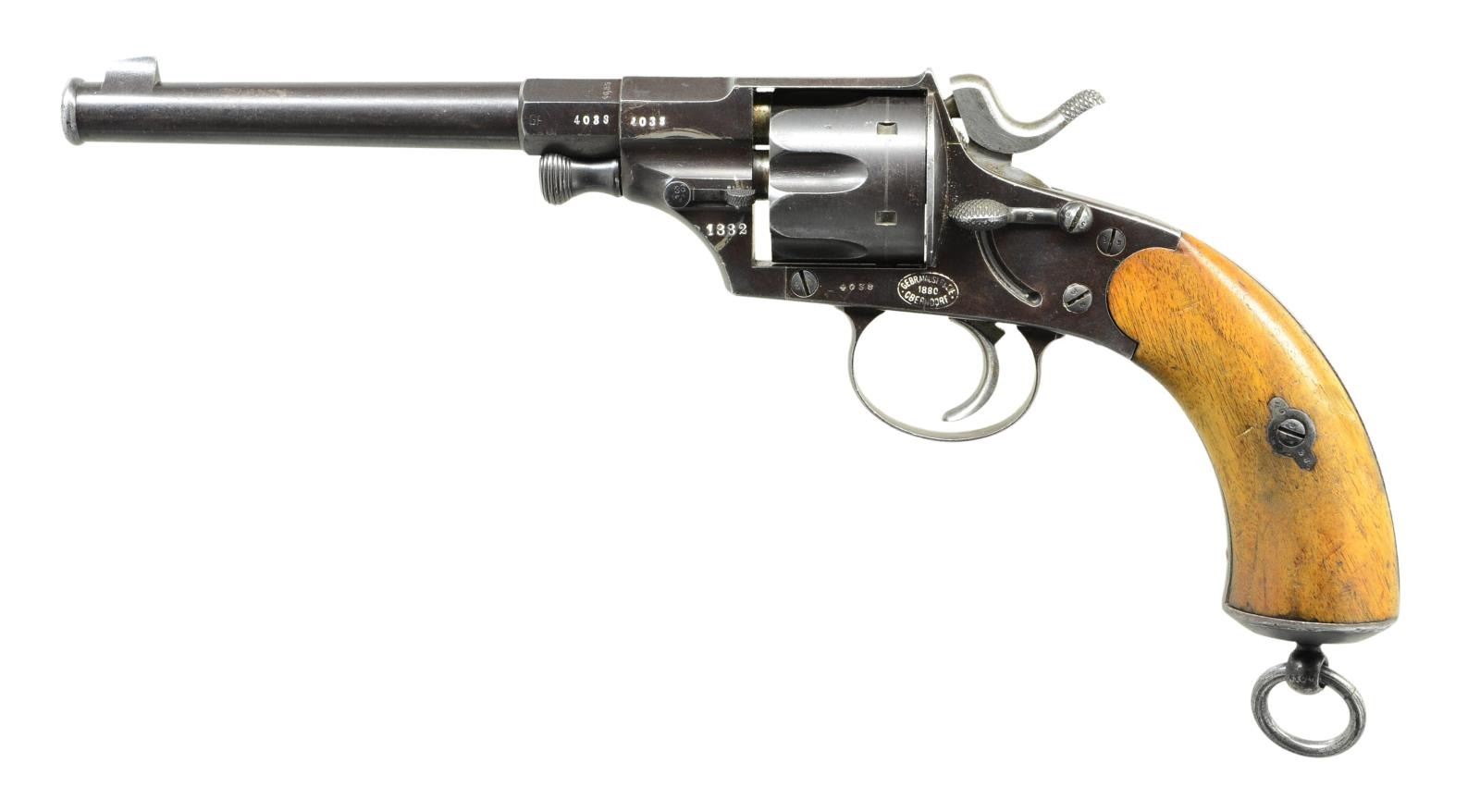 Cal. 10.55x25R. S# 4038. In use by Germany from 1882-1919. Lg. sturdy revolver w/ safety lever yet mfg. w/out extractor requiring removal of cyl. & use of pivot pin to individually remove spent cartridges. Bbl. 7.2" w/ integral inverted V sight blade behind flared muzzle; mostly rnd. (4 5/8") changing to octagon at frame (1"). Mfg. 1882 w/ matching numbered parts throughout except for the forward side plate screw that is numbered 13. Loading gate has faint 8 on face towards cartridges. Sideplate is Mauser marked within the customary oval. Left flat of bbl. & rear of cyl. marked "GF". Various sm. assembly proofs throughout. Trigger & hammer are in the white. Smooth European walnut grips having metal butt cap w/ extremely robust lanyard ring whose loop is also matching numbered. CONDITION: VG+ original browned finish w/ touched up small parts including the cyl. axle, levered axle release, safety lever & the three sideplate screws. Comparable condition grips w/ light patina & handling marks. Bright bore w/ distinct rifling & areas of shallow/cleaned pitting. Near perfect manual mechanics w/ solid lockup on all cylinders & functional safety. A rare opportunity to buy a high condition Mauser marked 1879 Reichs Revolver. PROVENANCE: Ex-Howard Renick Collection. (01-20269/LA). ANTIQUE. $ 2,500-3,500.