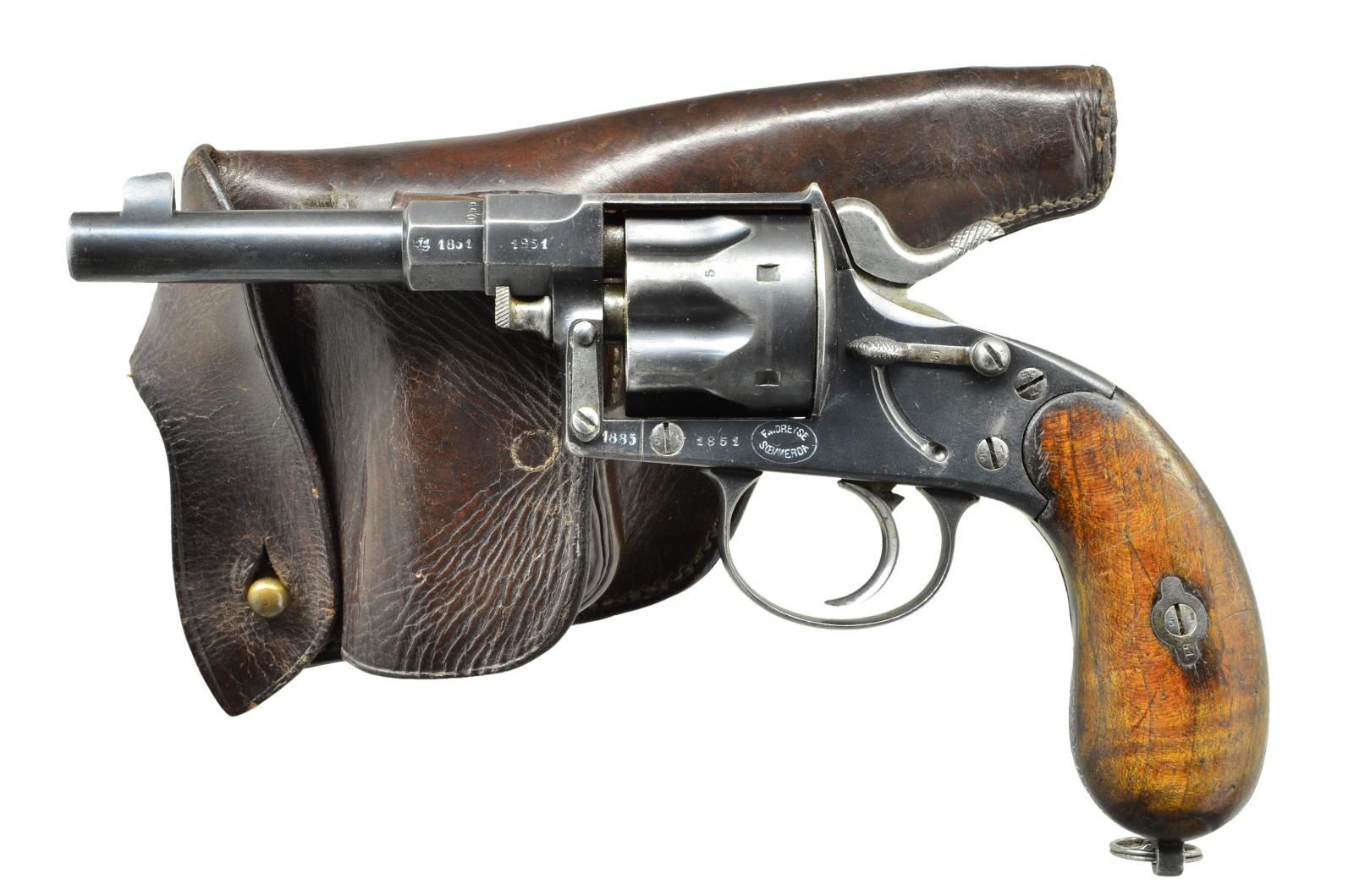Cal. 10.55x25R. S# 1851. Bbl. 5" stepped oct. to rnd. w/ integral inverted V front sight. Mfg. 1885 w/ blued finish; hammer & trigger in the white. Matching numbers on all visible parts except for the loading gate pivot screw that is numbered 65. Dreyse marked sideplate. Multiple unit markings, most recent, "I.A.6.65", several others lined or X'ed out including "45.R.2.2." and "1.M.II.1.R.134.". UNATTACHED ACCESSORIES: near excellent brown leather flap holster having brass stud retention. Front of holster w/ cartridge pouch having provision for 2 rows of 6 cartridges; buckle & strap retention. Back has dual angled belt loops. Top front of holster clearly stamped "JULIUS JANSEN/STRASSBURG". CONDITION: good to very good overall w/ more wear on straps as one might expect from a revolver that has seen moderate service. Comparable condition grips w/ early oxidation of matching escutcheons. Good bore w/ light to moderate pitting & frosting. A nice, and complete, 1883 rig as issued to the German military. PROVENANCE: Ex-Estate of Rolf H. Muller, sold at the San Francisco Butterfield Auction in 1994. (01-20272/LA). ANTIQUE. $2,000-3,000.