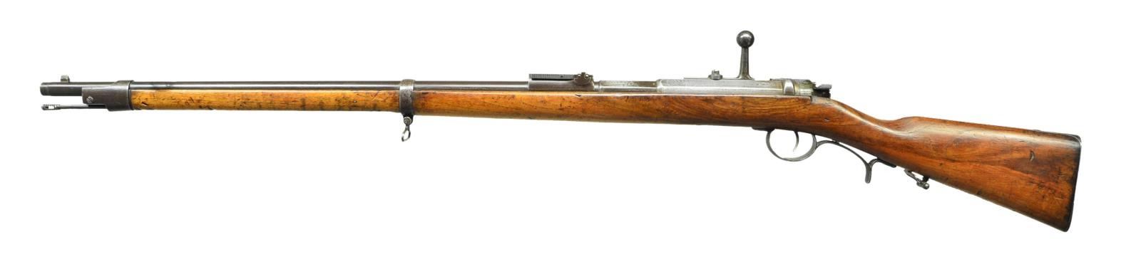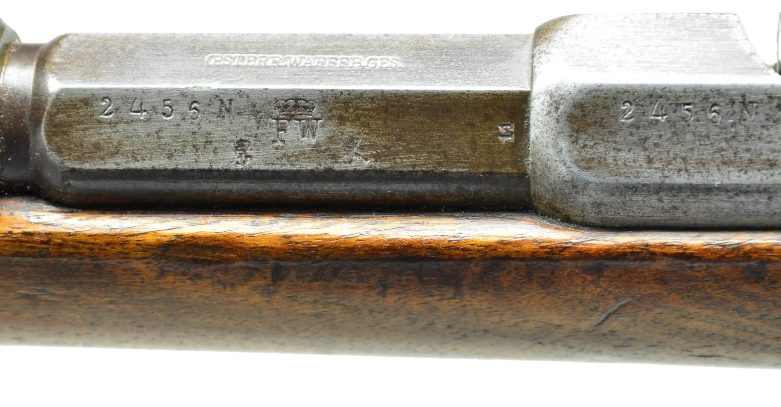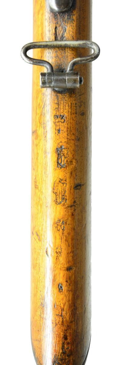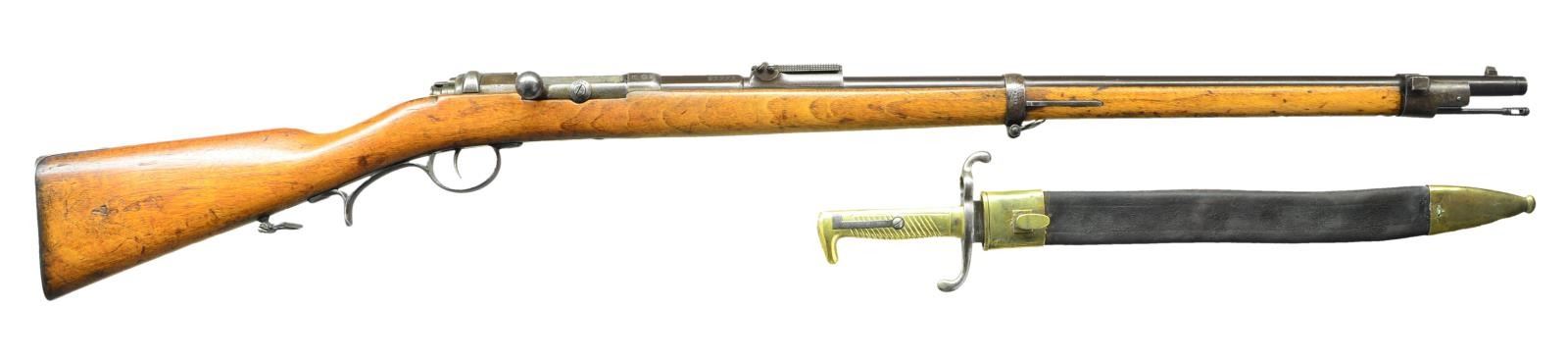 SHOT BOLT ACTION MILITARY RIFLE. Cal. 11mm Mauser. S# 2456N. All visible numbers match except buttstock has “23” at belly behind swivel. Bbl. 29 3/8". Ladder rear sight graduated to 1600 meters. Inverted V front sight. The Jaeger rifle saw extremely wide use. Primarily intended for light infantry (Jaegers) they were also issued to engineers, fortress troops & the Navy. Some were used aboard air craft in WWI to engage observation balloons using incendiary ammunition. The most notable use of the Jaeger rifle was to arm German Askari troops in the African colonies & they were widely used there notably in WWI. This rifle is marked on the buttplate tang “8.A.L.8.181.”. Receiver is marked on left top flat in Gothic “B Mod.71”. Receiver ring marked on top right flat w/ Imperial proofs & marked on receiver bridge “1875”. Bbl. is marked on top flat “OESTERR.WAFFEBGES”. Marked on right top flat w/ Imperial proofs & left top flat w/ crown “FW”. Bayonet stud on right side of upper band. Cleaning rod is present. These rifles have a stepped muzzle in order to accept a wide variety of bayonets. Bottom swivels on the lower band & at the belly of the stock. Trigger guard tang is curved to form the characteristic handgrip on these rifles. Walnut stock marked on right side w/ worn Imperial crown property marks & “7”. Marked at belly w/ crown acceptance marks. UNATTACHED ACCESSORIES: Model 1865/71 “Faschinenmesser” w/ 18 1/4" fullered saw back. These bayonets were used by pioneers for making brush wood fascines. Bayonet is marked on left Ricasso “E&H.NEURAUS SOLIGEN”. Cross guard is marked on left side w/ “R.E.13.114.”. Blade is marked on top “crown W75”. One piece cast brass handle w/ ribs on right side only. Leather scabbard w/ brass fittings. Throat is marked “A.T.A.7.166.”. Bayonet is in well worn condition. Has been cleaned; blade has been sharpened. Handle has wear & handling marks throughout. Scabbard has warping, loose fittings, wear & scuffing & does not allow bayonet to fully seat. CONDITON: stock has generally legible markings w/ moderate wear & handling marks throughout. Forend tip leaves sm. gap behind upper band. Metal is turning overall gray & patina w/ wear & light oxidation. Bore has strong lands but scattered oxidation & fine pitting throughout. (01-22342/RW). ANTIQUE. $900-1,200.
