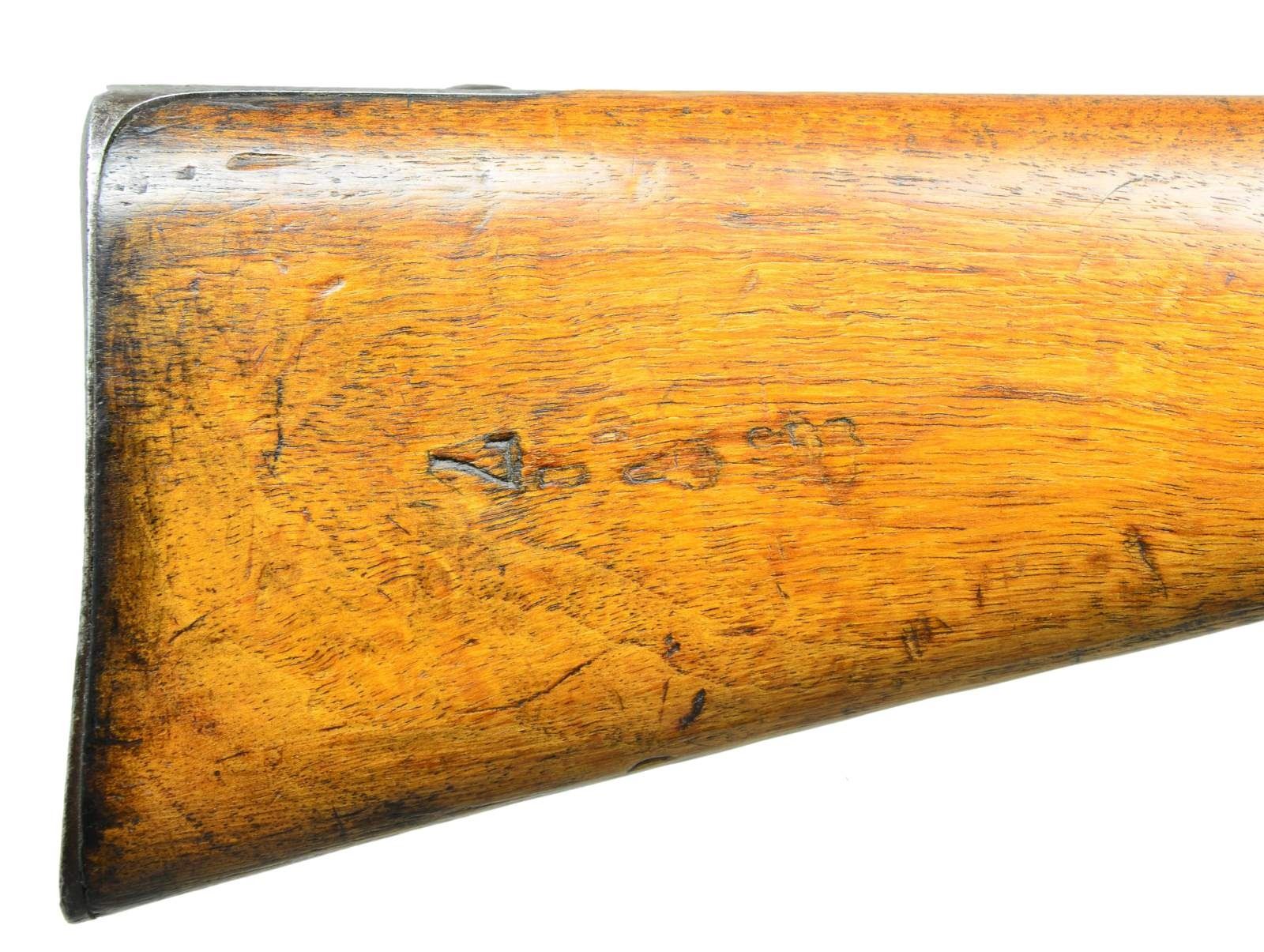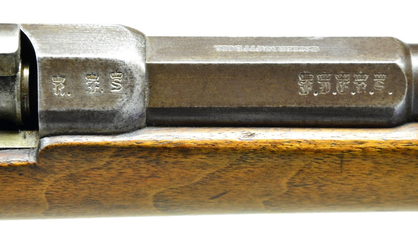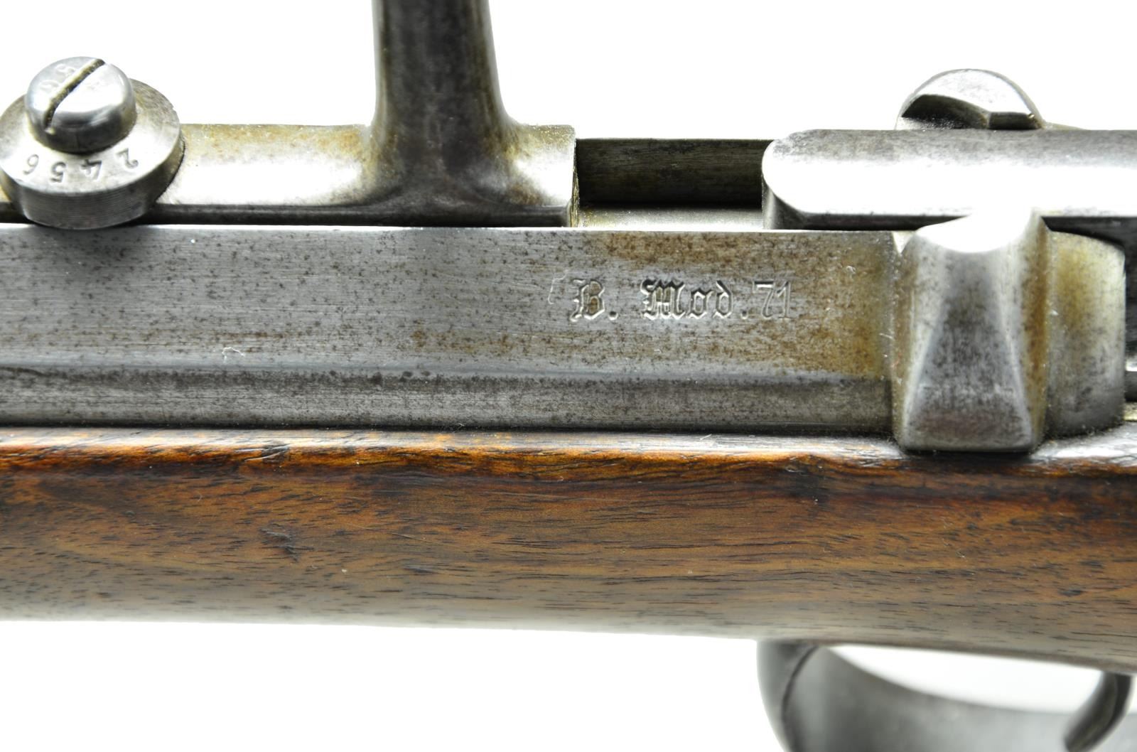 SHOT BOLT ACTION MILITARY RIFLE. Cal. 11mm Mauser. S# 2456N. All visible numbers match except buttstock has “23” at belly behind swivel. Bbl. 29 3/8". Ladder rear sight graduated to 1600 meters. Inverted V front sight. The Jaeger rifle saw extremely wide use. Primarily intended for light infantry (Jaegers) they were also issued to engineers, fortress troops & the Navy. Some were used aboard air craft in WWI to engage observation balloons using incendiary ammunition. The most notable use of the Jaeger rifle was to arm German Askari troops in the African colonies & they were widely used there notably in WWI. This rifle is marked on the buttplate tang “8.A.L.8.181.”. Receiver is marked on left top flat in Gothic “B Mod.71”. Receiver ring marked on top right flat w/ Imperial proofs & marked on receiver bridge “1875”. Bbl. is marked on top flat “OESTERR.WAFFEBGES”. Marked on right top flat w/ Imperial proofs & left top flat w/ crown “FW”. Bayonet stud on right side of upper band. Cleaning rod is present. These rifles have a stepped muzzle in order to accept a wide variety of bayonets. Bottom swivels on the lower band & at the belly of the stock. Trigger guard tang is curved to form the characteristic handgrip on these rifles. Walnut stock marked on right side w/ worn Imperial crown property marks & “7”. Marked at belly w/ crown acceptance marks. UNATTACHED ACCESSORIES: Model 1865/71 “Faschinenmesser” w/ 18 1/4" fullered saw back. These bayonets were used by pioneers for making brush wood fascines. Bayonet is marked on left Ricasso “E&H.NEURAUS SOLIGEN”. Cross guard is marked on left side w/ “R.E.13.114.”. Blade is marked on top “crown W75”. One piece cast brass handle w/ ribs on right side only. Leather scabbard w/ brass fittings. Throat is marked “A.T.A.7.166.”. Bayonet is in well worn condition. Has been cleaned; blade has been sharpened. Handle has wear & handling marks throughout. Scabbard has warping, loose fittings, wear & scuffing & does not allow bayonet to fully seat. CONDITON: stock has generally legible markings w/ moderate wear & handling marks throughout. Forend tip leaves sm. gap behind upper band. Metal is turning overall gray & patina w/ wear & light oxidation. Bore has strong lands but scattered oxidation & fine pitting throughout. (01-22342/RW). ANTIQUE. $900-1,200.