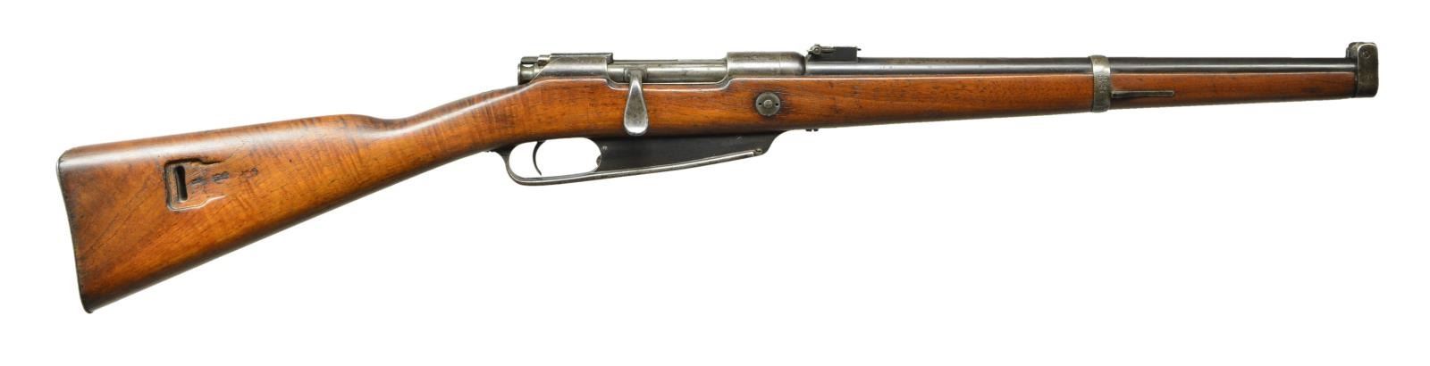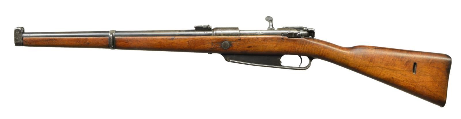CARBINE. Cal. 8mm Mauser. S# 8781. All visible numbers match. Bbl. 17 5/8". Ladder rear sight graduated to 1200 meters. Inverted V front sight w/ rounded profile viewed from the side. Nose cap has protective ears. Marked on the receiver ring w/ “crown ERFURT 1890”. Receiver ring also marked “S" which indicates the chamber was reamed out in 1905 for the new "S" cartridge. There is a punch mark above the "S" indicating the newer more conical shaped bbls. used from 1891 forward. The left rail is marked in Gothic “KAR.88" & "nm”. The "nm" indicates that the new bbl. is also made from an improved bbl. material & these bbls. were themselves stamped "nm" which is coved by the bbl. sleeve. Nose cap is unit marked “B.3.T.B.145.” Bbl. band w/ side swivel has partially lined out “B.2.U.2.8.”. Bolt handle is turned down, flattened type w/ coarse checkering underneath. Cocking piece has gas protector flange. Walnut stock marked on right side at sling slot w/ crown property marks. Flat steel buttplate. CONDITON: original finish stock w/ light wear & handling marks. Metal turning gray & patina w/ light wear & scattered spots of light oxidation. Fair worn bore w/ scattered spots of oxidation & fine pitting throughout. (01-22345/RW). ANTIQUE. $800-1,100.
