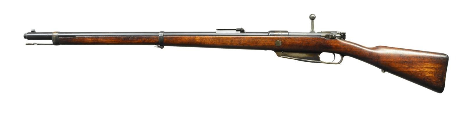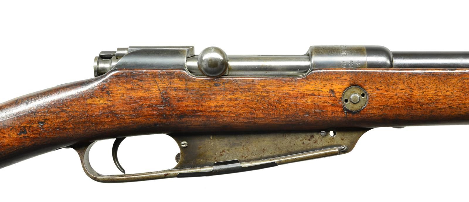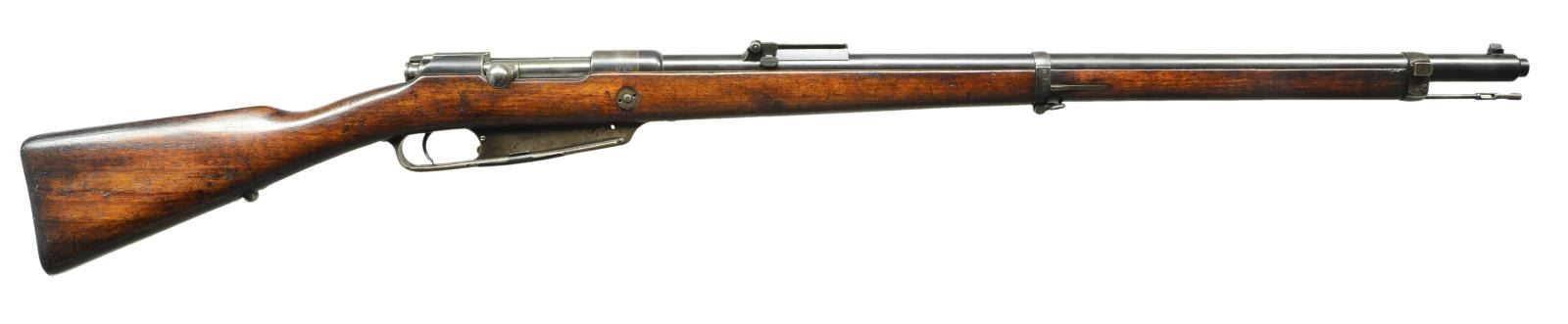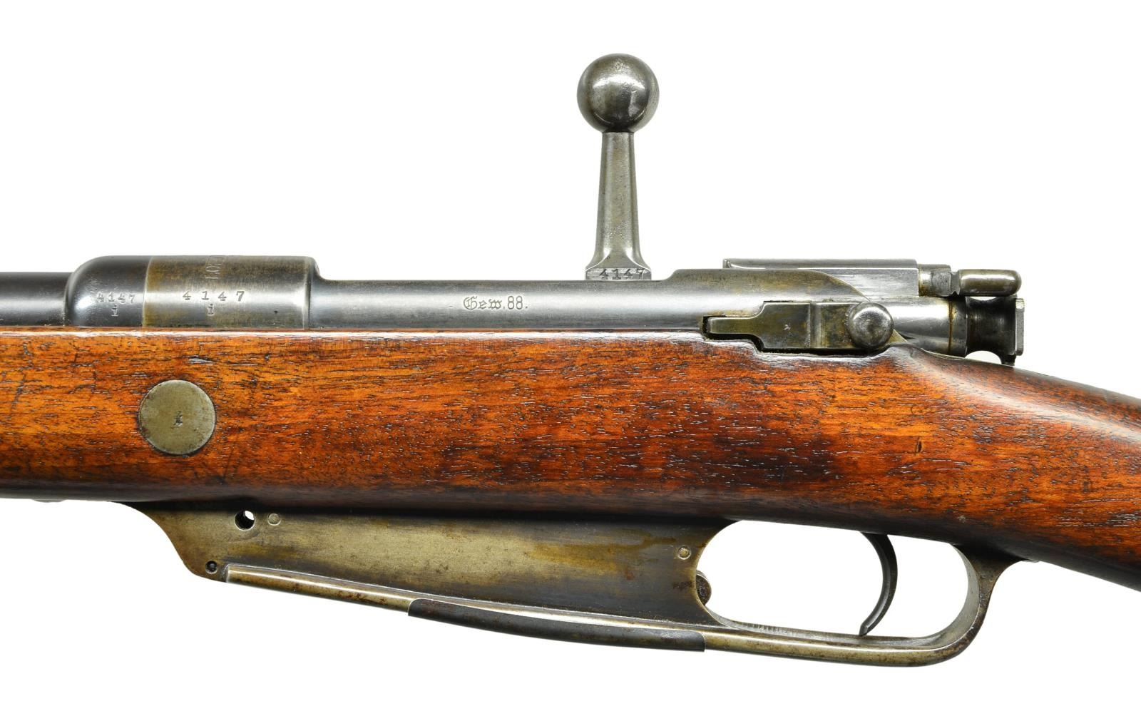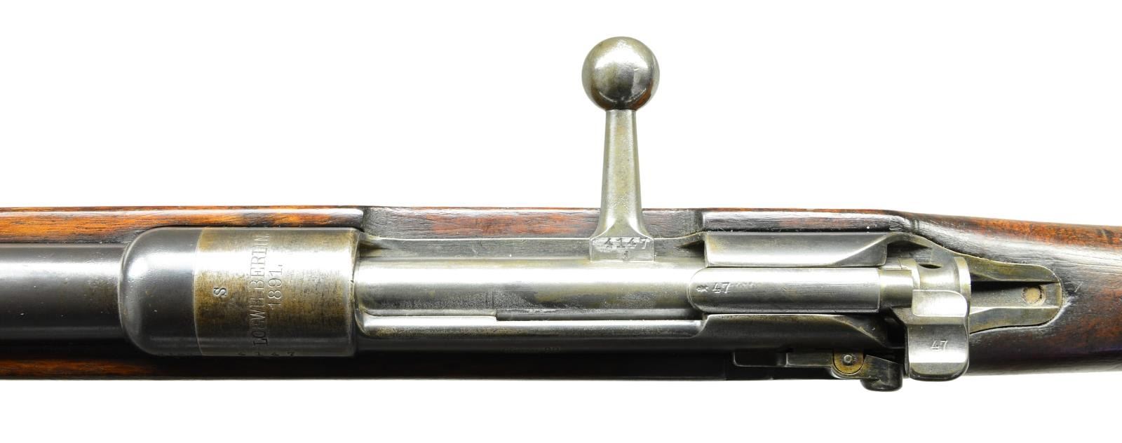 Cal. 8mm Mauser. S# 4147i. Matching numbers on receiver, bbl sleeve, bolt assembly & trigger guard assembly. Bbl. 29 1/4". Receiver ring is marked on top “LOEWE BERLIN”, “1891” & “S”. Ladder rear sight graduated to 2050 meters. Inverted V front sight. Double slot cleaning rod is present. Straight bolt handle. Bolt fitted w/ gas deflection flange. Bolt face is not undercut. Magazine fitted w/ dust cover & clip ejection spring. Upper band w/ bayonet lug. Lower band marked on right side “10.P.4.7.”. Walnut stock marked on right side of butt & under grip w/ Imperial acceptance marks. QD swivel is not present in base. UNATTACHED ACCESSORIES: unmarked 5 rd. end block clip. CONDITION: stock has attractive original finish w/ light wear & handling marks & legible markings. Forend has 2 1/2" missing chip at wood line on left forward end. Metal has 60% thinning blue turning gray w/ light wear. Bore is shiny, but w/ worn lands. (01-22732/RW). ANTIQUE. $600-900.