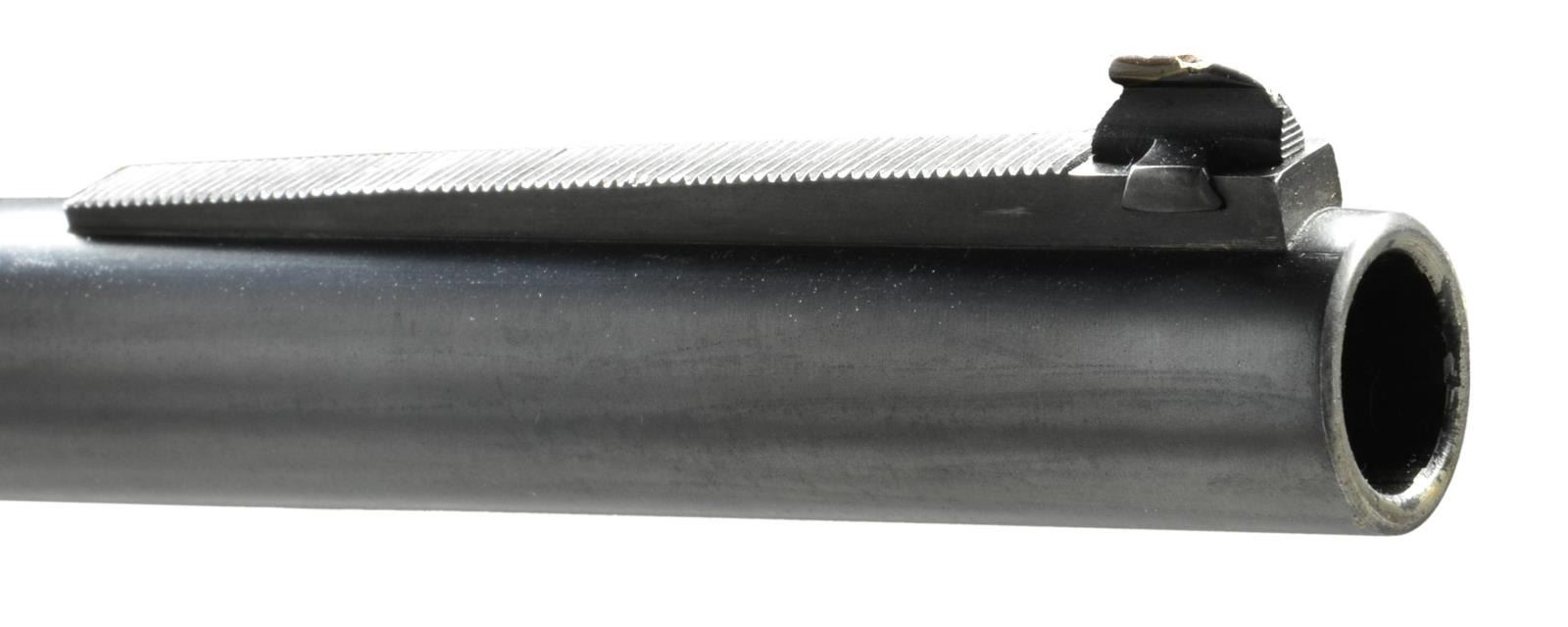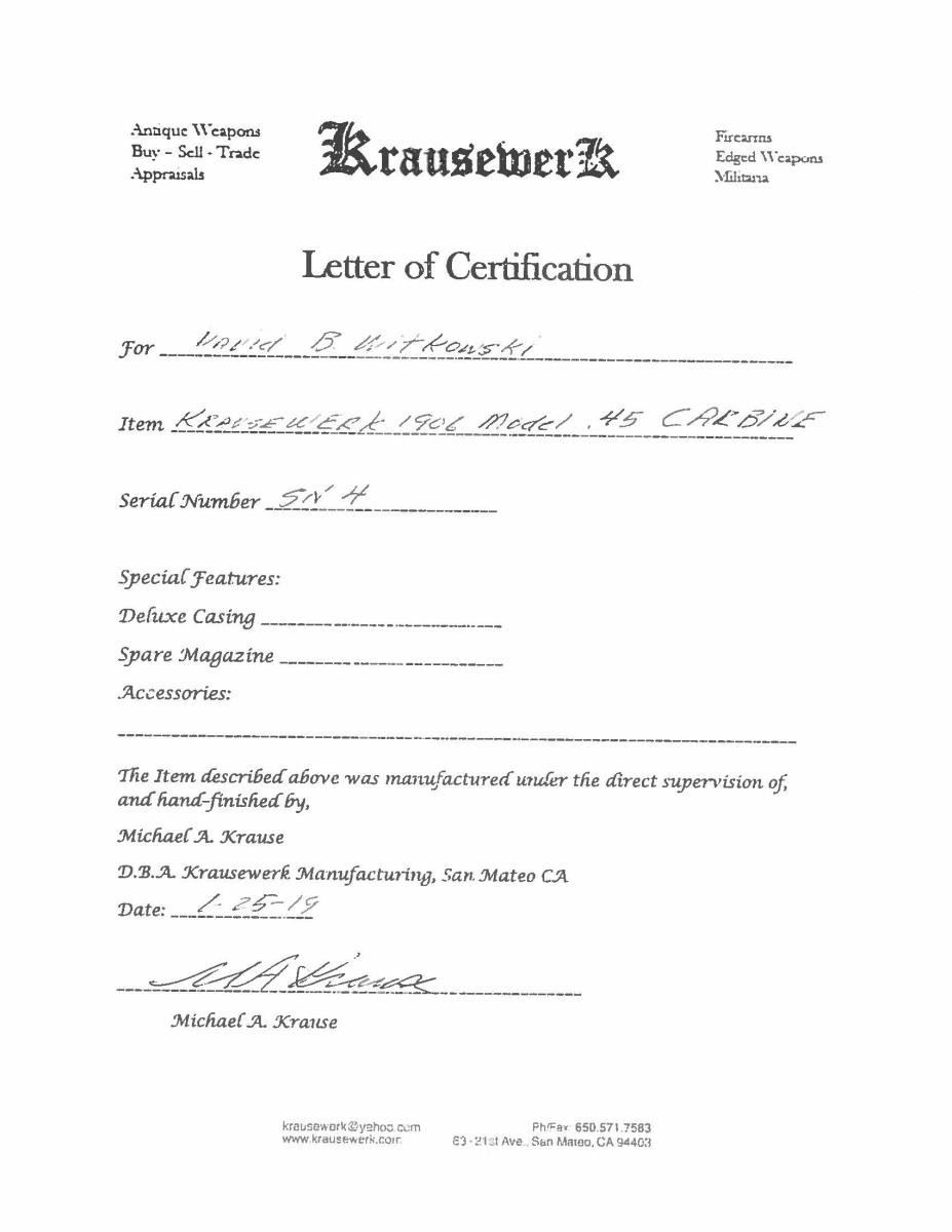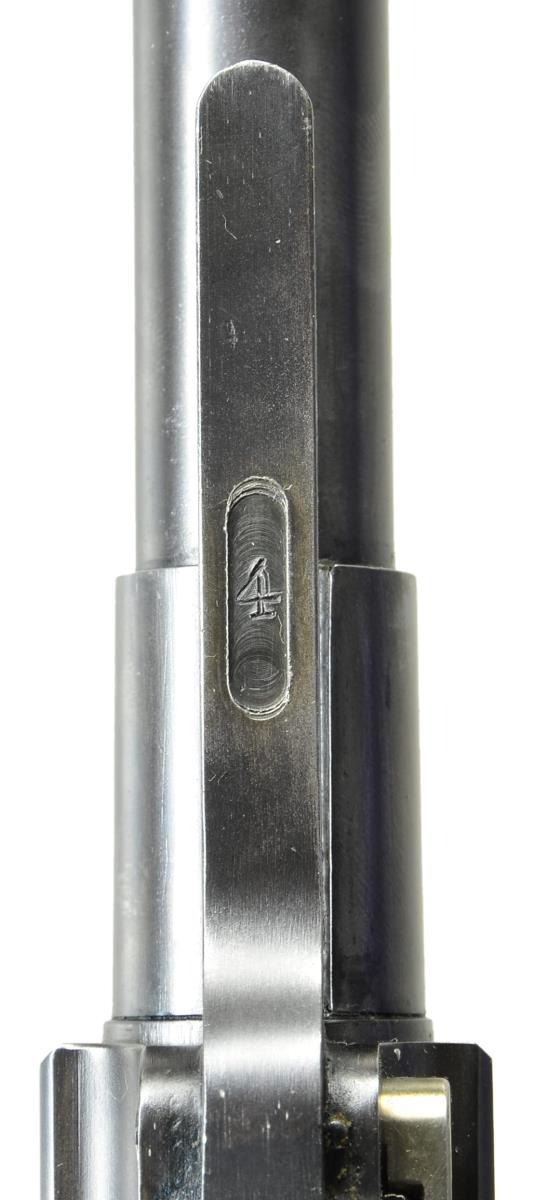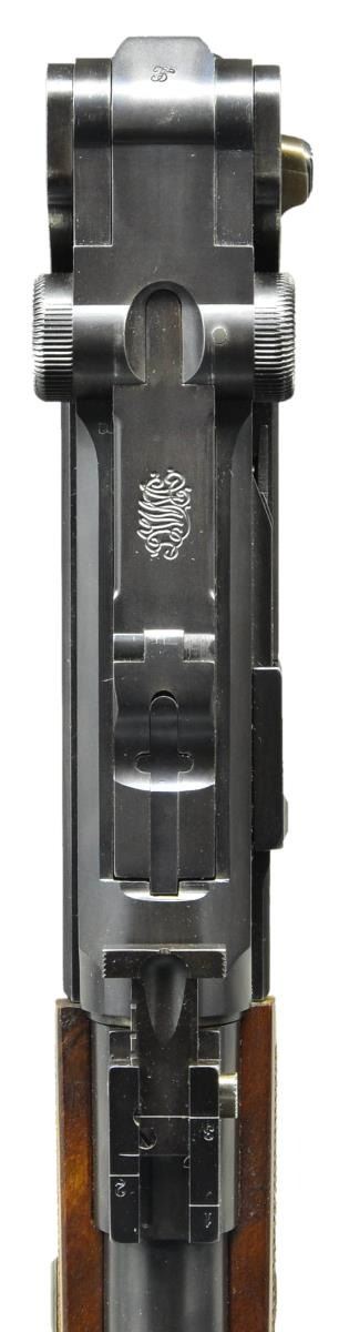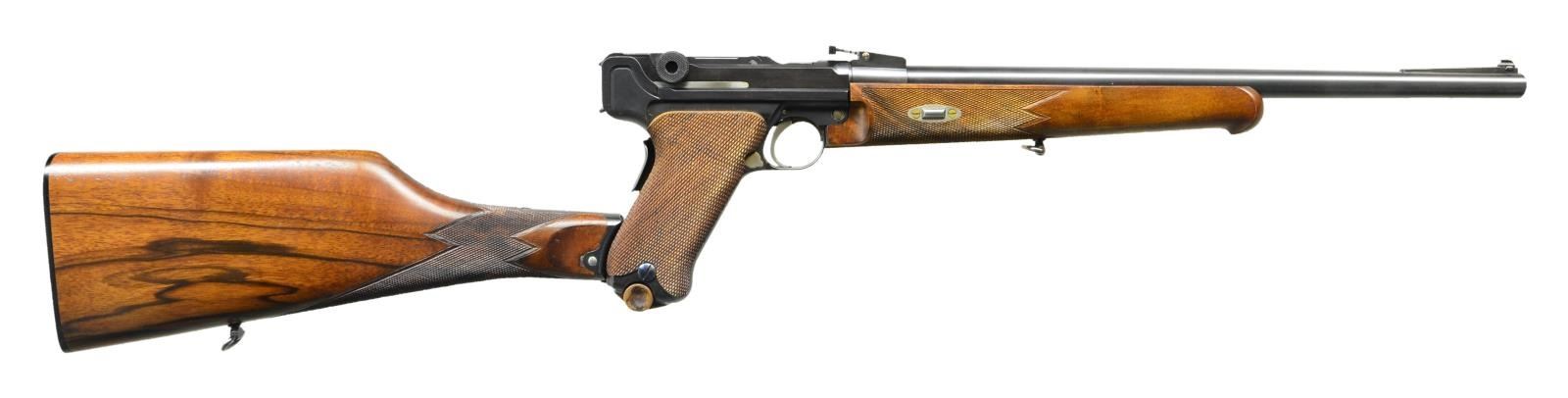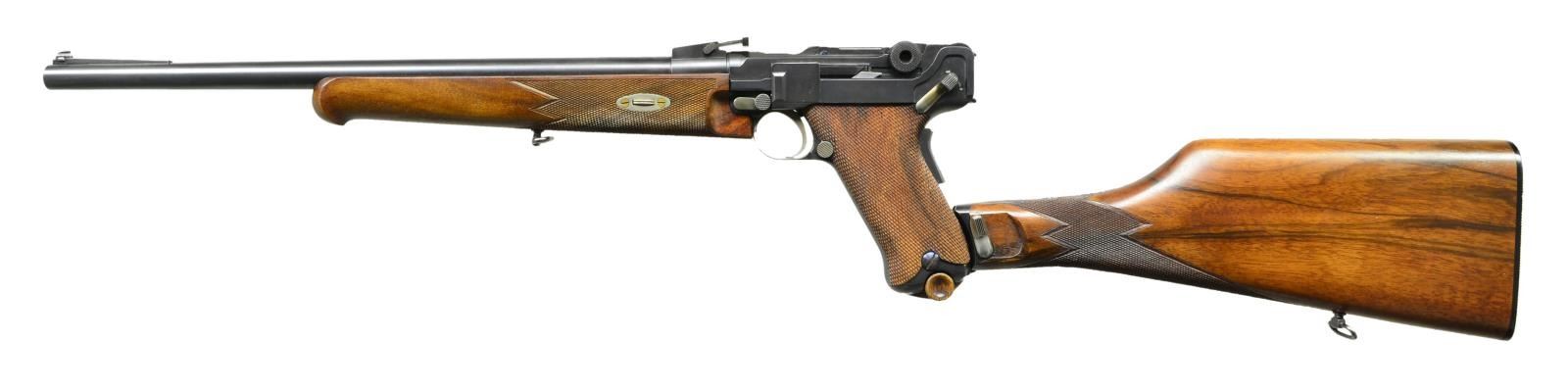 CARBINE. Cal. 45 ACP. S#4. Although Krauswerk has long been known for making the best quality reproduction M1906 .45 cal and Baby Lugers. What most collectors don't realize, is that Krauswerk also made at least 2 .45 ACP Luger carbines! Although the S# on this example is "4", it is not known if the guns were made consecutively as the consignor was very specific in wanting a S# 4 carbine to match the SN of his M1906 & Baby Luger. The carbine was made using the same equipment as for the M1906 pistols, modified to have a longer bbl., a forward frame extension for forearm attachment, a modified rear toggle (still marked w/ the intertwined "GL" but devoid of the rear sight), & a backstrap with integral lug for shoulder stock attachment. The only other marking was the intertwined "DWM" on the middle toggle link & the S# "4" applied to the forward frame extension. The bbl. measures 16.25" long &, as per the original carbine, has a long serrated ramped base leading to a bead-profile dovetailed front sight. The sliding rear sight is mounted in front of the receiver & is graduated w/ "1", "2" & "3" markings. Trigger, safety lever & grip safety are per the standard production guns. Fitted w/walnut checkered panels. The unmarked shoulder stock is very similar to that of the standard carbine in having a 2-screw lug, a locking lever on the left side & a serrated buttplate secured w/ 2 screws. The forend & buttstock are checkered to emulate the original & each are fitted w/ rotating sling swivels. MAGS: folded metal mag. whose plug is secured by 2 pins. CONDITION: the carbine presents as new & unfired though the buttstock has a few microscopic handling marks. Frankly, if you want the biggest, baddest Luger Carbine in the United States, this may be your only opportunity!