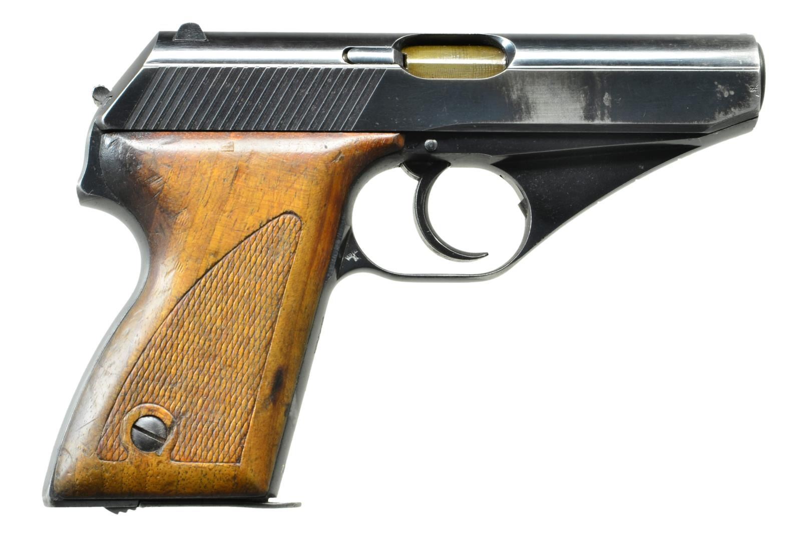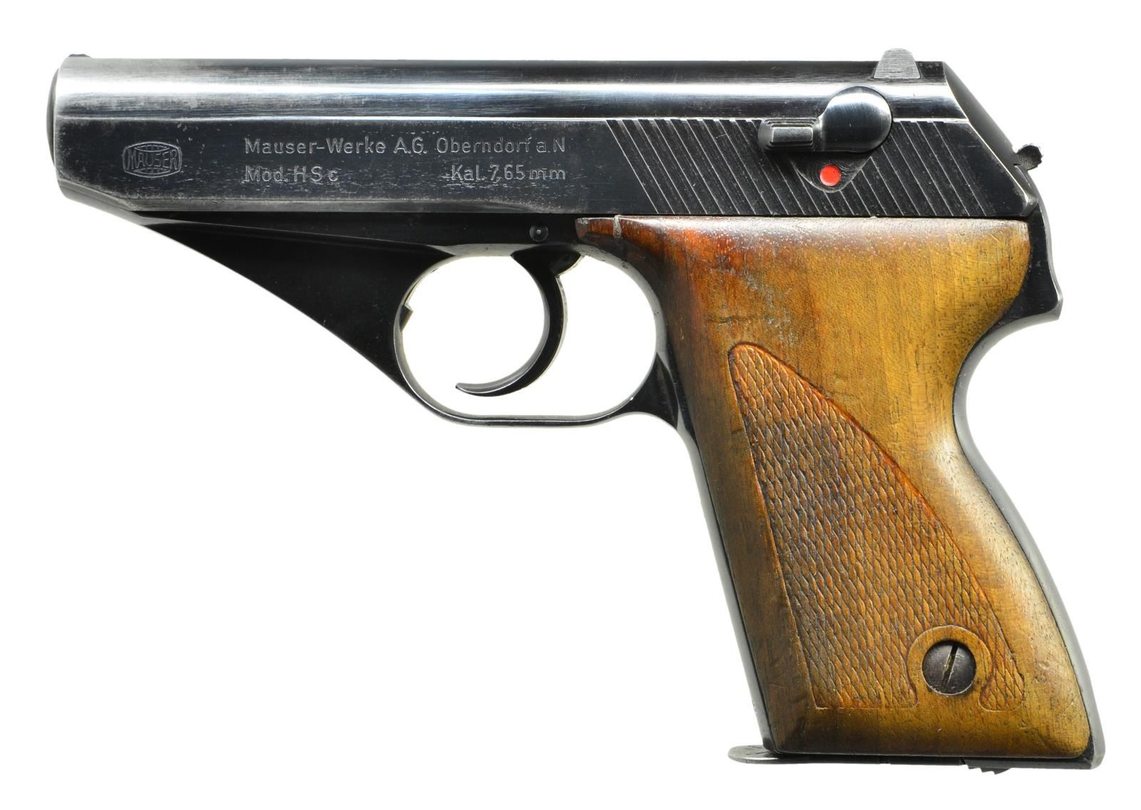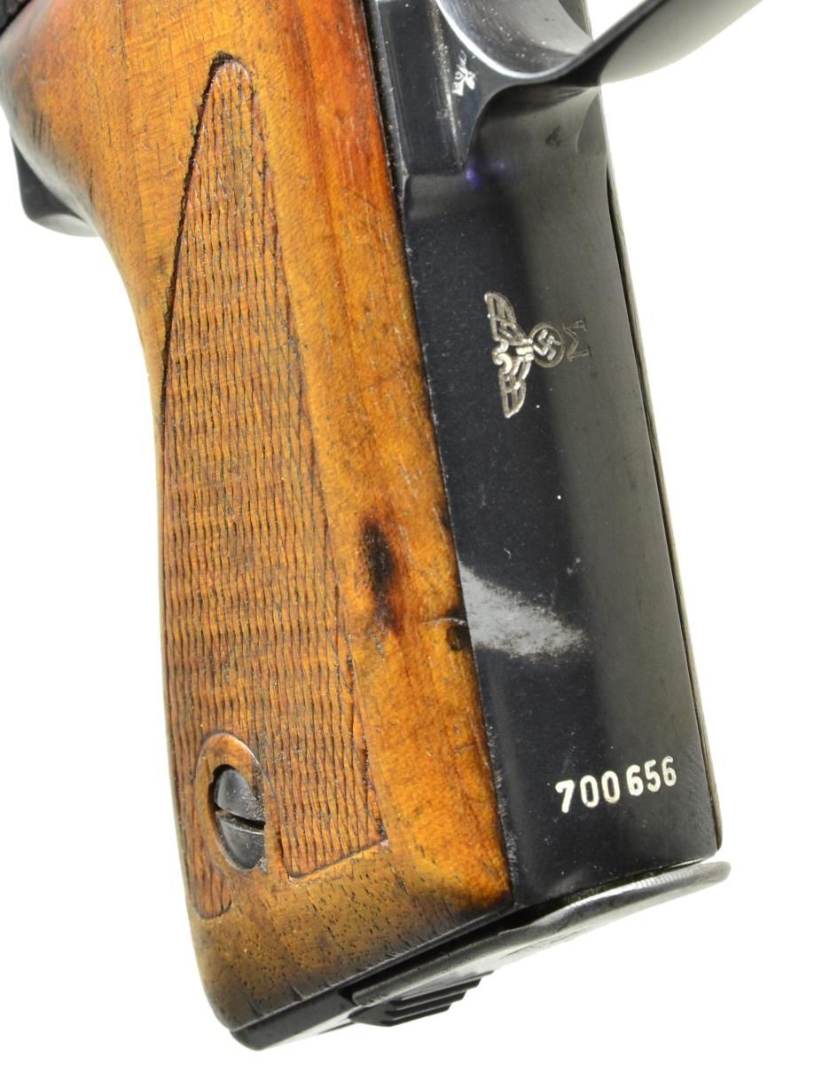 NAVY, MATCHING. Cal. 7.65mm. S# 700656. Standard configuration, early production HSc, w/ low grip screw as procured by the Nazi Navy. This high polish blued gun has fixed front sight, matted channel & drift adjustable rear sight. Left side of slide w/ Mauser banner followed by 2-line address referencing manufacturer, model & cal. Highlighted "S” (white) & red dotted safety markings. Eagle "N" proofing in usual locations. Full S# on bottom of front strap reflecting this as the 656th HSc made by Mauser. A pantographed Kreigsmarine eagle /"N" on front strap under trigger guard. Correct mag. w/ in the white body & rounded Mauser banner floorplate. Disassembly shows matching electropenciled "656" inside slide. Bbl. not numbered; proofed only. CONDITION: VG plus original salt blue w/ holster wear in expected areas, especially over forward portion of slide and holster rub mark on front strap. Comparable condition grips, the left panel having had had the forward tip neatly repaired, and mag. Mirror bright bore w/ very shallow ring/bulge. Proper manual mechanics except for stickiness upon full retraction. One of the rarest and most desirable HSc’s, rarely offered for sale, a “Holy Grail” piece for any Mauser or WWII military collector! (22-3047/LMA). CURIO. $7,500-12,500.