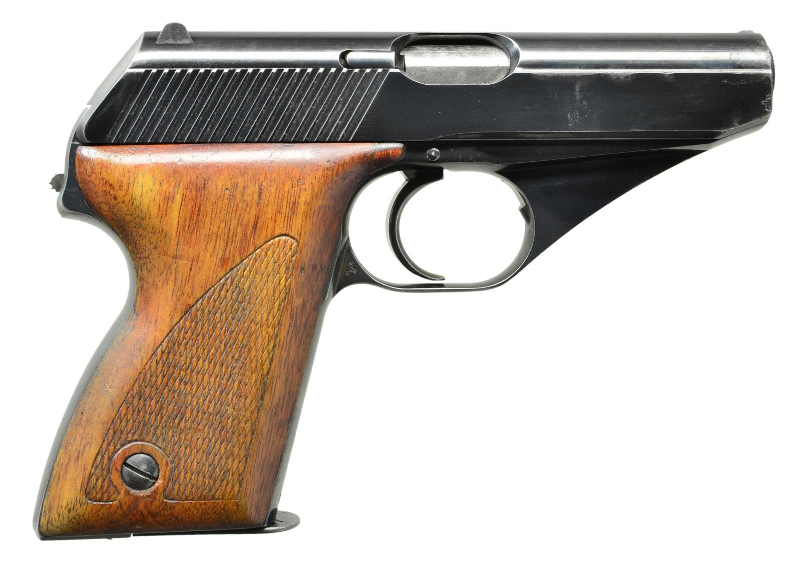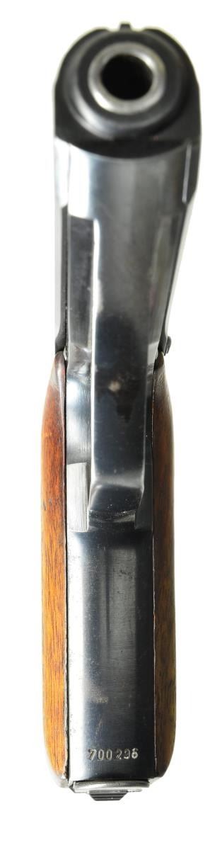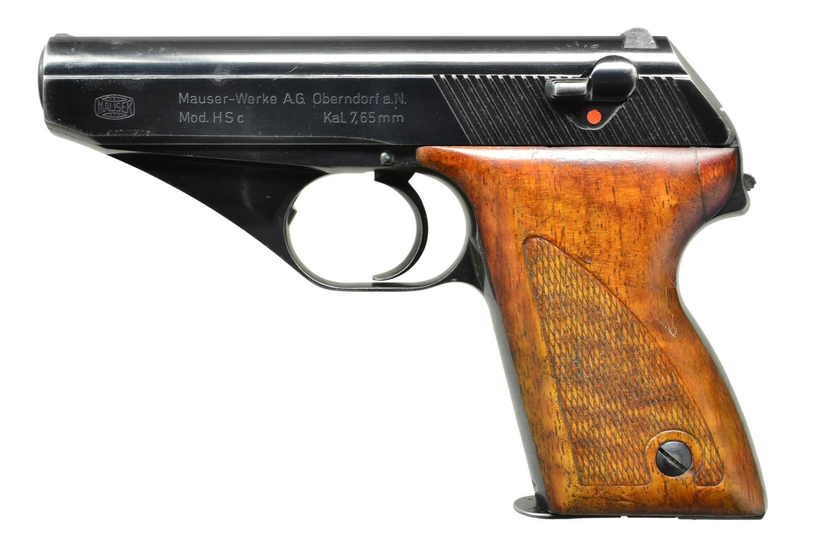 PISTOL, MATCHING. Cal. 7.65mm. S# 700296. Scarce early commercial production HSc, w/ low grip screw, this high polish example being the 296th pistol mfg. Fixed front sight, matted channel & drift adjustable rear sight. Left side of slide w/ Mauser banner followed by 2-line address referencing manufacturer, model & cal. Highlighted "S” (white) & red dotted safety markings. Eagle/N proofing on right side of slide & trigger guard. Full S# on bottom of front strap. Wood grips w/ impressed checkering. Correct mag. w/ in the white body & rounded Mauser banner floorplate. Disassembly shows matching electropenciled "296" inside slide and repeated as a stamping on bbl. MAGS: 1-8 rd. mag. CONDITION: 95-97% bright original salt blue w/ holster wear around the muzzle & other sharp edges consistent w/ light-moderate field use. Comparable condition grips, the left panel having a repair top rear; right panel having the forward tip glued in place. VG+ mag. Right side of body w/ staining. Floorplate comparable to balance of pistol. Mirror bore w/sharp rifling. Perfect manual mechanics. A great, no-excuse, low grip screw HSc, sure to be the high point of any Mauser pocket pistol collection. (22-3049/LMA) CURIO. $5,500-8,500.
