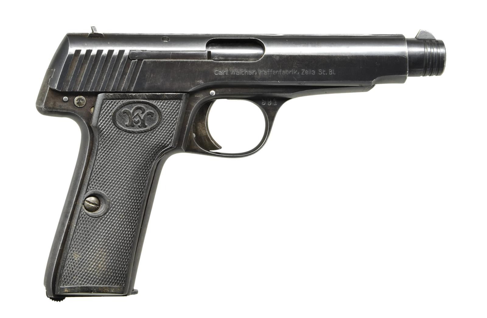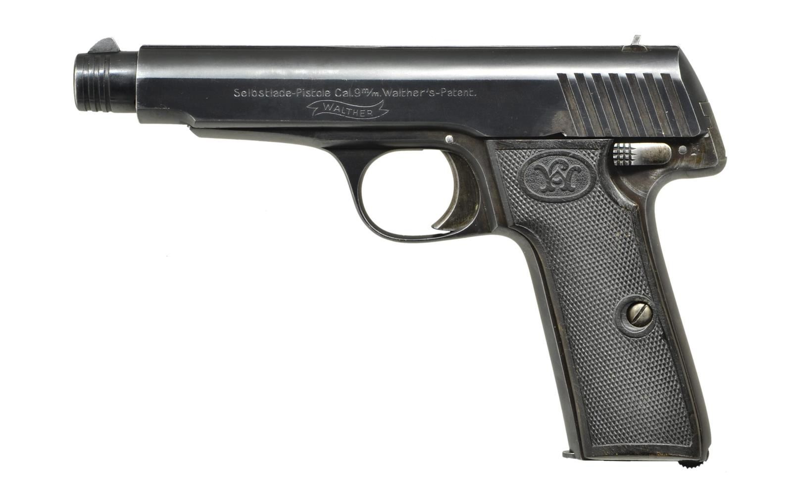 Cal. 9mm Luger. S# 591. Bbl. 4 7/8". Mfg. 1915-1917; approx. 1,000 units. Blow back design w/ heavy recoil spring. Coarse checkered safety lever w/ “S” & “F” positions. Similar to smaller cal. Model 4 but ejects to right. Border checkered Walther logo hard rubber grips. MAGS: 1 very good unmarked factory 9 rd. CONDITION: good to very good overall appearance w/ light handling marks, function wear, high point wear & light pitting at rear of frame above backstrap. Very good appearing grips w/ slight handwear, occasional small edge mark & small crack behind right screw. Very good to excellent bore w/ hint of frosting. (22-5763/NW). CURIO. $4,000-6,000.