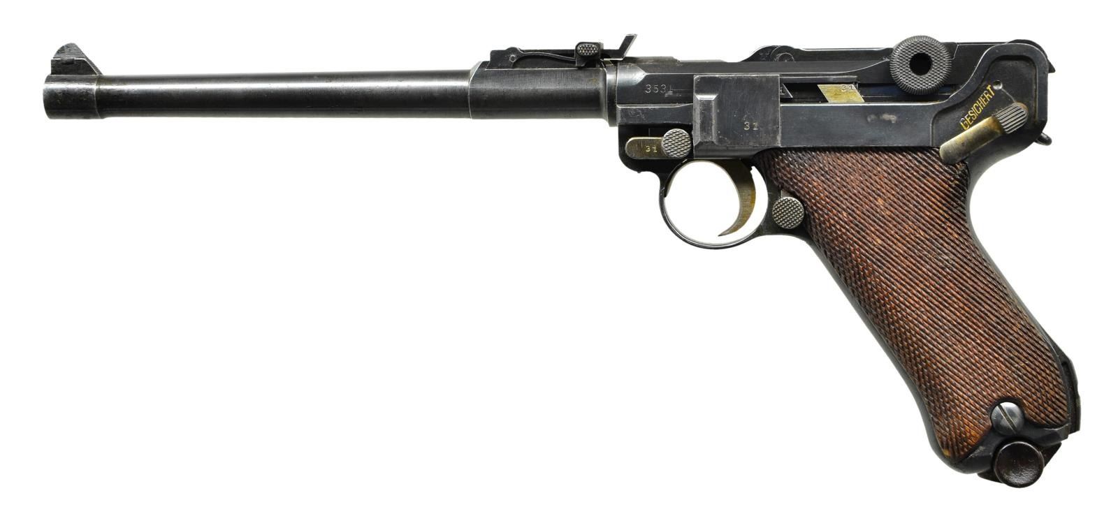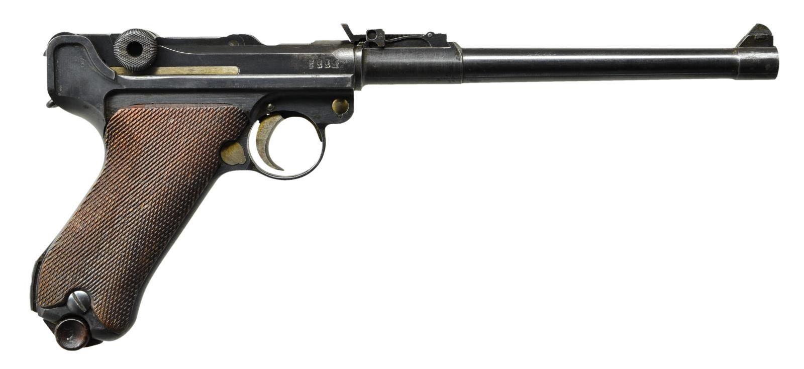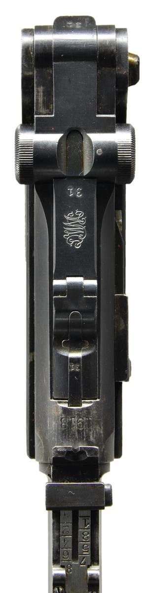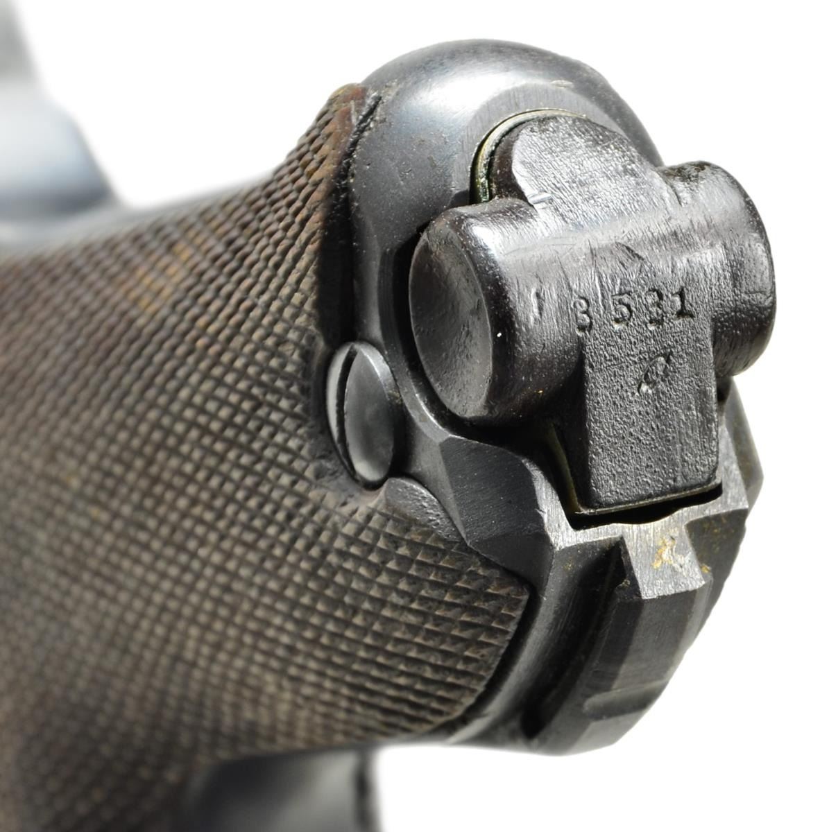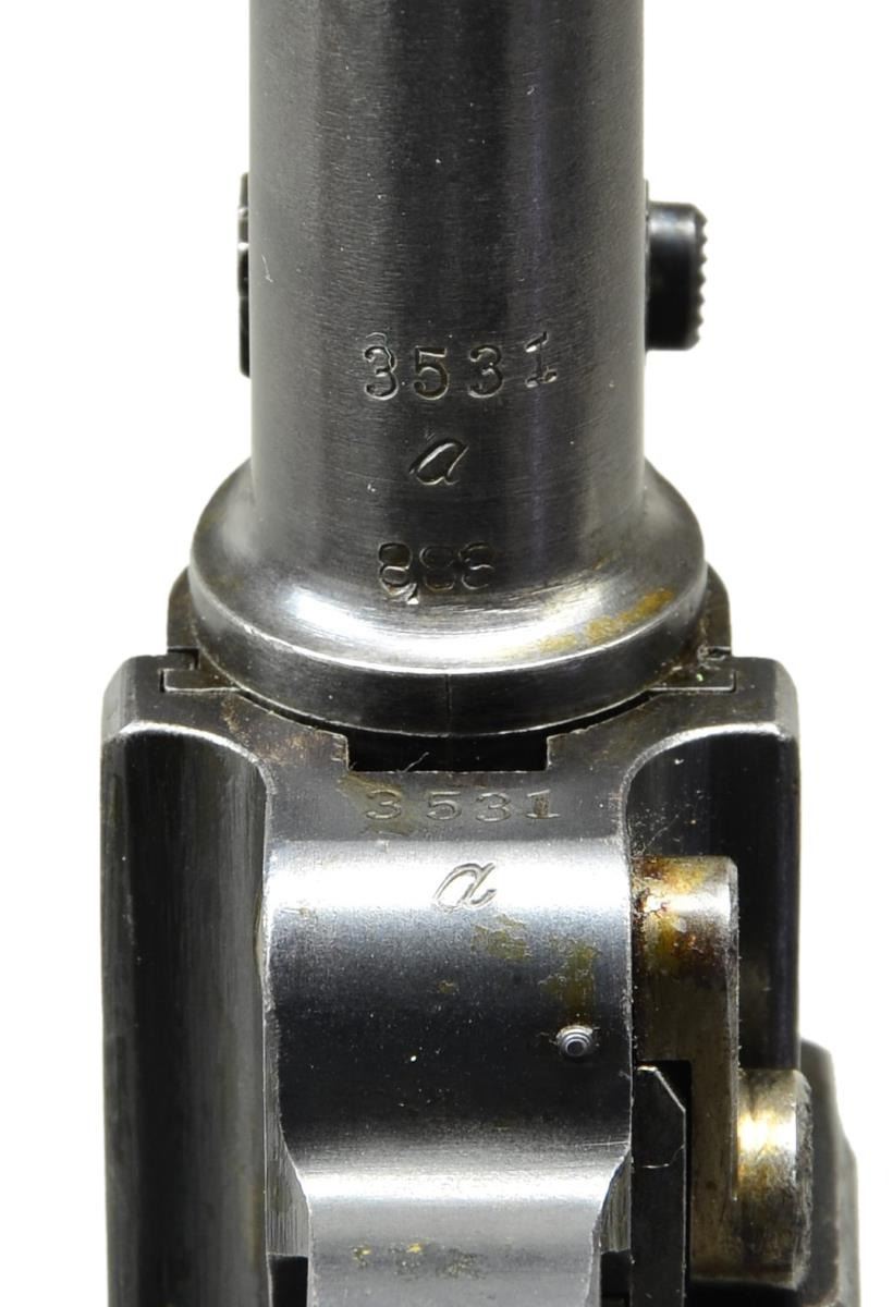 Cal. 9mm Luger. S# 3531a. Bbl. 8" w/ full matching S#, fin shaped front sight & tangent rear w/ all components matching numbered; sights w/out fine tune adjustment. Mfg. 1918 (dated over chamber). Approx. 55,000 mfg. 1914-1918; 25,000 in 1918. All matching numbers to include: receiver, sear, trigger, takedown lever, sideplate, safety lever, safety bar, hold open latch & all components of toggle assembly. Replacement Mauser checkered walnut grips having eagle 655 proofs on back of each plus "V" on right & "Q" on left. Strawed sm. parts, correct receiver proofs, appropriate internal areas in the white & stock lug. All markings well defined. MAGS: 1 tin plated 8 rd. w/ matching numbered wood base but no proof mark. CONDITION: good to very good overall appearance w/ areas of light pitting & staining. Pronounced pitting on sides of frame under grips slightly bleeding out onto grip straps. Very good straw colors w/ spots of staining on safety & takedown levers. Hand worn grips w/out damage yet having areas slightly proud of frame. Near excellent bright bore w/ hint of wear. (22-5676/NW). CURIO. $1,750-2,250.