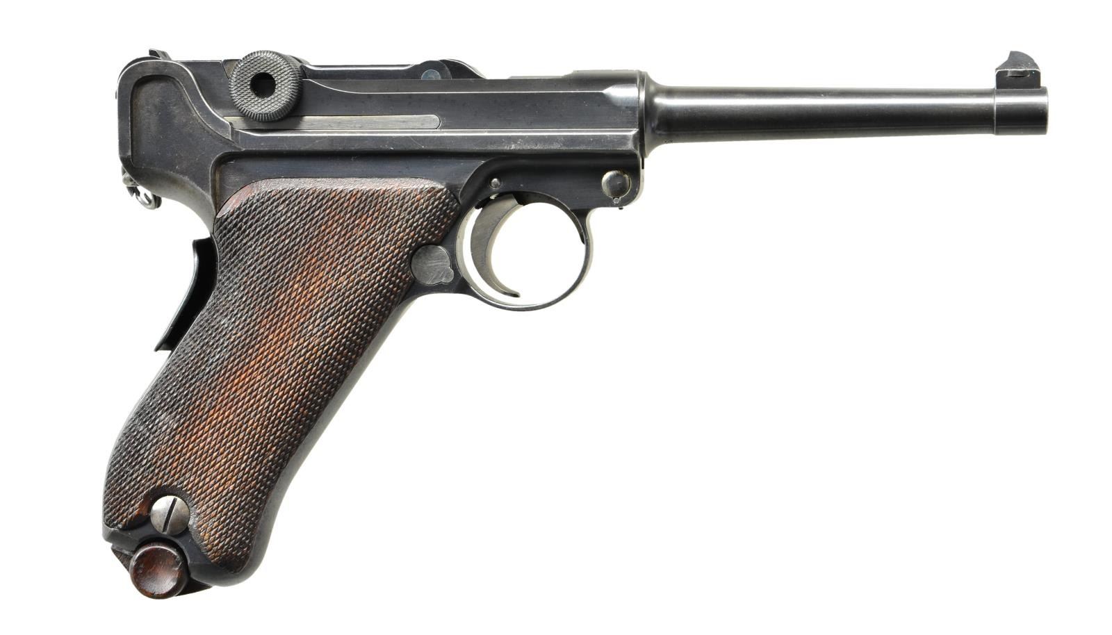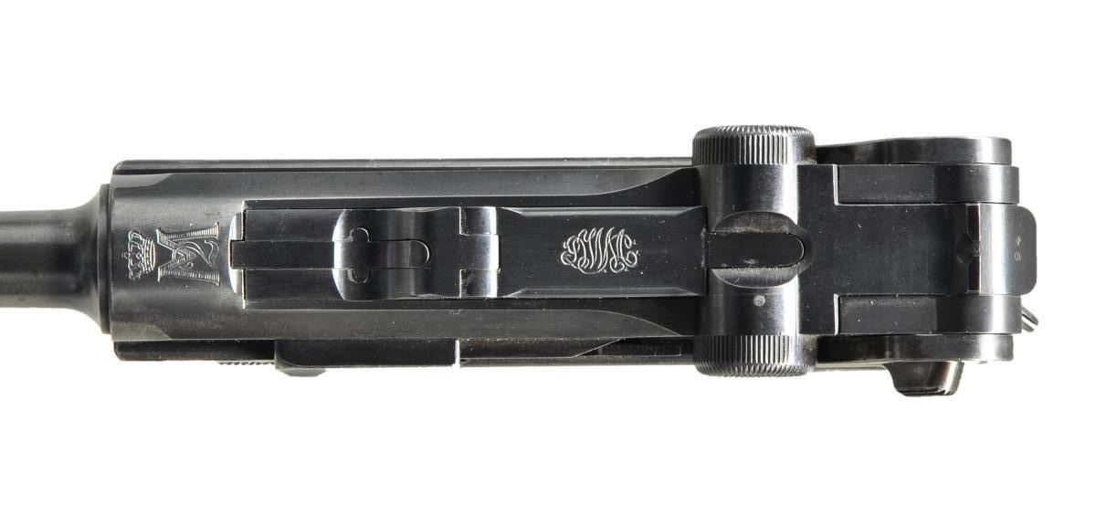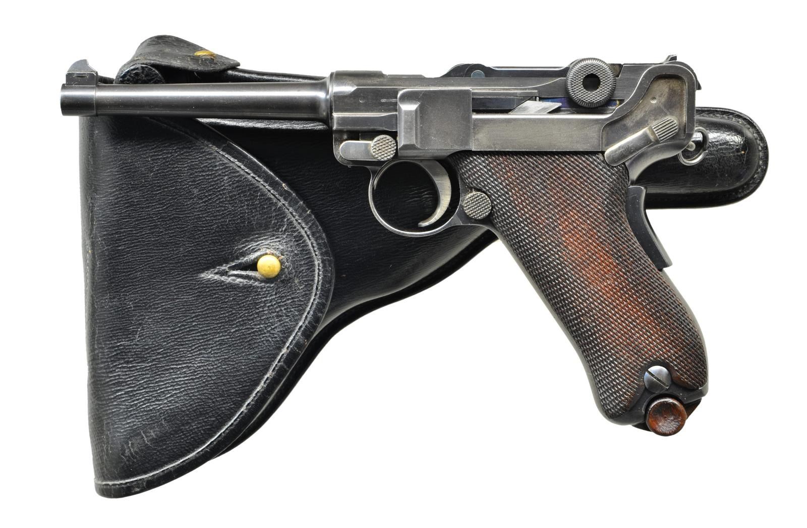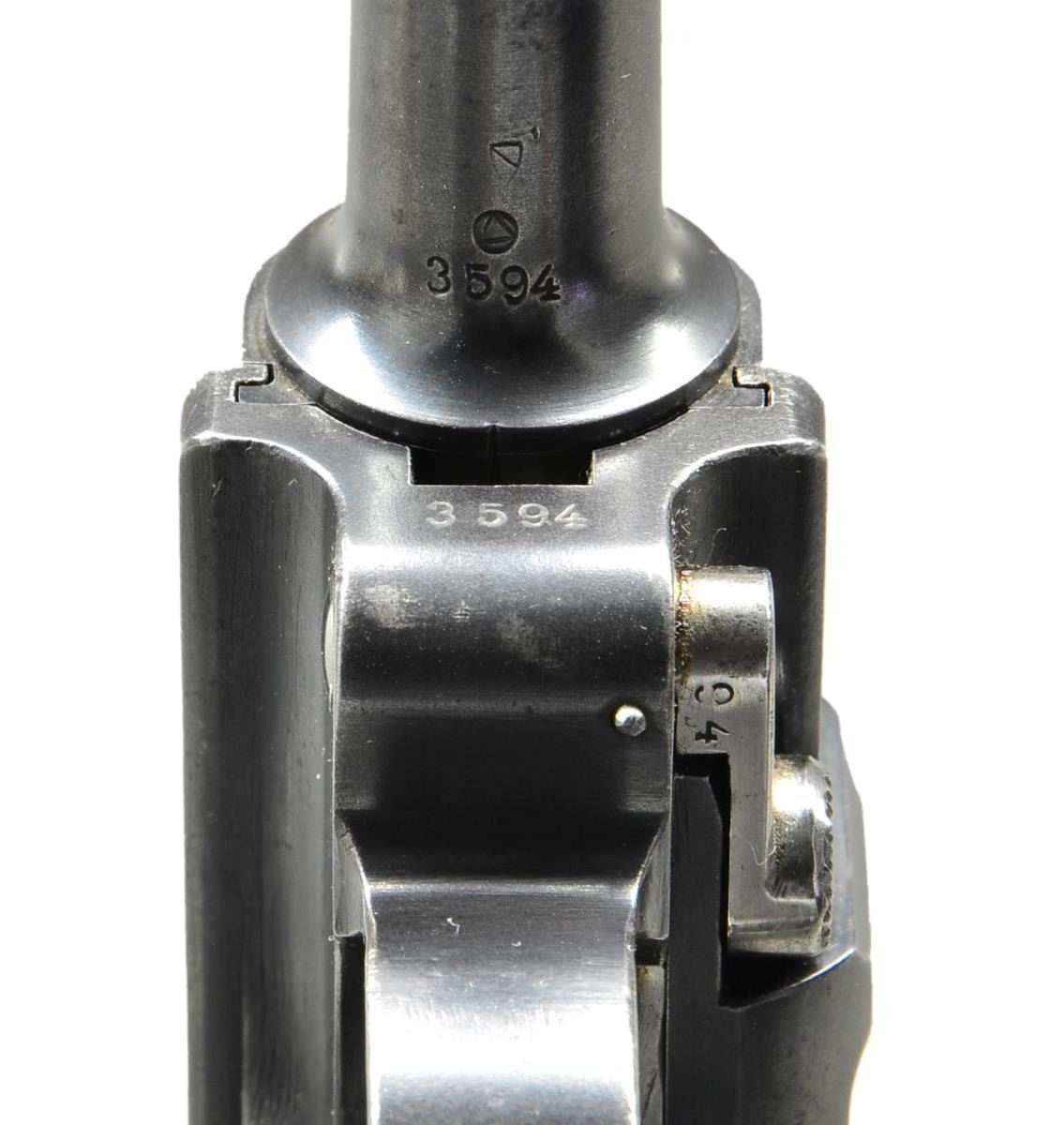 SEMI-AUTO PISTOL. Cal. 7.65mm (30 Luger). S# 3594. Bbl. 4 3/4" w/ matching number and saw tooth blade front sight; notched toggle rear. "Crown M2" over chamber representing King Victor Manuel II. Approximately 5,000 manufactured within S# 1-5000; highest known is S# 4460. Matching numbers on toggles, breech block, grip safety, sideplate (bottom edge), extractor ("CARREGADA" marked), trigger, takedown lever (bottom), receiver (bottom lug), barrel and both grips (left additionally marked "h" and right additionally with "V"). Left front receiver has triangle within circle proof as does bottom of barrel and rear of frame. Sear numbered "86". Safety position polished bright; safe with lever up. Frame without stock lug; has wide trigger and narrow trigger guard plus ring attached to lanyard loop. MAGS: 2 correct nickel plated 8 rd. with wood bases having circle triangle proofs. Conditions are fair to good with stained metal finish and very good. UNATTACHED ACCESSORIES: exceptional appearing black flap holster with brown interior and back. Black interior pouch for near excellent unmarked original appearing loading tool. Very good to excellent cleaning rod with oil cup handle. Single 1 1/2" angled black belt loop on back and flaps retained by brass studs. A.E. (Arsenal do Exercito) marked holster w/out a date; actually manufactured in various holster and saddlery shops that were under its preview. Very light scratching on back of holster to include cursive "Maria". CONDITION: very good overall appearance with high quality refinish. Mag. release normally strawed (as are other parts) but checkered portion is blued and opposite side polished bright as are trigger, takedown lever, ejector and safety lever. Safety sear bar in the white along with appropriate internal areas. Very good grips with light hand wear to diamond tops along with couple of small areas of slightly flattened tops. Fair worn bore somewhat dark with even pitting throughout. (22-5555/NW). CURIO. 2,000-3,000.
