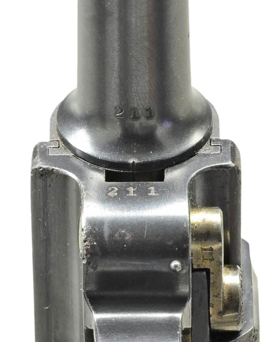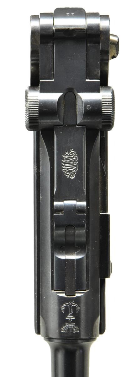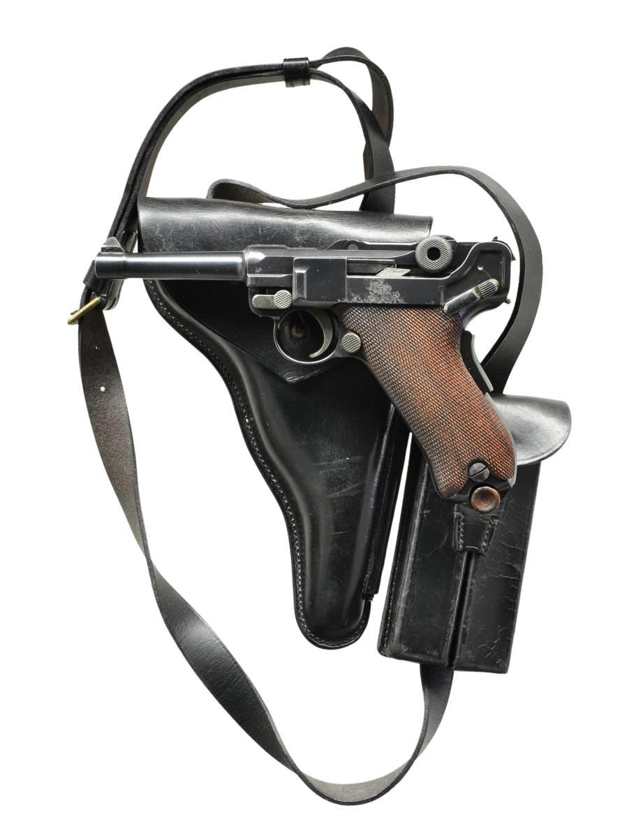 SEMI-AUTO PISTOL. Cal. 9mm Luger. S# 211. Bbl. 4" w/ fin shaped front sight & 211; receiver lug with 11 plus 2 in front of lug and crown anchor over chamber. Very rare example from Portuguese late 1909 order for 1,000 pistols of which about 350 delivered under King Manuel II (this pistol) then approximately 300 delivered after the King's overthrow in 1910 having a slight change in the inscription over the chamber to be "R.P." over the anchor. This first batch is extremely rare with Arron Davis' reference book reporting only 6 known. Balance of info listed is a melding from Davis' plus Sturgess' "Borchardt & Luger" Volume II beginning on page 679. Number 11 on trigger, takedown lever, grip safety, sideplate, toggles and breech block. Checkered walnut grips with "6" and "0" on left plus "Y" and "8" on right. Safe with lever in upward position exposing polished bottom area. Extractor properly marked "CARREGADA" (numbered 67). Correctly strawed small parts plus appropriate internal areas are in the white. Left front of receiver with intertwined "MP" proof. MAGS: 1 correct nickel plated 8 rd. with wood base marked "Cal. 9m/m" in script; correct for some examples (most unmarked and all without proofs). Cleaned staining on body and very good base. UNATTACHED ACCESSORIES: exceptional black flap holster w/ attached shoulder straps having dual mag. pouch; all leather unmarked. Original appearing unmarked loading tool and brass cleaning rod with oiler handle. Navy Luger style including length of cleaning rod (protrudes beyond compartment) yet shorter for 4" barrel. Interior of holster, mag. pouch and back of straps is brown with balance black to include tool pouch. Copy of hand written Portuguese contract of 23 November 1909 for 350 Luger pistols with ammo and accessories (referenced in Sturgess' Volume II page 679) as copied from Navy Archives in Lisbon, Portugal. CONDITION: good to very good appearance as refinished over some pitting (left flat of frame and opposite side to include receiver). Occasional areas of peppery oxidation and prior light pitting. Slightly faded straw colors and hint of staining with appearance of cleaning on safety lever. Very good plus left grip; right has some minor marks but still good to very good. Near excellent bore with some light pitting on crown. (22-5557/ZAL). CURIO. $2,500-4,000.