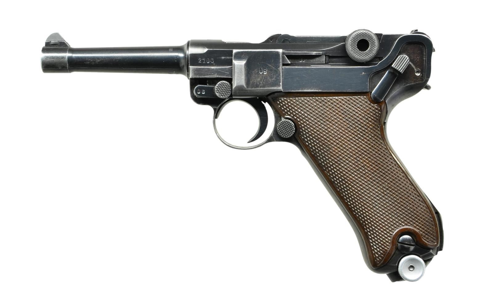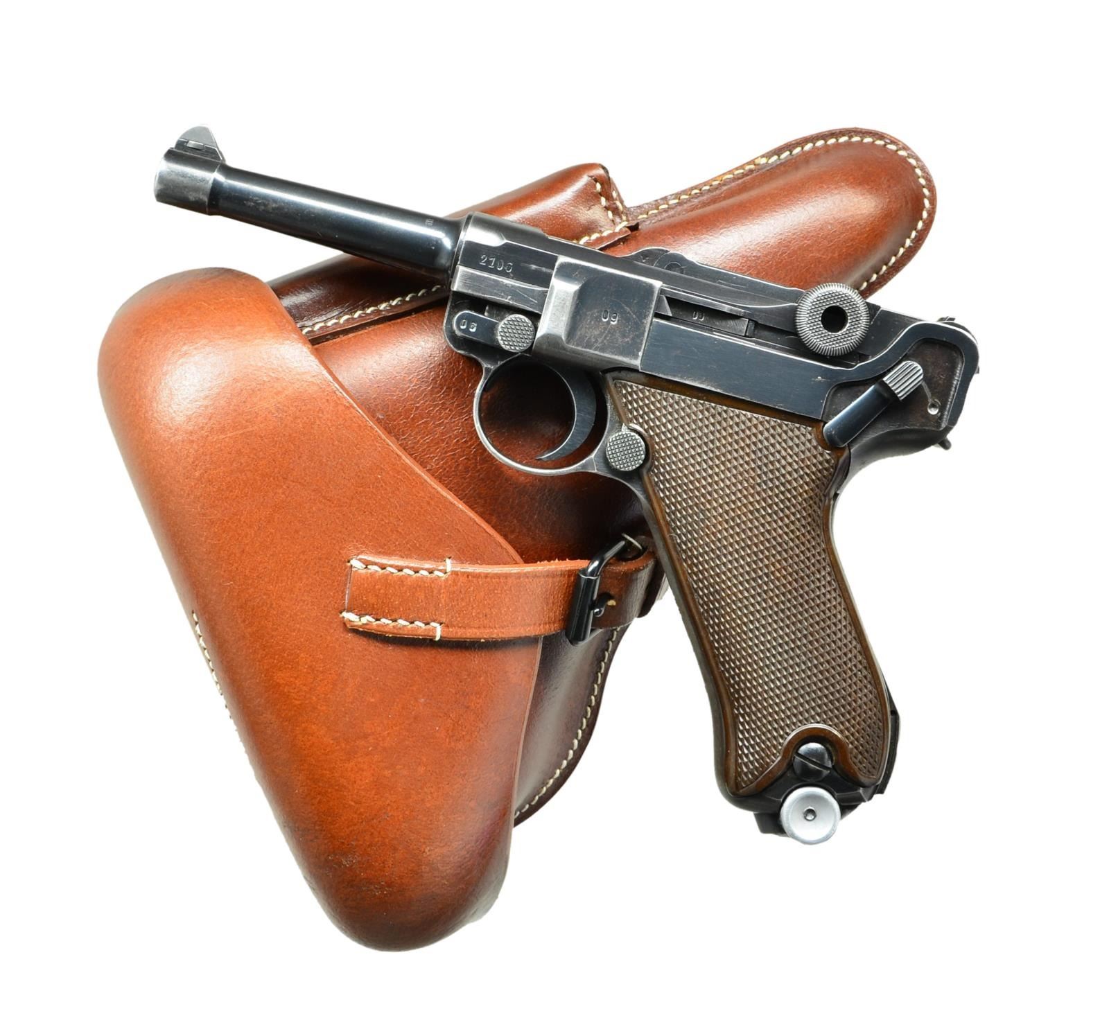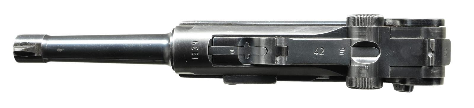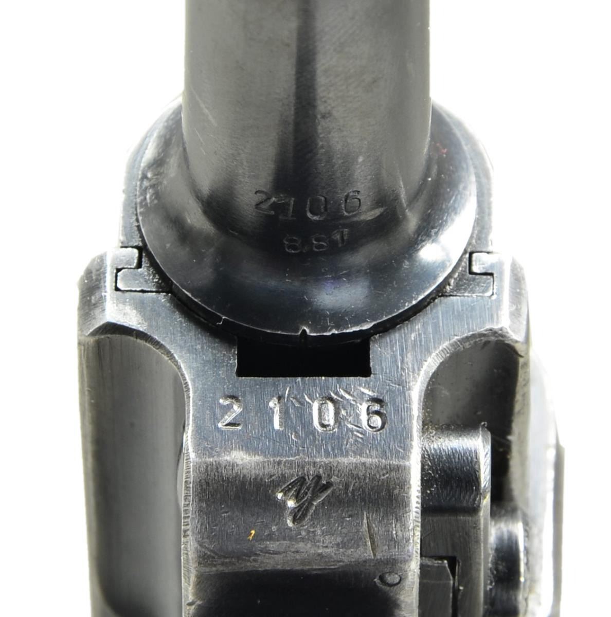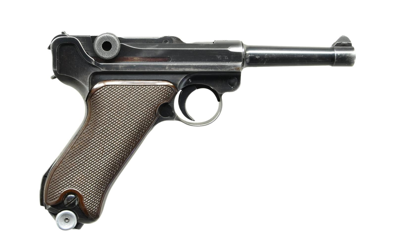 Cal. 9mm Luger. S# 2106y. Bbl. 4" w/ serrated faced fin shaped dovetailed sight, full matching number plus eagle proofs of party symbol & 655. Chamber dated 1939; approx. 85,500 mfg. w/in S# 200r-8250z. Side plate & rear toggle pivot numbered "09"; all other numbered components are properly numbered "06" including sear & gas grooved firing pin. Grips are normally checkered walnut but now Black Widow style having distinct chocolate brown color. Receiver proofs of eagle party symbol & 2 eagle 655's. Proper all blued finish & safe position w/ lever down. MAGS: 2 TOTAL. Both good to very good 8 rd. w/ aluminum bases & light body wear. 1) correct for pistol extruded w/ base marked "1756u" plus "fxo". "P.08" & 2 eagle 37's on body. 2) wrap around body w/ base marked "727t" plus eagle 63. UNATTACHED ACCESSORIES: brown, like new quality reproduction flap holster having buckle & strap retention. Double belt loops, "P08" & 1939 dated maker's marks. CONDITION: good to very good appearance having notable high point & holster wear plus grey thinned tone in grip area. Very sm. chip at top rear of left grip; balance near excellent. Good bore w/ light wear & slight cleaned pitting. (23-716/NW). CURIO. $1,000-1,500.