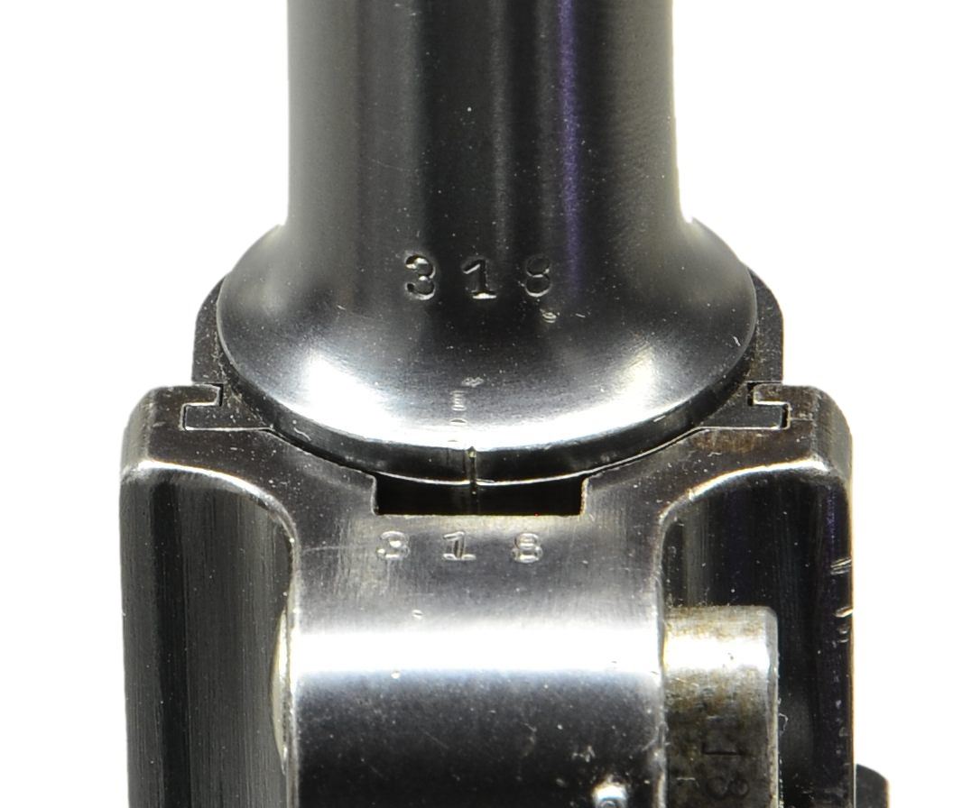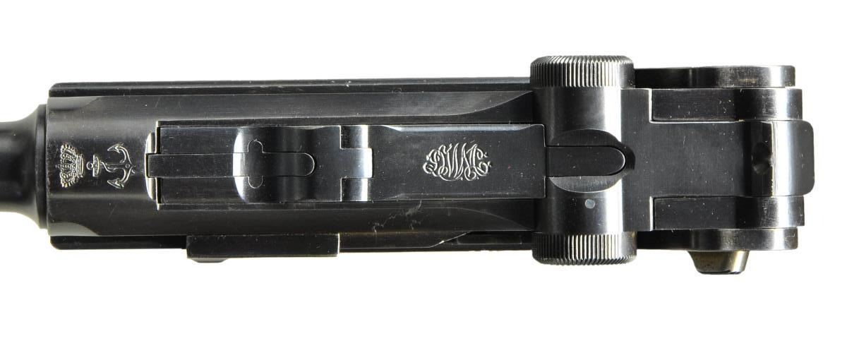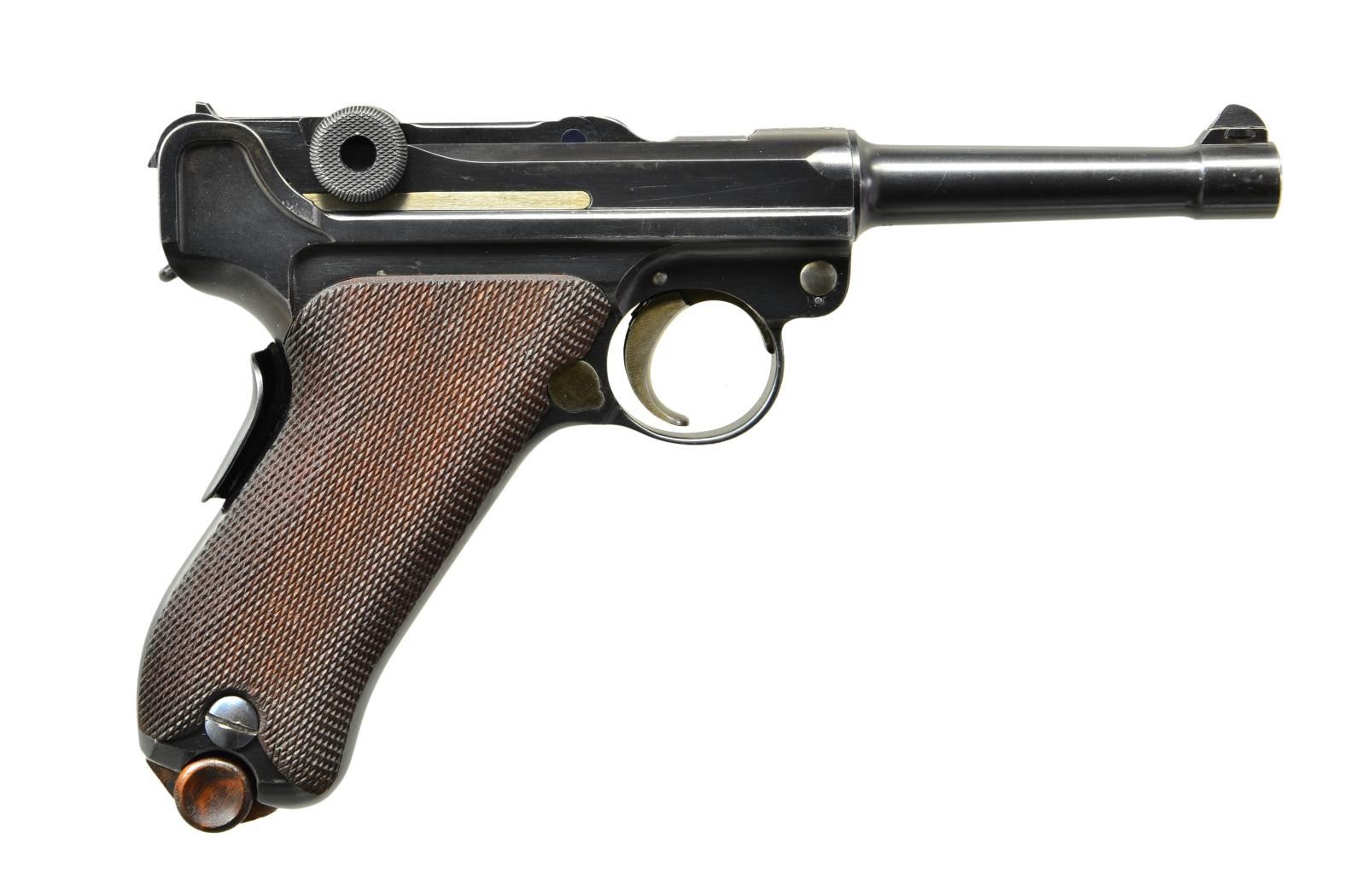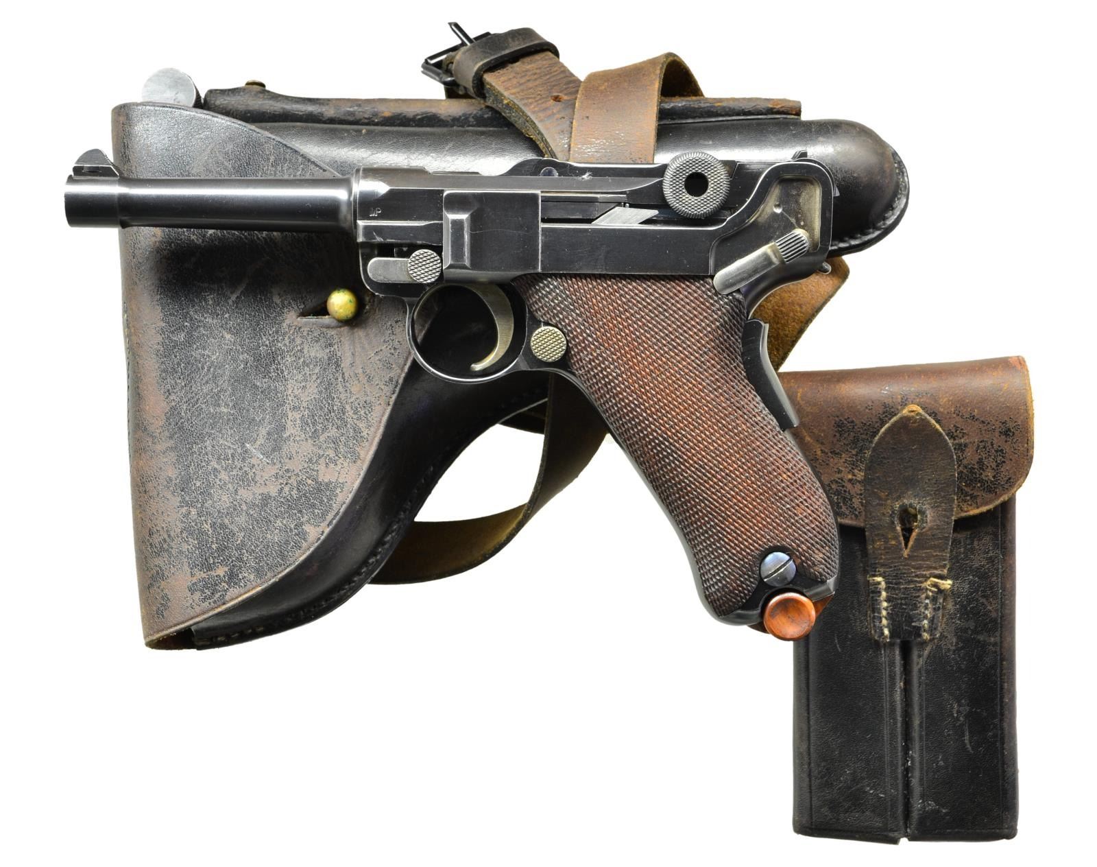 LUGER SEMI-AUTO PISTOL ASSOCIATED WITH ANIBAL SOUSA DIAS & JOSE LUIS GOMES TEIXEIRA. Cal. 9mm Luger. S# 318. Bbl. 4" with fin shaped front sight and number 318; no other marks. Receiver has crown over anchor of King Manuel II, intertwined "MP" proof on left front plus S# on bottom via 3 in front of lug and 18 on lug. No import marks on the pistol. Very rare example from Portuguese late 1909 order for 1,000 pistols of which about 350 delivered under King Manuel II (this pistol) then approximately 300 delivered after the King's overthrow in 1910 having a slight change in the inscription over the chamber to be "R.P." over the anchor. This first batch is extremely rare with Arron Davis' reference book reporting only 6 known. Balance of info listed is a melding from Davis' plus Sturgess' "Borchardt & Luger" Volume II beginning on page 679. Number "18" on trigger, takedown lever, grip safety, sideplate, toggles, "CARREGADA" marked extractor and breech block. Checkered walnut grips with "+" on left; right marked "6" (or 9). Safe with lever in upward position exposing polished bottom area. Correctly strawed small parts plus appropriate internal areas are in the white. Consignor states this pistol issued to Anibal Sousa Dias in 1910 when received by the Portuguese Navy; Dias was 35 at the time with rank of 2nd Lieutenant. On April 3, 1937 he was promoted to Vice Admiral (rare 2 grade promotion). In 1911 Dias & other navy officers were assigned to leadership positions in the 1st Republic of Portugal. On April 30,1960 Dias was in Lisbon at the wedding of a granddaughter to 2nd Lieutenant Jose Louis Gomes Teixeira; Dias gave the groom this pistol as a wedding gift. Teixeira went on to have a highly successful Navy career which included high level commendation for bravery while leading navy infantry unit in Mozambique; promoted to Vice Admiral in 1987. Teixeira died in January 1992 and later that year his widow sold the pistol to a collector in Lisbon. From 1910 when Dias helped overthrow the Portuguese monarchy until 1992, the pistol was with one extended family. Consignor purchased this pistol from the Lisbon collector. MAGS: 2 correct nickel plated 8 rd. with wood base marked in script "Cal. 9m/m"; correct for some examples (most unmarked and all without proofs). Near excellent appearance of both. UNATTACHED ACCESSORIES: very good black flap holster w/ attached shoulder straps (brown) having black dual mag. pouch; flap mostly worn to brown plus all leather unmarked. Original appearing unmarked loading tool and brass cleaning rod with oiler handle. Navy Luger style holster including length of cleaning rod yet shorter for 4" barrel. Missing flap covering cleaning rod handle. Light wear on top of holster flap and numerous light scratches on back of holster. Original continuous loop lanyard cord in very nice condition. Luger pin punch for extractor removal. Copy of hand written Portuguese contract of 23 November 1909 for 350 Luger pistols with ammo and accessories (referenced in Sturgess' Volume II page 679) as copied from Navy Archives in Lisbon, Portugal. Numerous hand written historical time line notes from consignor along with various photos of Dias and Teixeira to include 1 of them together at the wedding. CONDITION: stellar example with components such as breech face indicating extremely minimal use. Close to near excellent finish throughout with the only flaw being faint scratches above takedown lever likely from someone having lack of strength or knowledge to release the lever. Extremely fine thinning on sideplate. Very good to excellent grips. Especially nice straw colors without staining. Bright polished muzzle and near excellent bore. A truly great Portuguese example. (22-5558/ZAL). CURIO. $7,000-11,000.