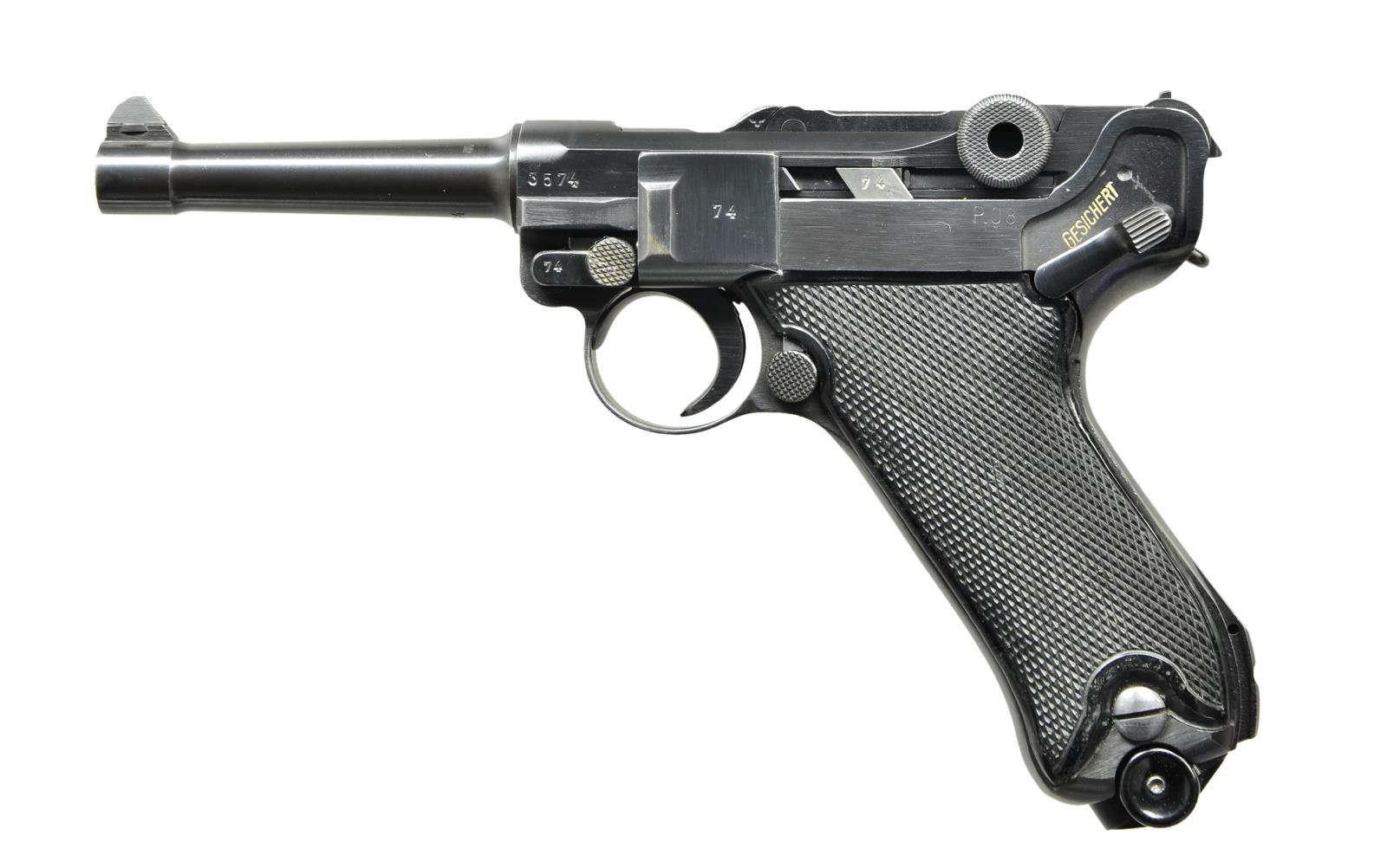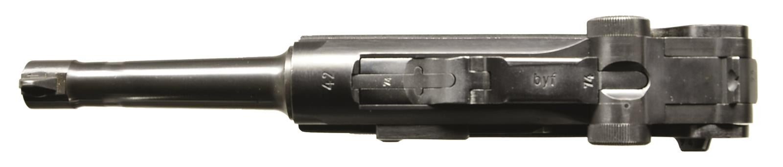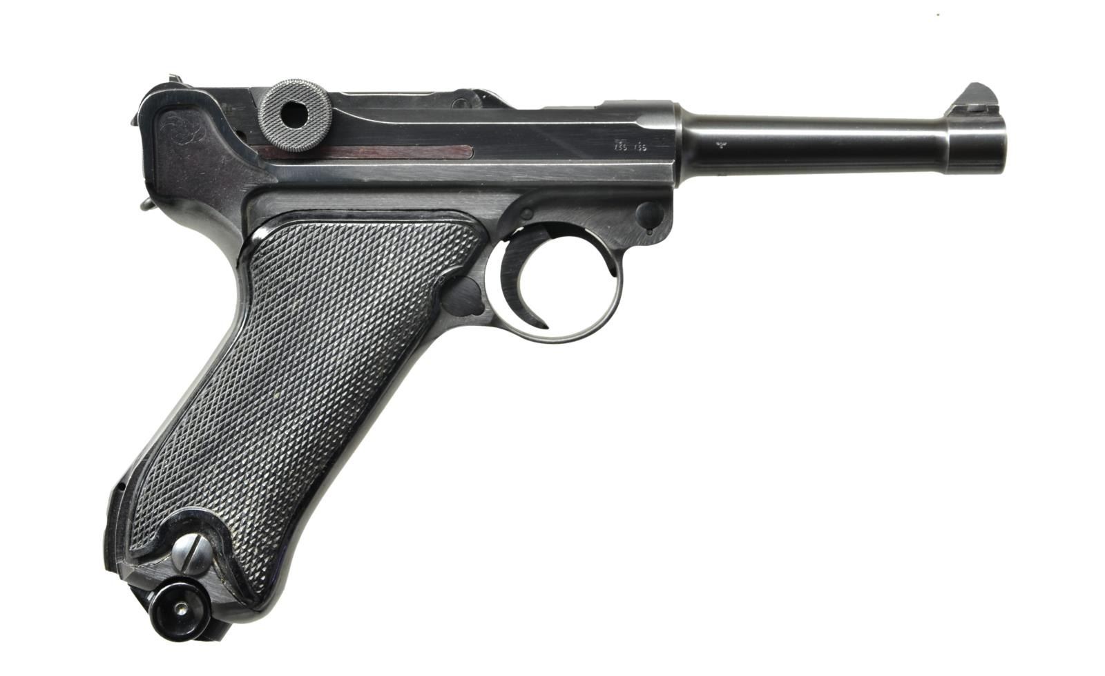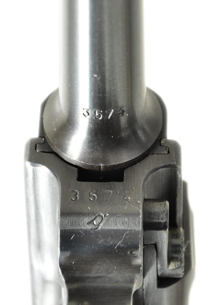 Cal. 9mm Luger. S# 3574g. Bbl. 4" w/ fin shaped front sight, full S# & eagle party symbol proof. Mfg. 1942 having eagle party symbol & eagle 135 proofs. Characteristic border checkered black plastic grips. "P.08" on flat above left grip. All matching numbers including rear toggle pivot. MAGS: near excellent fxo P.08 eagle 37 proofed 8 rd. w/ black plastic base retained by pin through dimples. Correct for 41 Black Widow; no eagle proof for 42. CONDITION: near excellent in all respects w/ only the slightest hint of thinning finish. Very sm. diamond top marks on each grip. Near excellent bore. Great example of iconic Black Widow Luger. (23-480/NW). CURIO. $2,250-3,000.