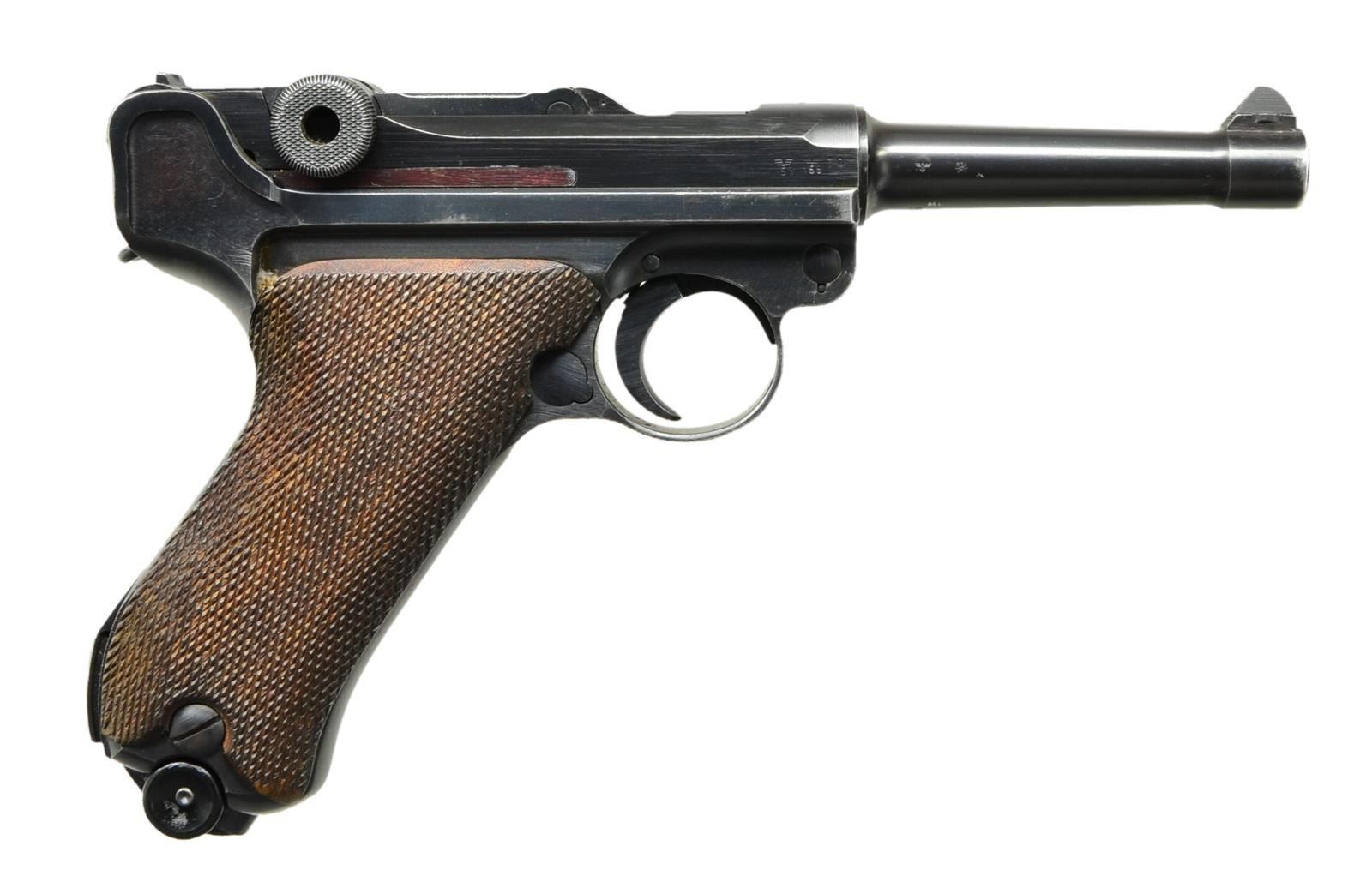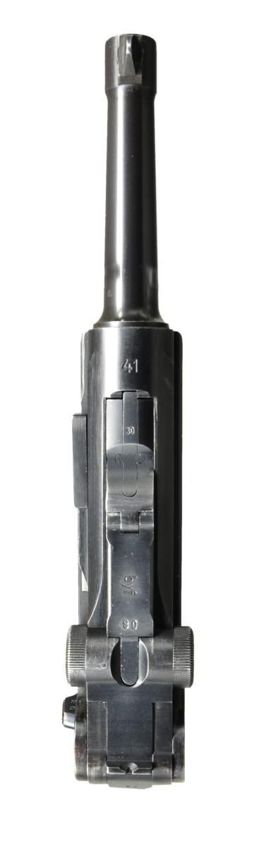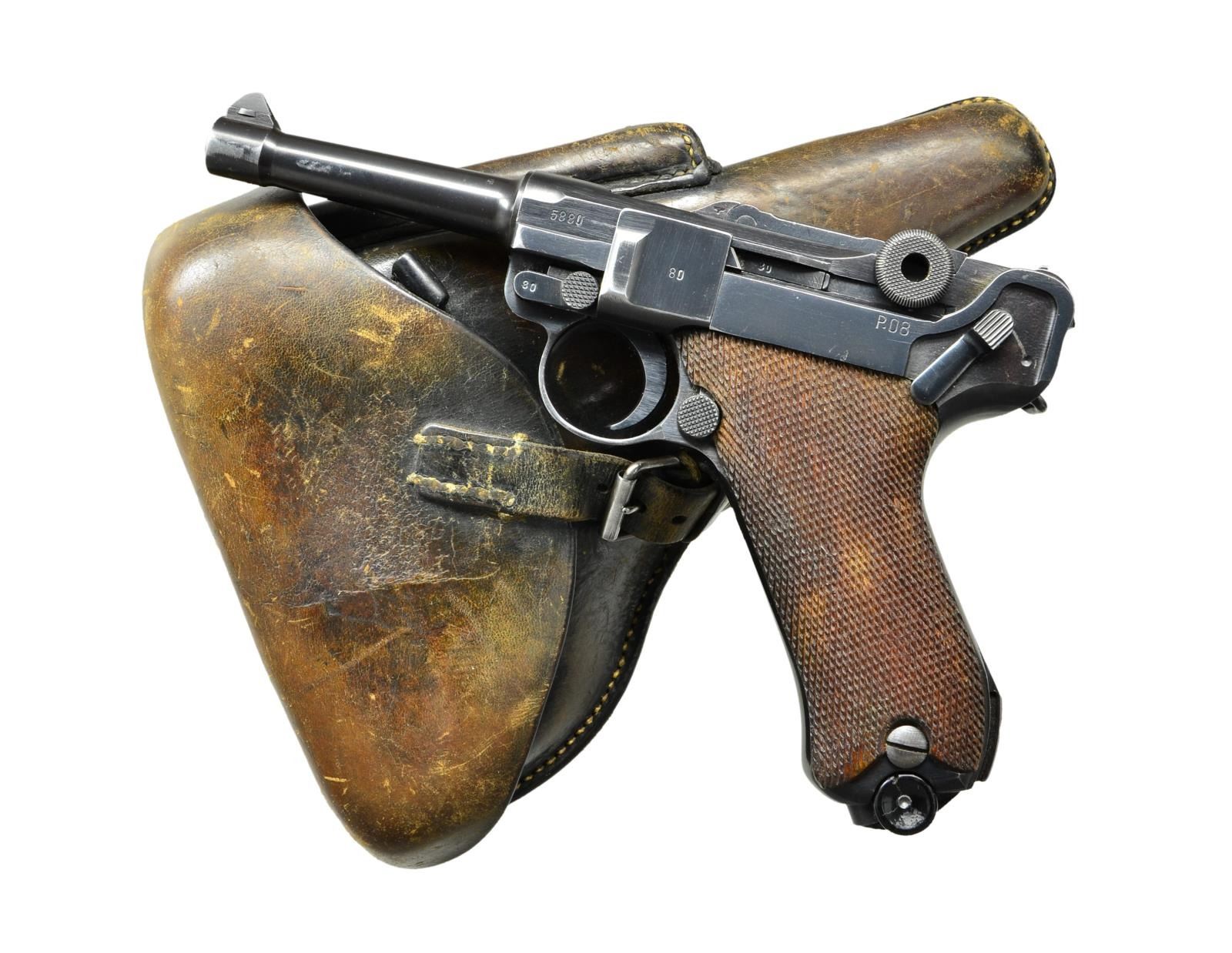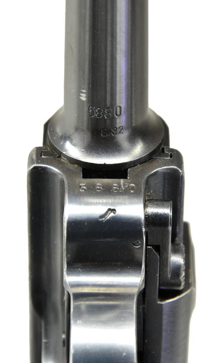 Cal. 9mm Luger. S# 5880r. Bbl. 4" w/ fin shaped front sight, full S#, eagle party symbol & eagle 655 proofs plus starburst symbol on right side. Mfg. 1941 having eagle party symbol & eagle 655 proofs; approx. 126,000 units. "P.08" on flat above left grip. All matching numbers including rear toggle pivot; only "0" of "80" shows on right grip along w/ "V" & both have eagle 655 proofs. Correct all blued finish & checkered walnut grips. MAGS: 2 extruded fxo, eagle 37 & P.08 marked 8 rd. TOTAL. 1 near excellent w/ black plastic base retained by pin through dimples; 1 very good w/ shortened body at base to accept aluminum base retained by single pin at spine & marked "S/42" at bottom of front. UNATTACHED ACCESSORIES: good brown flap holster by Ryffel & Borns of Hanover dated 1936. Buckle & strap retention plus "8774" on face of holster under flap. Wide single belt loop repair w/ solid machine stitching. Very good loading tool marked ".1111". CONDITION: very good to near excellent appearance w/ slight thinning finish most pronounced near muzzle, high point of side plate, front of frame rails plus spot at very bottom of front strap. All markings extremely clear plus sharp profiles throughout. Very good grips w/ slight diamond top wear; especially near butt. Very good bore w/ faint frosting in grooves. (23-377/NW). CURIO. $1,250-1,750.