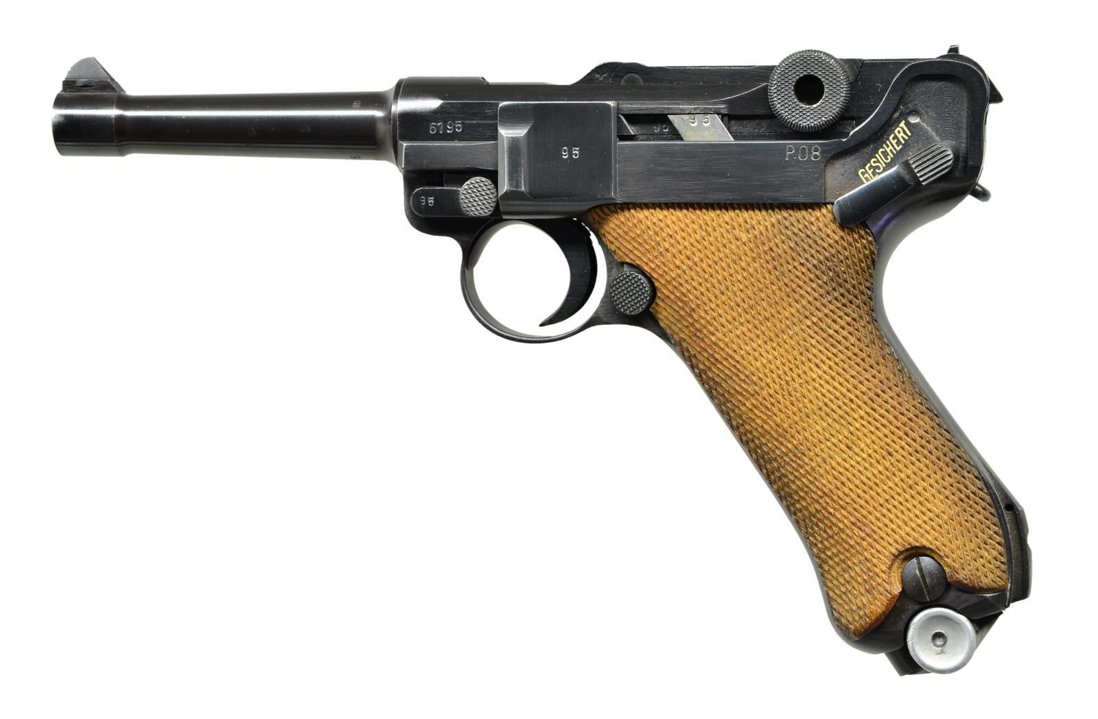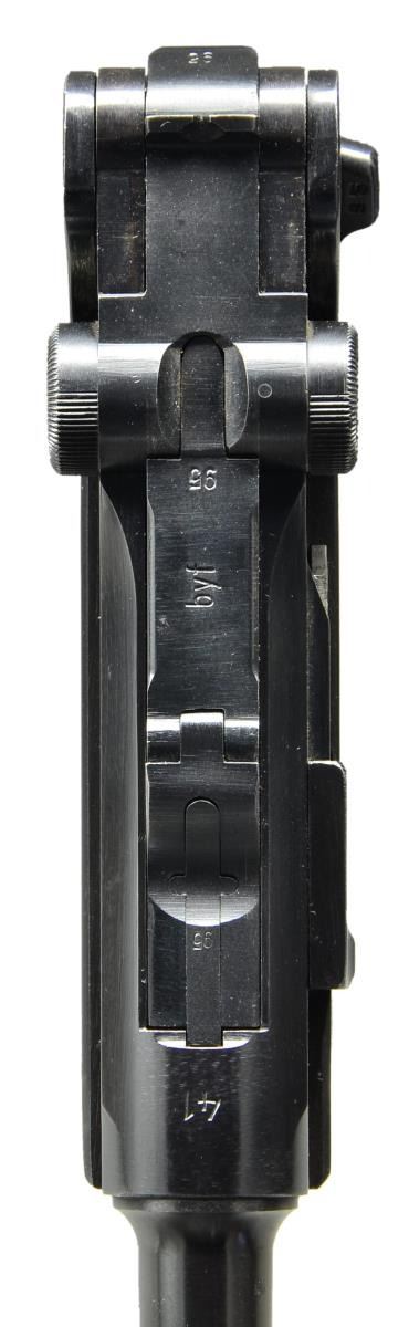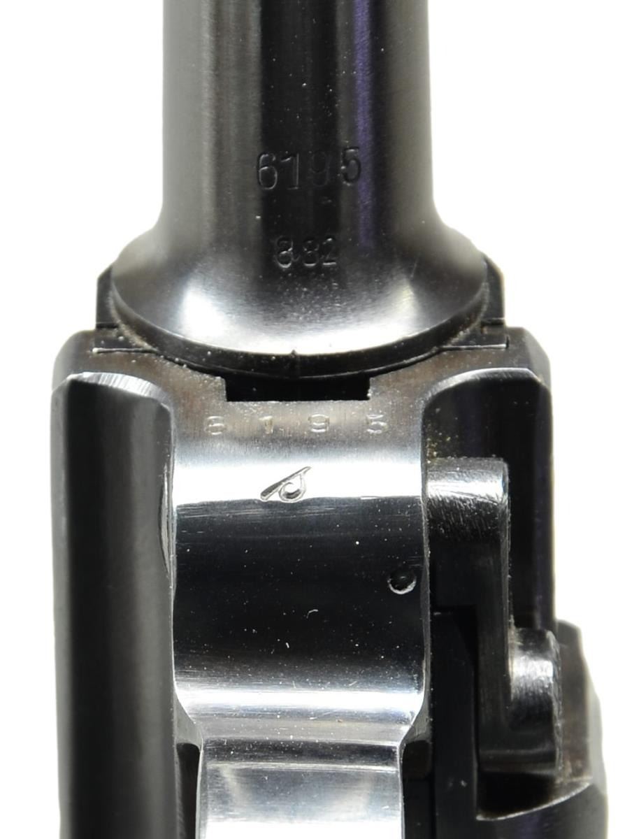 Cal. 9mm Luger. S# 6195s. Bbl. 4" matching numbered having serrated fin shaped front sight & proofs of eagle party symbol & eagle 655. Matching numbered fully checkered grips w/ eagle 655 proofs plus "E" on left. Matching numbers on takedown lever, trigger, sideplate, safety lever, safety bar, hold open latch, receiver, sear & all component of toggle assembly to include rear pivot. 41 over chamber, eagle party symbol on breech block plus eagle party symbol & 2 eagle 655's on receiver. Approx. 126,000 mfg. S# 3300n-1000; identical to Black Widow model except wood grips instead of black plastic. All blued including interior, no strawed parts, plum toned ejector, stock lug & left side frame marked "P.08". MAGS: 1 Correct matching numbered 8 rd. w/ 2 eagle 37 proofs, "fxo", "P.08" & aluminum base numbered 6195s plus "1" indicating primary mag. CONDITION: very good to excellent appearance w/ high quality refinish having slightly glossier polish to include face of muzzle. All marks & proofs are distinct. Very good to excellent grips w/ extremely faint occasional marks. Good to very good bore having distinct rifling & frosting to light pitting. (22-6418/NW). CURIO. $1,200-1,800.