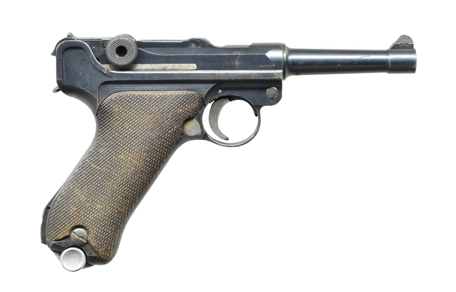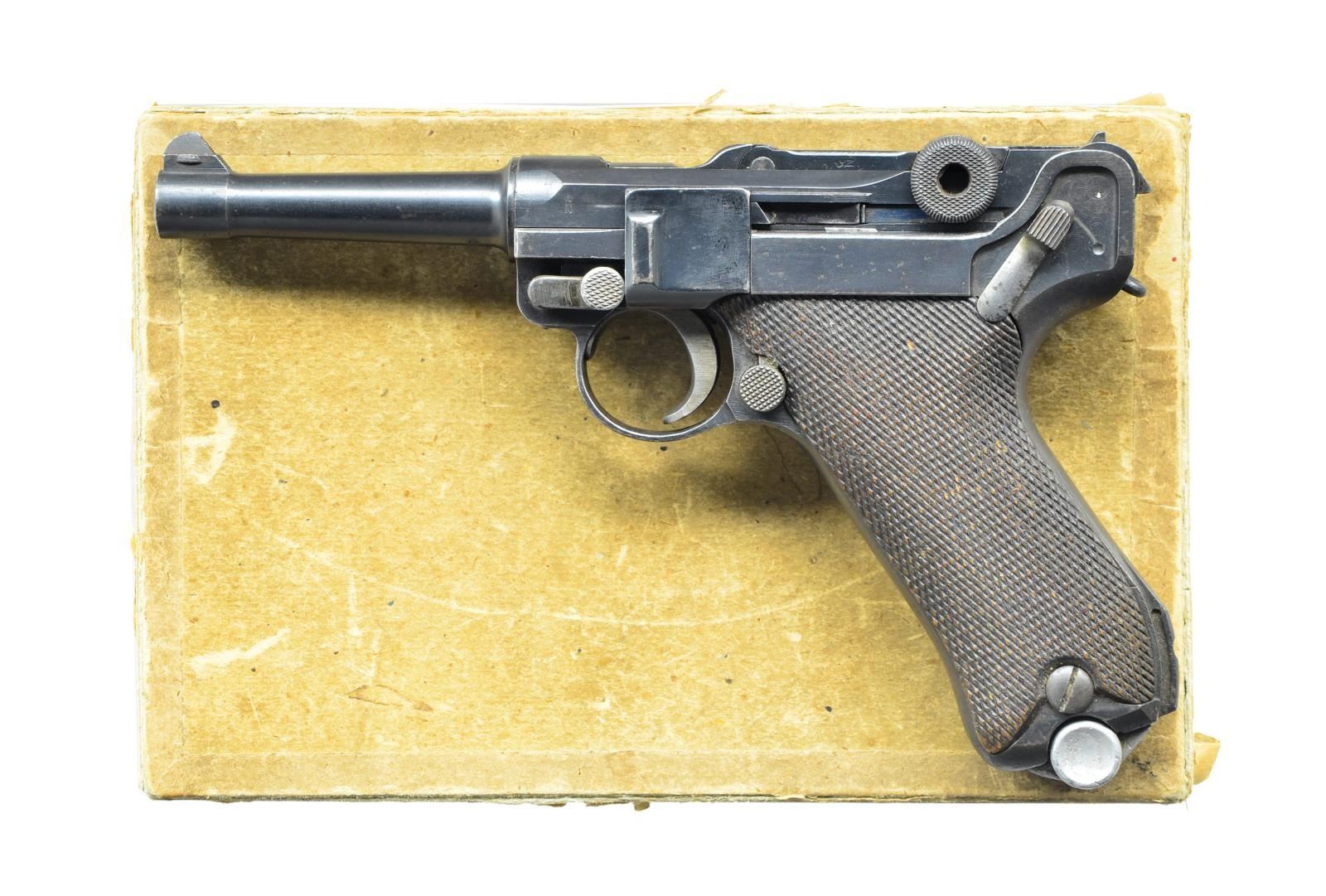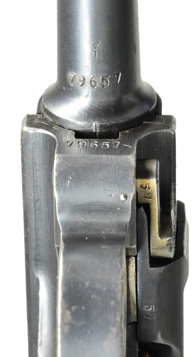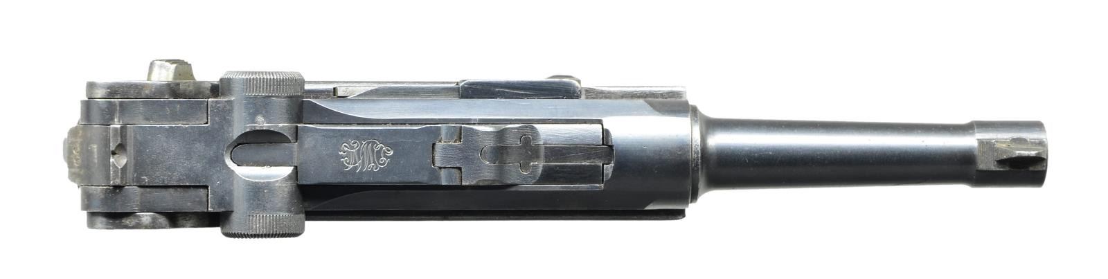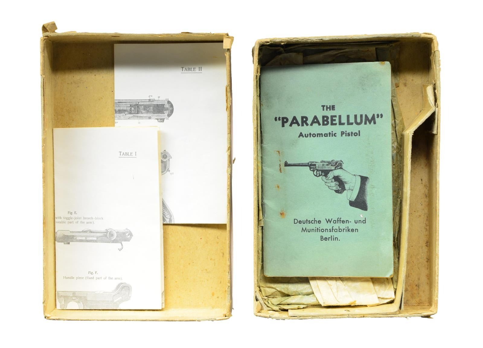 Cal. 30 Luger. S# 79657. Bbl. is 3 7/8” w/ full matching number, crown “N” proof plus fin shaped sight having serrated face. Mfg. immediately after WW1 having “GERMANY” export mark on right front of receiver. Sometimes erroneously referred to as 1923 Commercial model, but actually preceded 1920 Commercial; approx. 13,000 made w/in S# 74845 to 92000 in 30 cal. Matching numbers in commercial locations, crown “N” proof on left front of receiver, strawed small parts, unmarked checkered walnut grips plus appropriate internal areas in the white. Matching numbered side plate, takedown lever & trigger. Breech block & rear toggle numbered “09”. Center link on bottom appears to have “9” plus extractor numbered "77". MAGS: 1 good 9 rd blued (scattered peppery oxidation & light dent about 1” up from base on right near spine). Aluminum base marked “5818” over “m” over “+” over eagle “83” proof as used on Mauser S/42 Lugers. UNATTACHED ACCESSORIES: unmarked vintage box for original shipment plus 2 tables of illustration showing parts & models. Vintage manual titled “The PARABELLUM Automatic Pistol” printed in English. CONDITION: good overall appearance w/ areas of very light pitting & peppery oxidation. Faded straw colors w/ safety lever & ejector being most faded plus left side of trigger & takedown lever best appearing. Well fitting grips w/ noticeable hand wear. Very good bore w/ very light wear & hint of frosting. (23-859/NW). CURIO. $1,000-1,500.