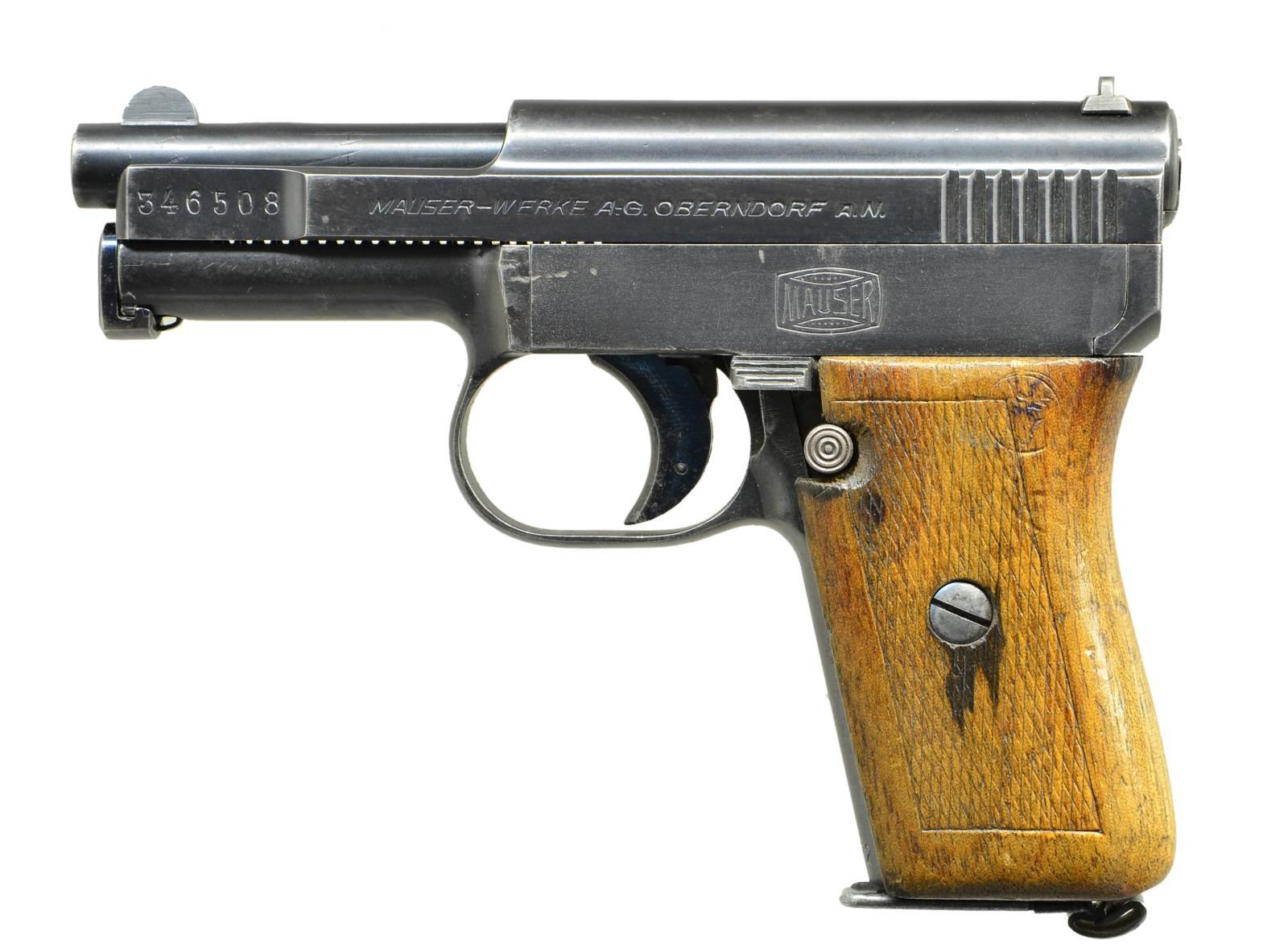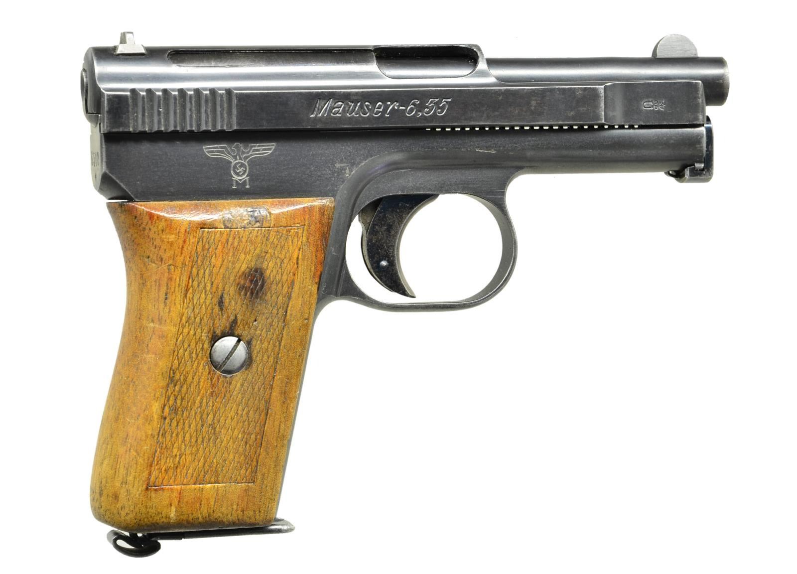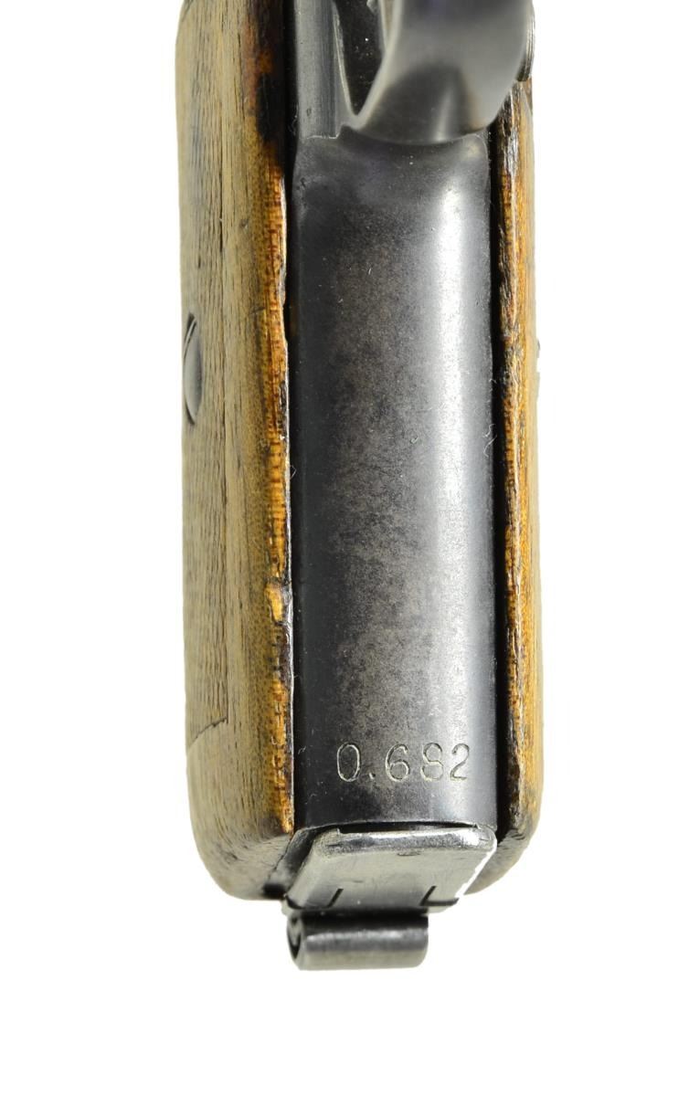 Cal. 6.35mm. S# 346508. Bbl. 3". For the few collectors who enjoy seeing fakes, this is your opportunity to add another to your collection! Even better, the bbl. is bulged and the slide is sticky over the bulge. The pistol is otherwise a reasonably good looking Mauser 1910, marked w/ full S# on left of slide followed by single line address. Mauser denotation & cal. designation on right side of slide. Crown/”C”/”U” markings on right side of slide & front bbl. lug. Lg. Mauser banner on sideplate. Sm. Portuguese marking below S# on back of frame. Now w/ fraudulent Kreigsmarine eagle /"M" on right side of frame over grip & "O.682" Navy issue #, also fraudulent, on frontstrap. Single piece wraparound grip secured w/ 2 screws. Bottom mag. release. MAGS: correct mag. w/ 3 indicator slots on left side. Unmarked floorplate w/ squared toe. CONDITION: very good plus, w/ sharp edge wear, fading, particularly on front strap consistent w/ pistol that has seen moderate use. The same applies to the fire blue on the sm. parts & the grip, most varnish missing, w/ stains & scattered handling marks. Dull bulged bore. Mechanics hindered by slide stickiness over bulge. Trigger & safety function properly. (22-3056/LMA). CURIO. $250-500.