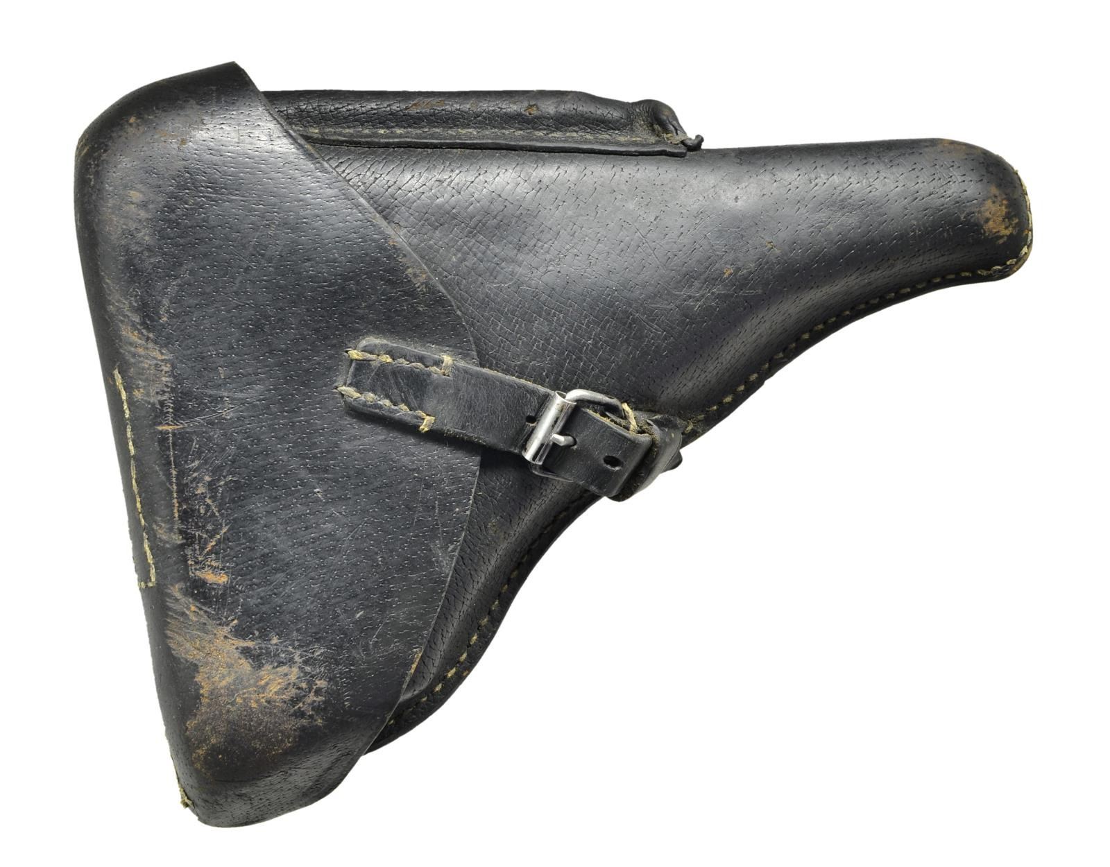 Cal. 9mm Luger. S# 4164y. Bbl. 5" having fin shaped sight numbered 4. Bbl. proofed "WaA135" (also on frame). Mfg. 1944 w/ "byf / 44" on matching numbered slide. "WaA135" plus eagle party symbol on breech block & slide. Horizontally grooved black plastic grips. MAGS: 2 very good 8 rd.; spines w/ eagle 88 on one plus eagle 359 on other. UNATTACHED ACCESSORIES: good to very good (scuffs on corners of flap) "P.08" marked Luger holster by E.G. Leuner having open grained pigskin appearance. Buckle & strap retention, spare mag. pouch on end, lift strap & Luger tool pouch. Aged piece of lined notebook paper marked (in cursive) "S/SGT. R.E. Sessions, 1st Squad, 1st platoon, Company A, 331st Infantry.". Also has hand printed name, P-38 & S#. CONDITION: very good to excellent original finish w/ holster style thinning. Very good grips w/ very faint scratches at top of right plus lightly abraded area on raised portion by slide stop. Near excellent bore. (22-5715/NW). CURIO. $800-1,200.