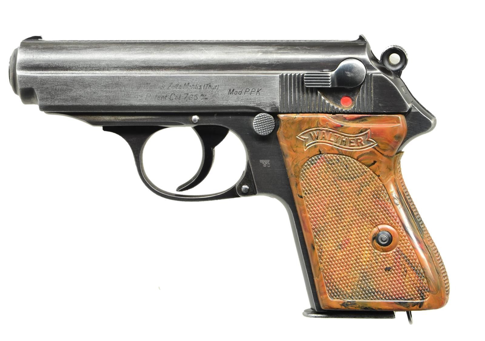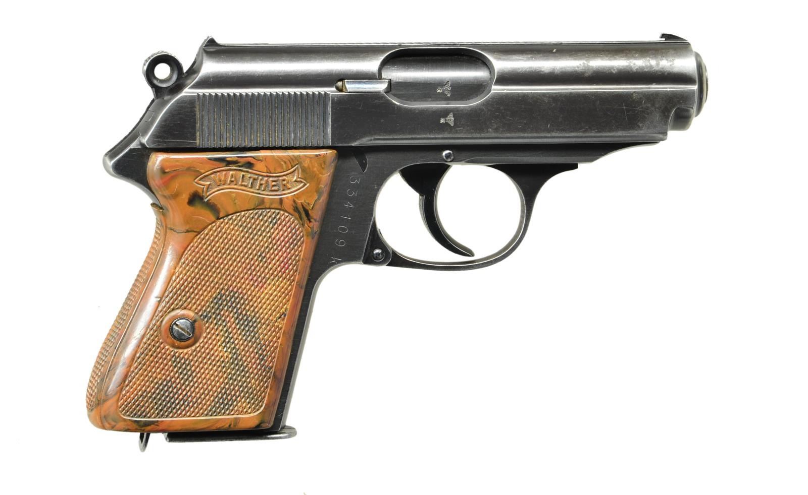 Cal. 7.65mm (32 ACP). S# 334109K. Bbl. 3 3/16" w/ eagle N proof on right side at muzzle; matching proof on frame & matching # slide. Mfg. 1940 w/ mottled brown checkered Walther banner plastic grip. Left side of frame behind trigger guard has police marking of eagle party symbol and "C". MAGS: 1 Walther banner marked 7 rd. w/ peppery oxidation on base and light pitting on sides of body. CONDITION: Fair to good cleaned appearance w/ slide markings noticeably compromised nearest muzzle; right side appears original w/ light pitting on curvature forward of port. Much better appearing frame w/ minimal edge wear. Typical grip separation along front edges w/ top left most noticeable. Upper distortion does not allow full functioning of safety lever but enough to decock & render safe. Light marks on grip in banner area of each side. Near excellent bore. (22-3197/NW). CURIO. $700-1,000.