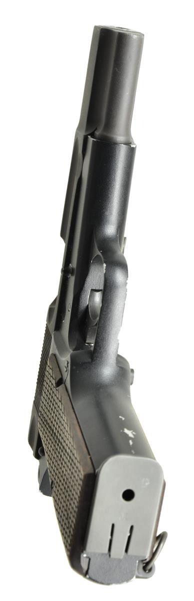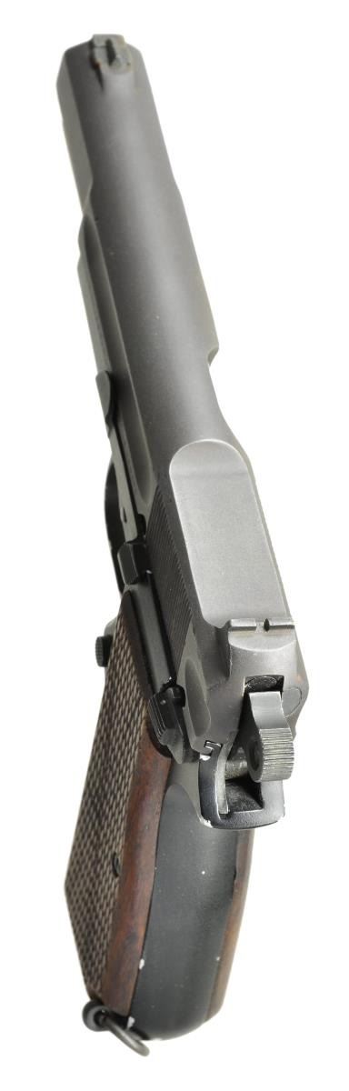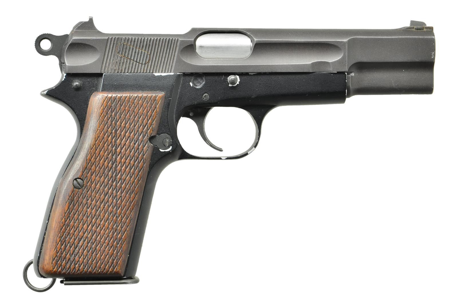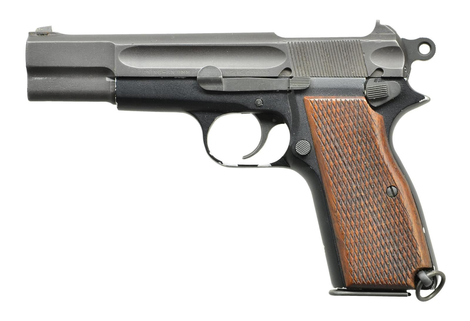POWER SEMI-AUTO PISTOL EX. BRUCE STERN COLLECTION. Cal. 9mm Luger. NSN. Bbl. 5" without markings, proofs or numbers. Mfg. approx. 1948 as trials pistol for Canadian Department of National Defense (DND). DND contracted with private firms for lightweight aluminum alloy and magnesium frames. The first six were machined aluminum. Later, 29 examples were "pressure die cast" of aluminum alloy or magnesium, Of the 29 rough cast frames, 21 were machined and delivered. 20 Of those cast frames were numbered and one was not. This pistol is the one that was not numbered which was sent to the DND for review as a frame only, then later returned and assembled. Pistols were numbered at the base of the mainspring housing just behind the magazine well; not on right side or on front grip strap. Finish on this pistols frame is of a type of paint such as baked on lacquer or some other painted finish; it is NOT anodized. Its oiled walnut grips are flat with a coarse cross hatch pattern that does not come to points. At lower left rear of frame is a screw in lanyard loop with ring. Slide has finger groove style lightning cuts before and after its cocking grooves; left side of slide marked with "BROWNING - F.N. 9 MM HP INGLIS, CANADA". Top rear of slide has metal removed as well leaving an integral fixed rear sight. Extractor is the early internal style. Finish of the slide is of a sand blast parkerized appearance. Front sight is the normal dovetailed style. The pistol has a ring hammer plus dimple in slide for takedown. Peened in place steel reinforcement rod is to secure the barrel and visible on the right side; covered by slide stop on left side. It has a standard magazine safety. MAGS: 1 near excellent JI marked parkerized 13 round with split tail base having alternate retention hole at mid point; normal aluminum follower. UNATTACHED ACCESSORIES: supplied photocopied pages (#182, 184 &185) from reference book, believed by Clive Law; explaining the Lightweights as mentioned in the description. CONDITION: slide is very good to excellent but finished over prior light pitting. Finish of the alloy frame has voids allowing aluminum base metal to show. Insertion of magazine is not always smooth and occasionally "hangs up" on the magazine safety attached to the trigger. Trigger link occasionally fails; usually functions with encouragement by letting the trigger "snap forward" to reset. Grips are near excellent. Bore and barrel have a new unfired appearance. PROVENANCE: Formerly of the Bruce Stern collection. (22-5762/NW). CURIO. $10,000-15,000.