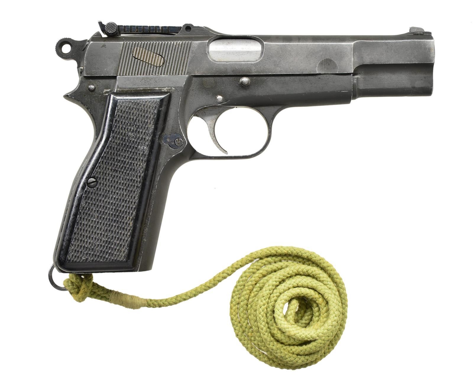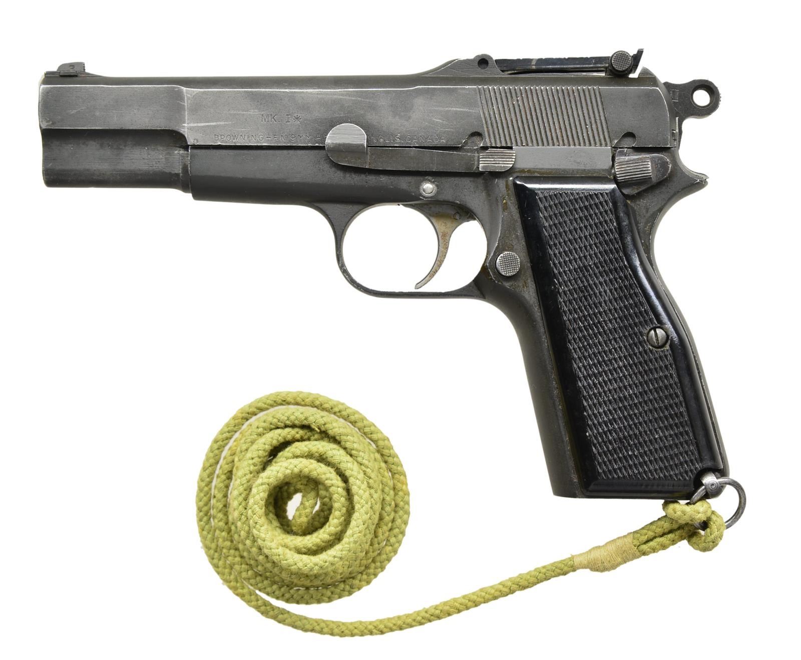PISTOL. Cal. 9mm. Luger. NSN. Bbl. 4 3/4" without markings. Mfg. 1943-1945 for WW-II plus some small contracts until about 1960. Termed "lunch box special" as it was likely pilfered in pieces from the factory as the ONLY markings on the pistol are on left side of its 50-500 marked tangent sight slide showing "MK I*" and normal Inglis markings. Viewed from rear, slide sits slightly forward of frame supporting parts pistol concept. Frame is more black than slide with appearance of different finish; all matte parkerized. Sides of trigger and its pivot pin are in the white. Black plastic grips having "CL" within "D" on each plus "55" on left and "B" on right . "II" on ring hammer. Lanyard cord attached to loop at bottom left rear of frame. MAGS: 1 good plus 13 rd. with "JI" marked split base and black plastic follower. CONDITION: good to very good appearance with high point and function wear plus light rub marks, Very good grips with left best appearing; right with light marks. Good to very good bore with very light pitting in forward half. (22-4457/NW). CURIO. $1,500-2,500.