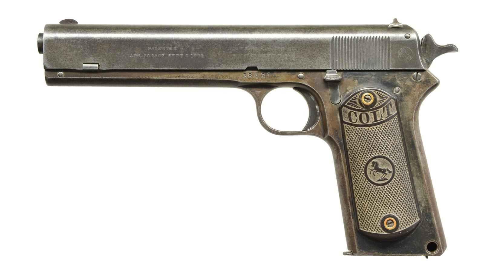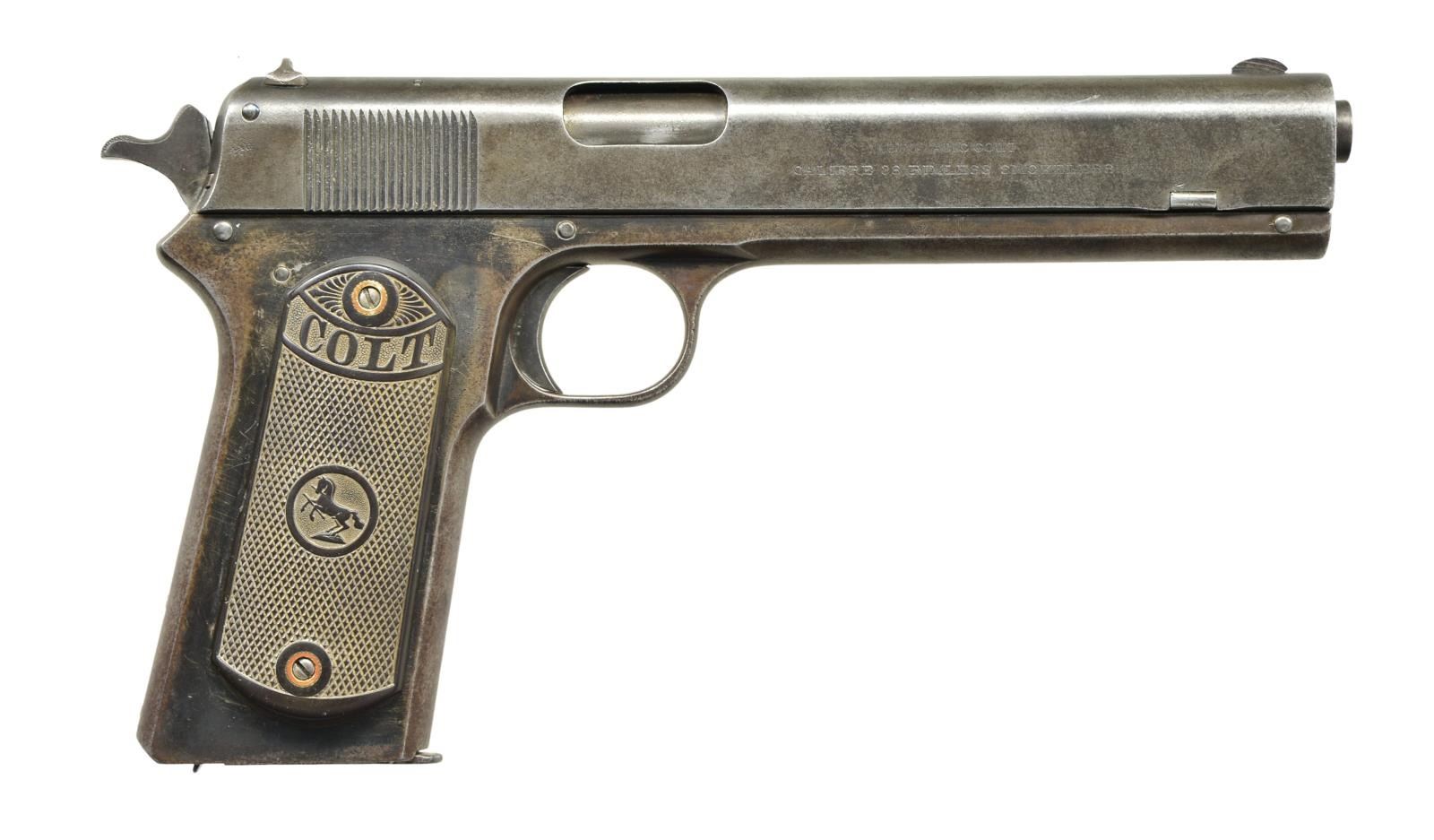 Cal. 38 Rimless (38 ACP). S# 38421. Bbl. 6". Mfg. 1916 (1902-1929) w/ in 2 S# ranges due to 1907-1908 void in numbering. Spur hammer (changed from rnd. in 1908), no safety, hold open latch, border checkered Colt marked hard rubber grips & lanyard swivel provision at left rear of butt. MAGS: 1 fair correctly marked plated factory 8rd. w/ areas of oxidation on base, some on right side plus most of left side. CONDITION: fair to good general appearance w/ mottled areas & refinishing over areas of light prior pitting. Frame has been renumbered & missing lanyard swivel. Good grips w/ even moderate wear plus some very sm. chips on edges of right plus 1 sm. chip on bottom of left. Fair worn bore w/ even pitting. Hammer spring is w/ out tension from 1/2 cock to rest. (22-6055/NW). CURIO. $1,200-1,800.