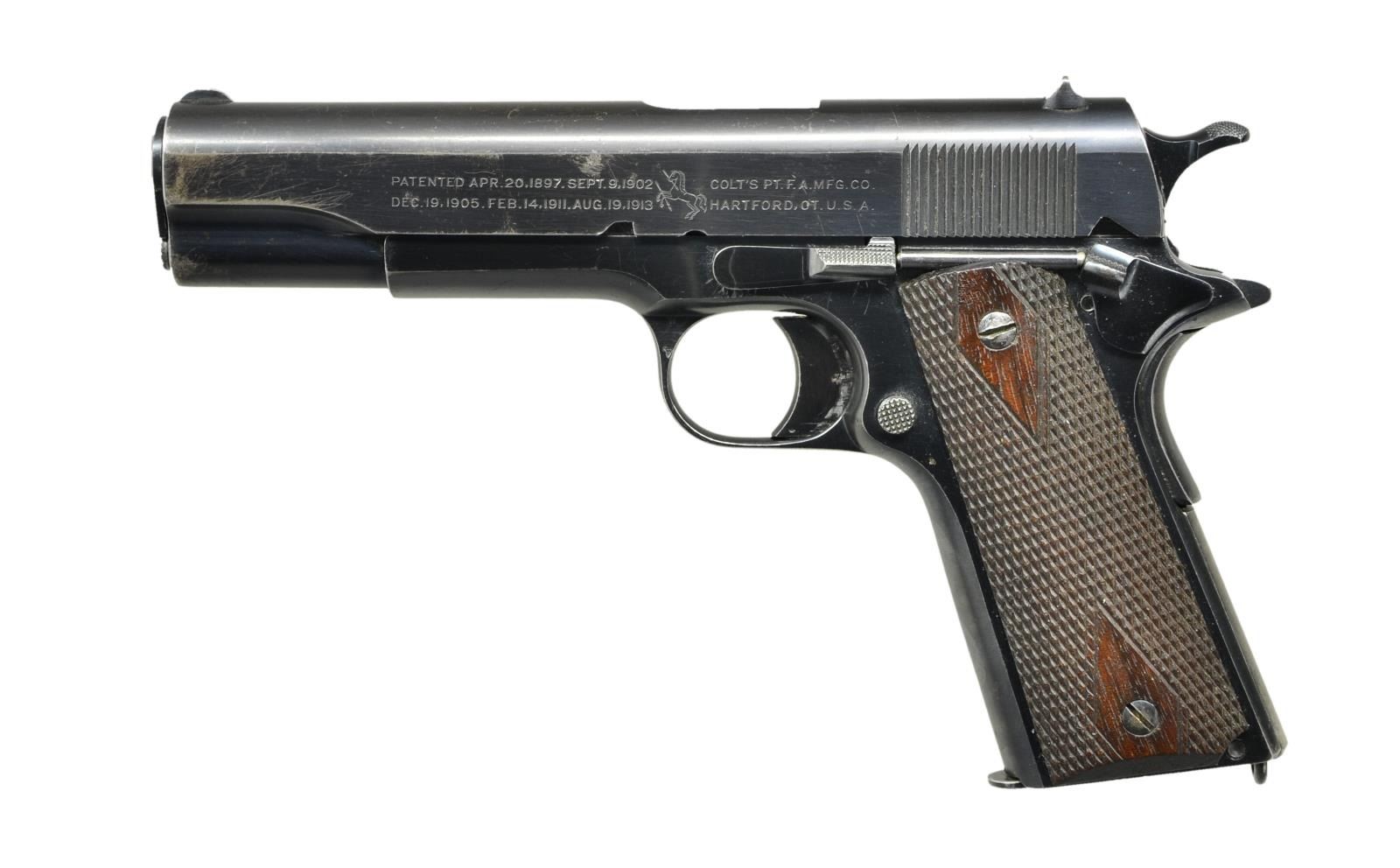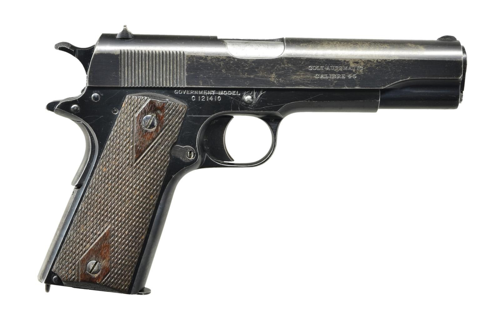 Cal. 45 ACP. S# C121410. Bbl. 5" w/ "C" on left leg, "1" on right plus in front of legs: "&", "P" & "3" (guess, as not very readable). Mfg. 1920 & often referred to as 1911 Commercial; "C" prefix in S# used 1912-1950. Double diamond grips (used until mid 1923, then fully checkered) having 13 rows between diamonds. Proper slide markings for period plus half moon front sight & drift adjustable U notched rear; correctly w/out number plus "3" on underside near breech face. Left front of trigger guard w/ VP proof plus "W", right side has "82" & "S" by disconnector. Long smooth faced trigger, w/out A1 finger cuts (started mid 1923), flat mainspring housing w/ lanyard loop, & checkered controls (undercut only on slide lock). Wide spur hammer w/ border checkering. Spring guide w/ bullet shaped front like National Match pistols. MAGS: 3 two toned 7 rd. w/out lanyard loops, TOTAL; very good unmarked, good Barnes & Kobert w/ some light oxidation & almost good unmarked. CONDITION: very good overall appearance w/ original finish. Light scratches throughout plus mottled appearance on right front of slide being almost patina. Occasional spots of pinprick oxidation. Noticeable function wear on bbl. exterior. Very good grips w/ light hand wear. Fair darkened bore w/ wear & even pitting. (22-6383/NW). CURIO. $1,000-1,500.