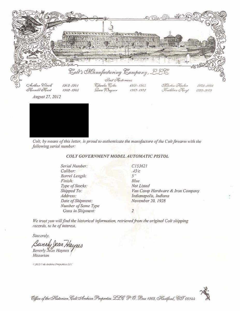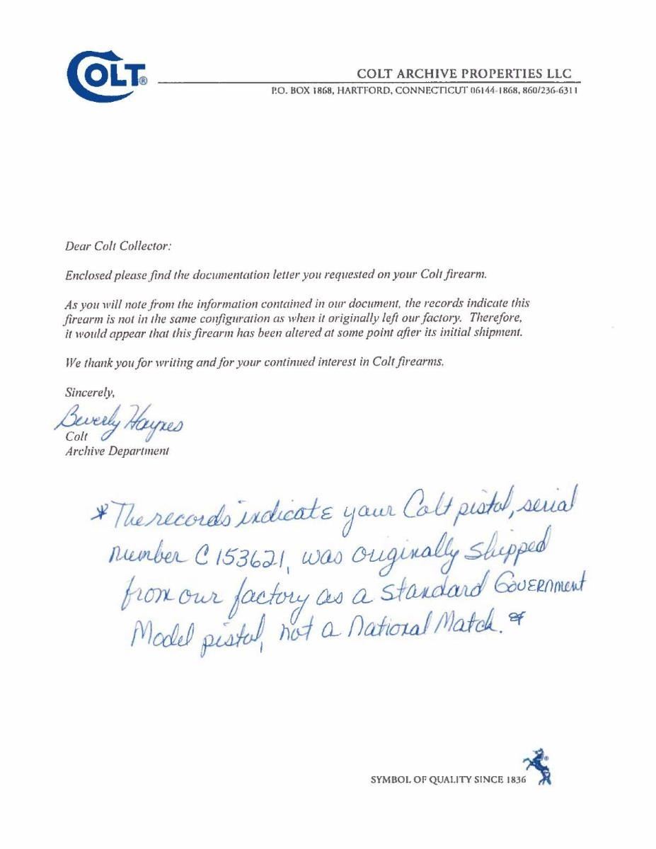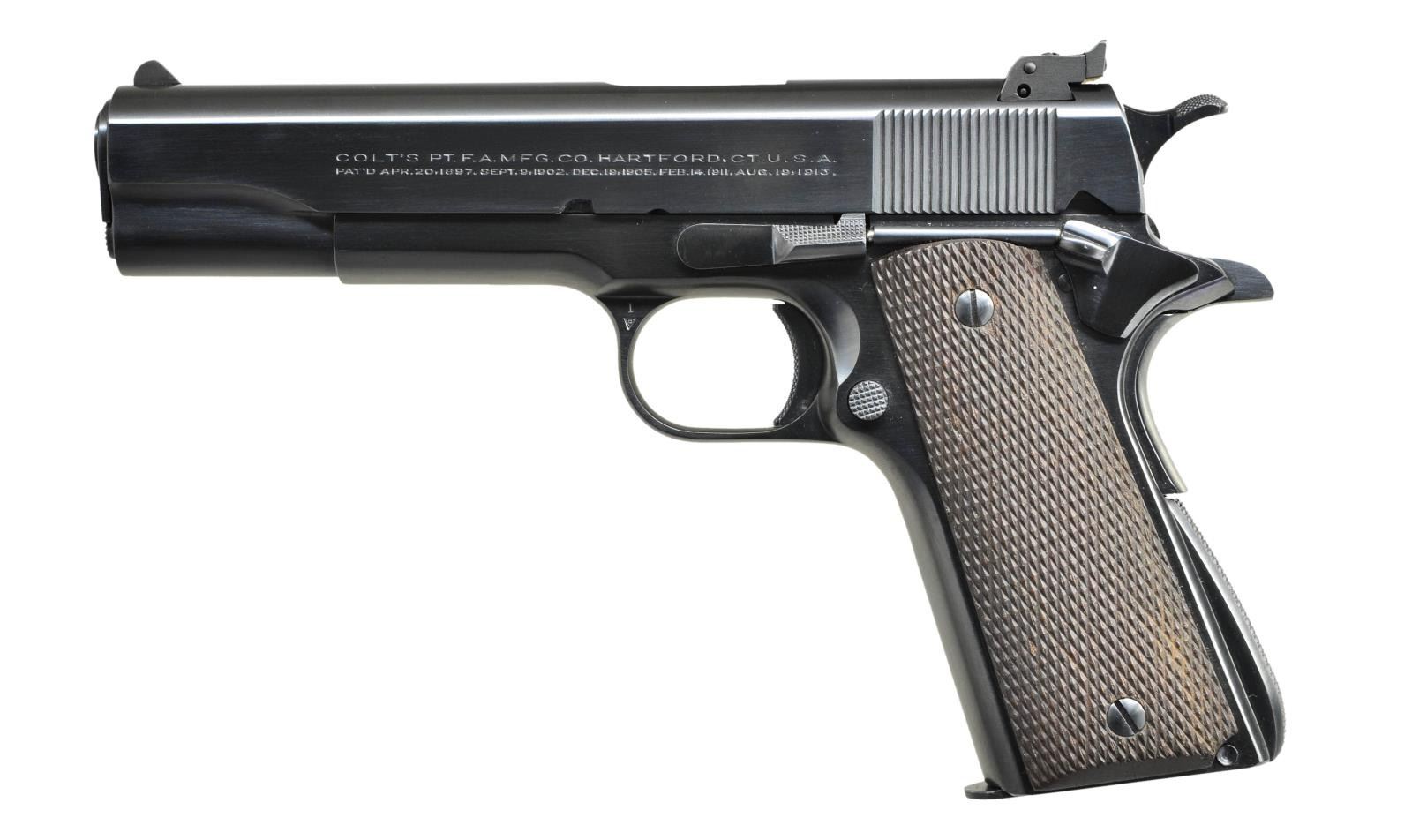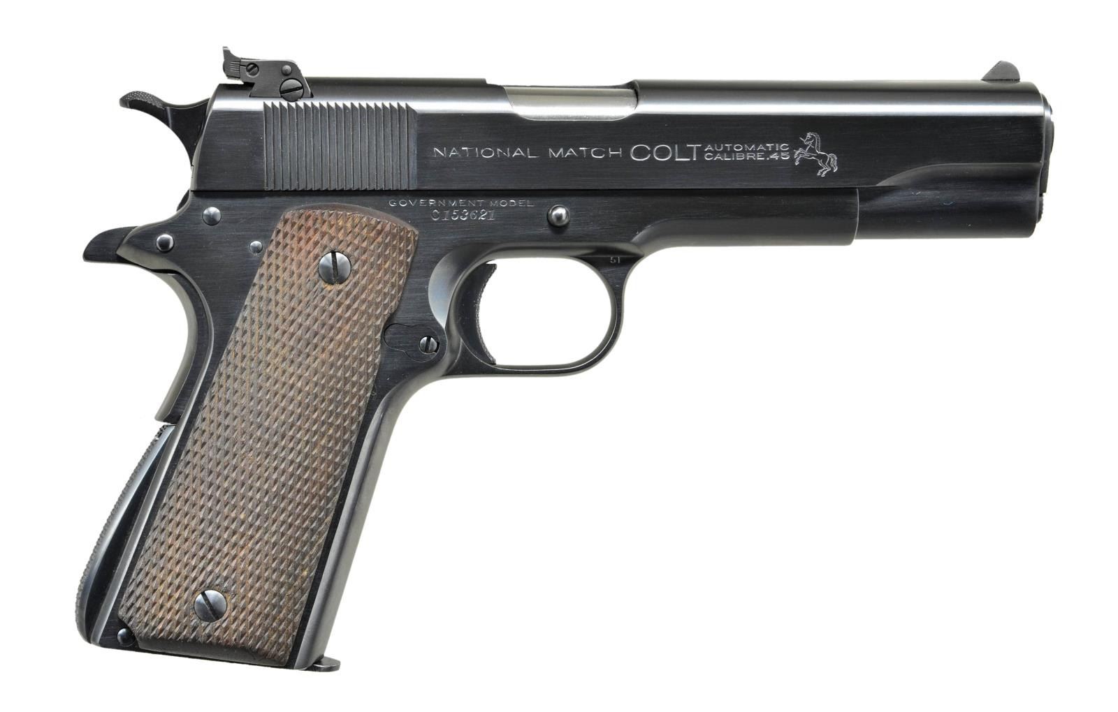 EARLY NATIONAL MATCH SLIDE. Cal. 45 ACP. S# C153621. Bbl. is 5" marked "COLT 45 AUTO / MATCH" above left leg plus circled "MB" on left leg. Shipped November 20, 1928 as 1 of 2 firearms to am Camp Hardware & Iron Company of Indianapolis per August 2012 factory letter listing it as Government Model as on frame; slide has "NATIONAL MATCH" markings. Under firing pin retainer having squared bottom edge is matching slide #. Government Model slide profile w/ taller serrated faced front sight & corresponding Stevens adj. rear. Top of frame by disconnector stamped "S". Fully checkered walnut grips. Left front of trigger guard has VP proof & "1". Opposite side has "51". Slide stop & safety tab are both checkered w/out undercuts. Checkered arched mainspring housing w/out lanyard provision. Noticeably tight & smooth slide to frame fit. Front edge of spring guide rounded more than on Government Models plus hand tuned light target trigger pull utilizing short milled trigger w/ checkered face. First National Match produced February 1932; most likely this slide fitted by Colt to a customer's earlier frame. Of all early National Match Colts only about 1/3 had adj. sights. MAGS: 1 very good to excellent 7 rd. w/ "COLT / 45 AUTO." on base. Spots of peppery oxidation at base of spine & rear of floorplate. UNATTACHED ACCESSORIES: factory letter as referenced above. CONDITION: near excellent in all respects including grips & bore. (22-3116/NW). CURIO. $1,000-1,500.