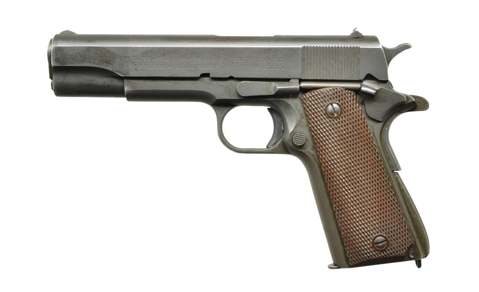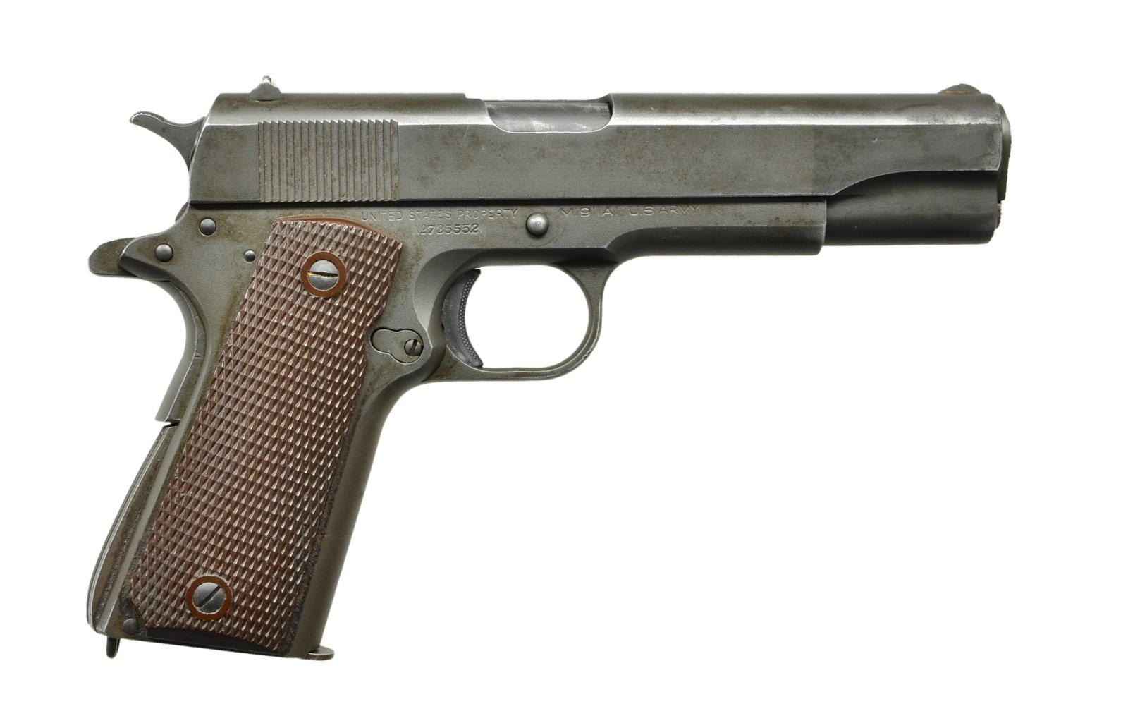 Cal. 45 ACP. S# 735552. Bbl. 5” Springfield type 13 pre-WWII field replacement marked “S P” on left leg. Mfg. 1941 as part of Army contract; 34,756 units. Correct markings throughout yet slide is unnumbered; started at 710001 to approx. 1140000. Left front of trigger guard has VP proof & “T”; right side numbered "60". Top of frame by disconnector has “G” & boxed “R.S.” (also by slide lock). Keyes Fibre large ring plastic grips. Square notch rear sight. Wide ramped serrated blade front sight. Type 5 arched mainspring housing w/ 8 ribs & lanyard loop. Checkered slide lock & safety; both w/ out undercuts. Finish appears reparkerized yet no arsenal rework marks. MAGS. 2 fair 7-round w/ light to medium oxidation; unmarked & General Shaver. UNATTACHED ACCESSORIES: Sears 1942 brown leather US holster in generally good condition showing wear & flap having crazed appearance. CONDITION: very good overall appearance as refinished having high point holster like wear plus from functioning. Slide has traces of prior pitting; mostly top right front. Noticeable bbl. function wear at ejection port. Extractor proud of slide; likely replacement. Very good grips w/ slight hand wear. Very good bright bore w/ slight fouling in corners of grooves.(23-439/NW). $1,000-1,500.